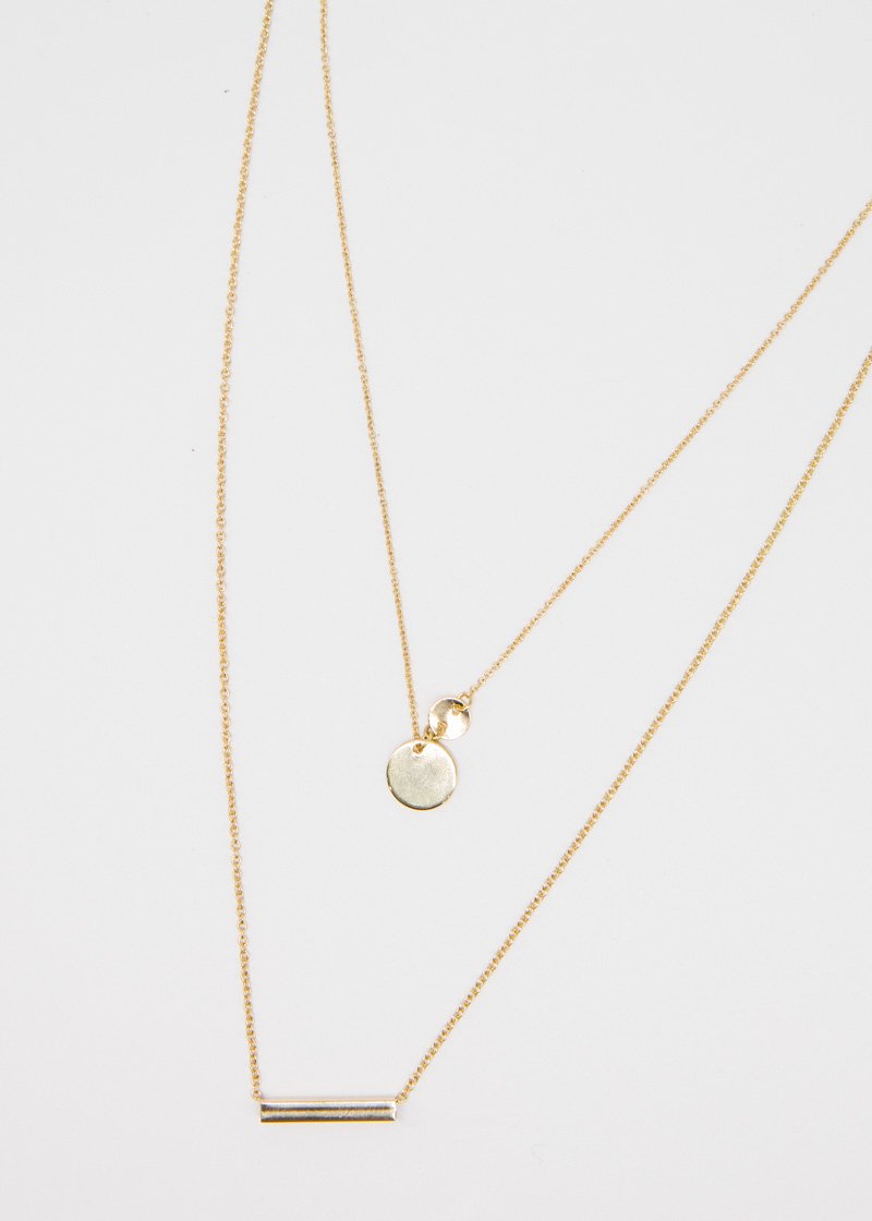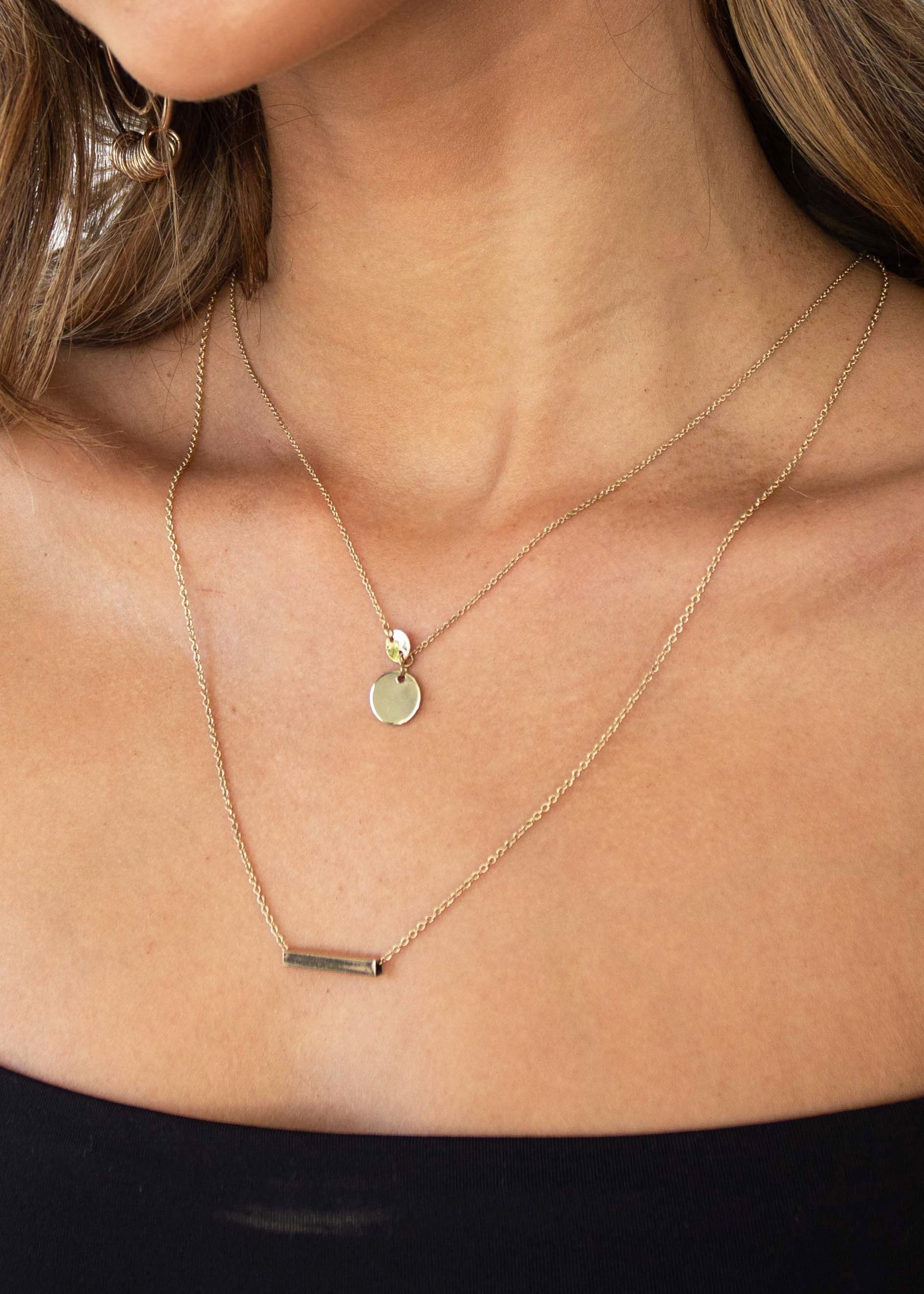 The Oxford Necklace features two layers of fine chain with two flat disks and a bar pendant.