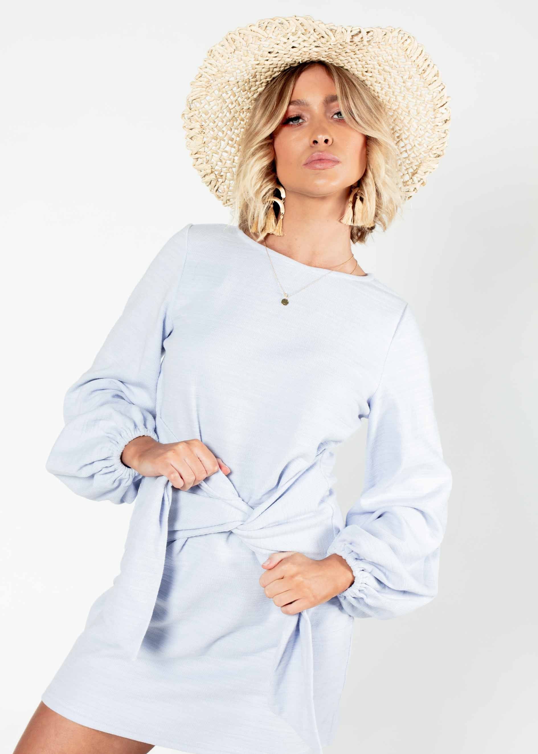Cute Winter dress in a stretch knit fabric. Featuring page boy sleeves we love and tie at waist. Also available in wine.