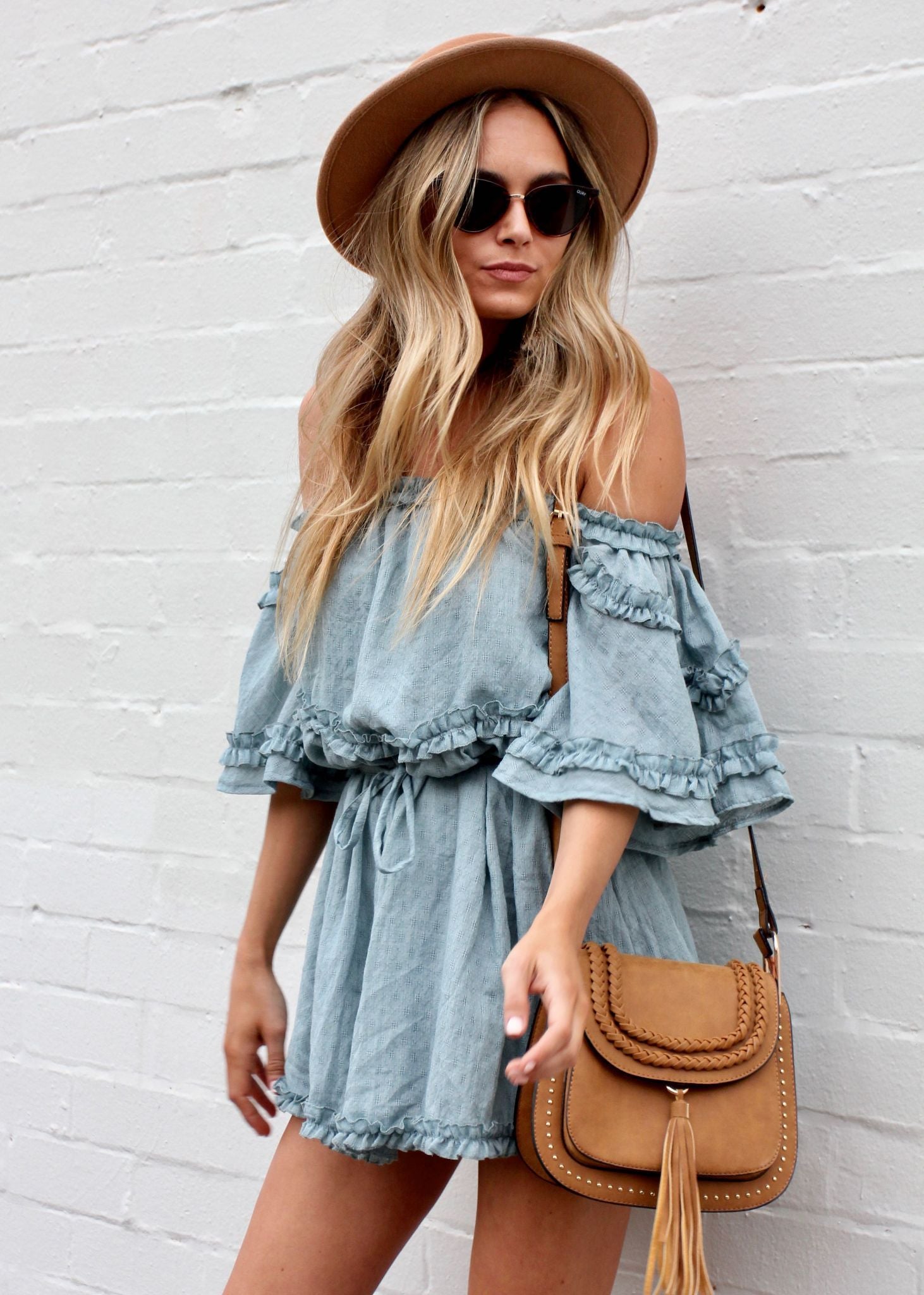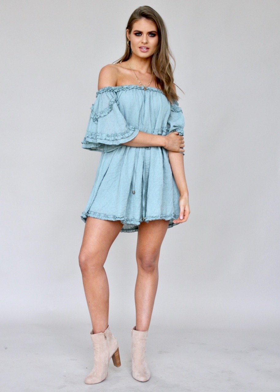 This flirty off shoulder dress is so cute. A line shape with optional tie at waist. Cute frill detail on sleeve, neckline and waist.