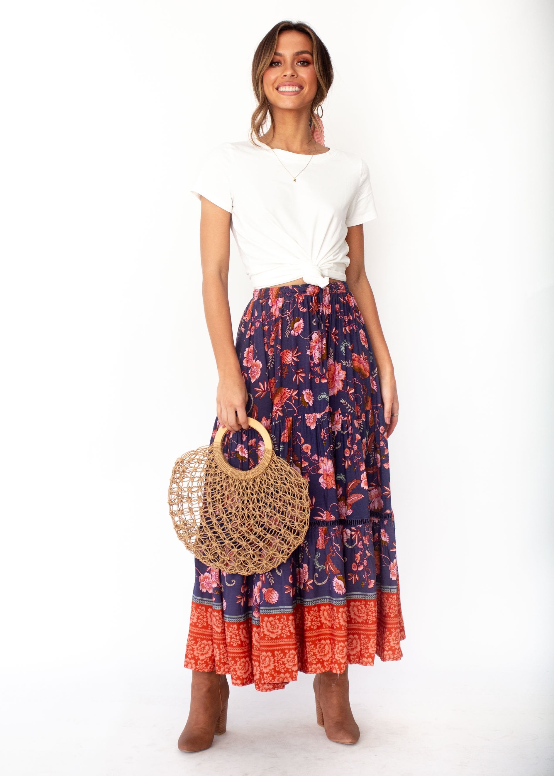 The perfect skirt! Flaunt this gorgeous navy/blush floral print maxi all season long and look and feel fab.