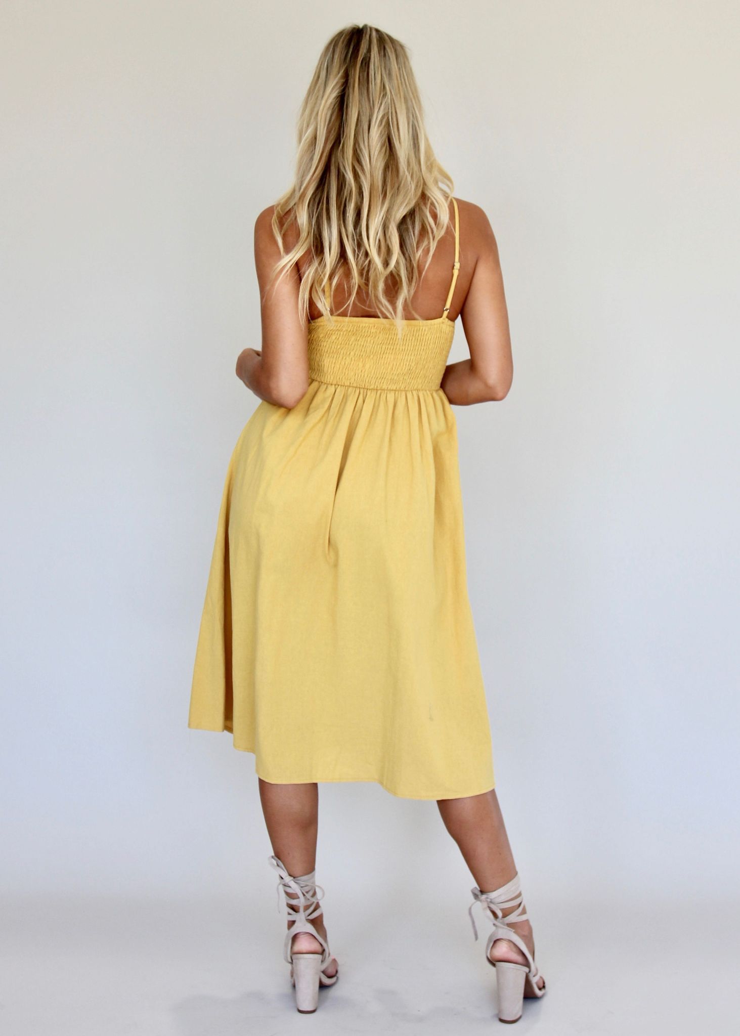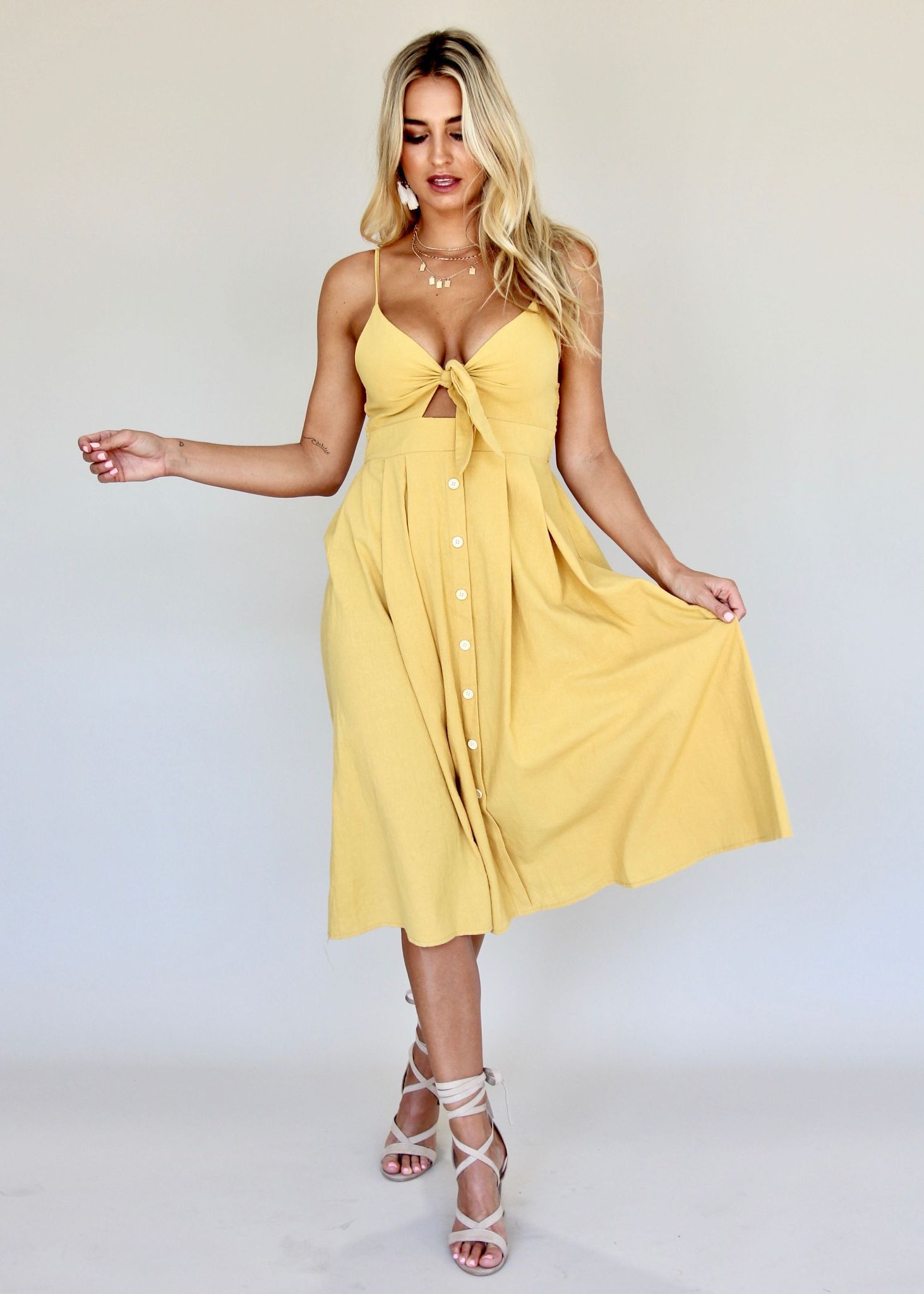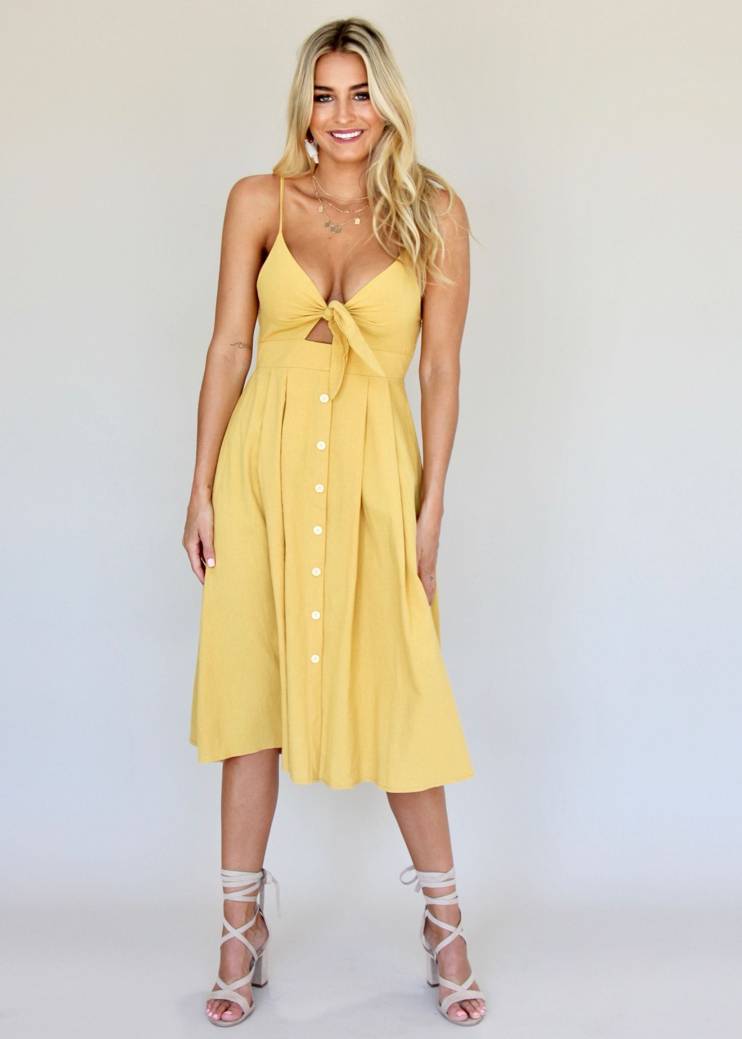 An easy to wear and super cute navy midi dress with front tie detailing!