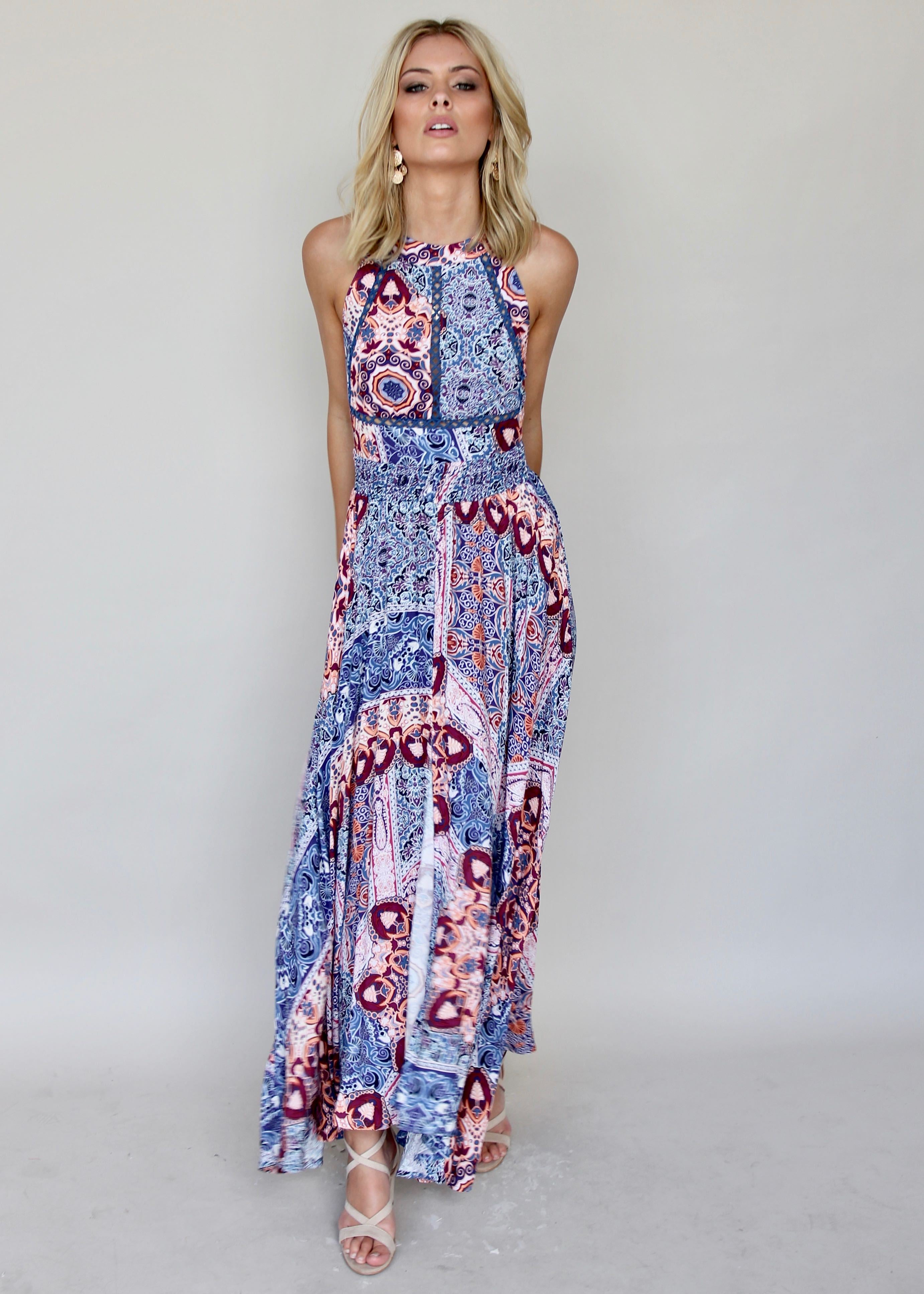 This gorgeous Break of Dawn Maxi Dress features amazing high neckline with button closure, and low back with tie.