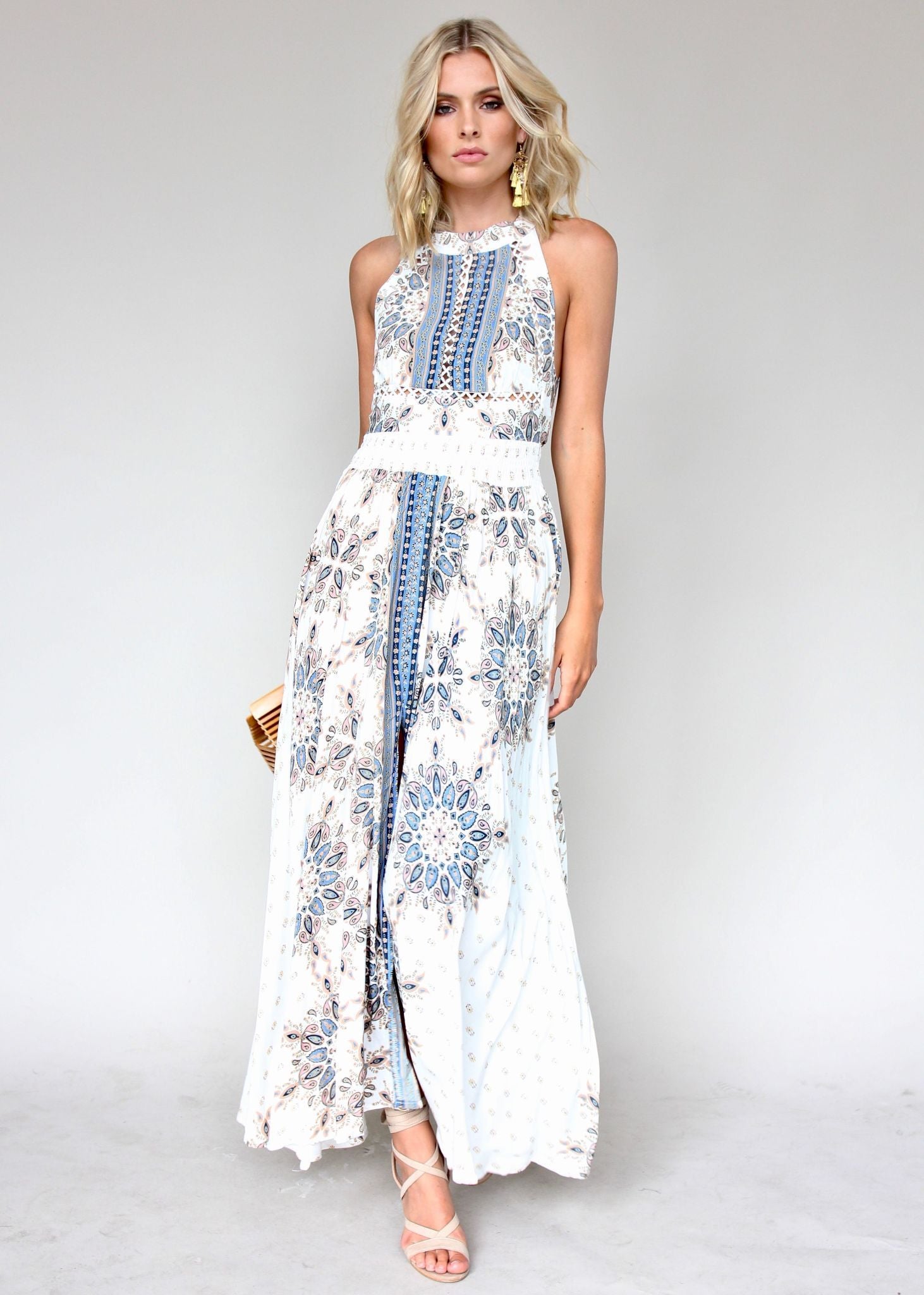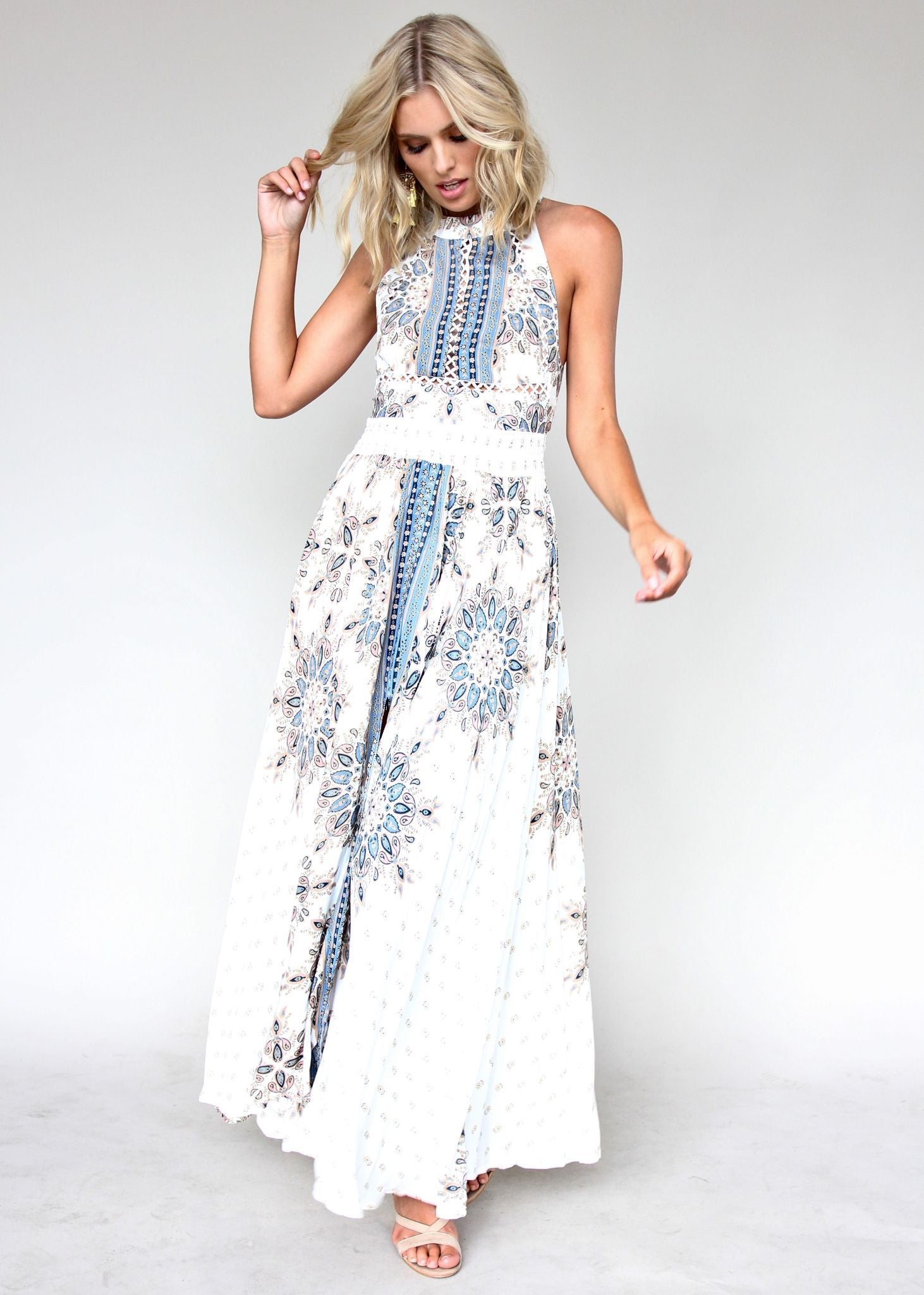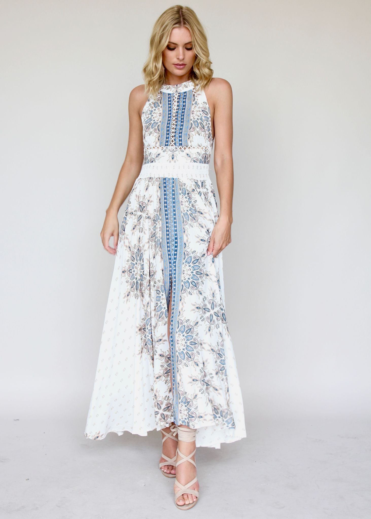 This gorgeous Break of Dawn Maxi Dress features amazing high neckline with button closure, and low back with tie.