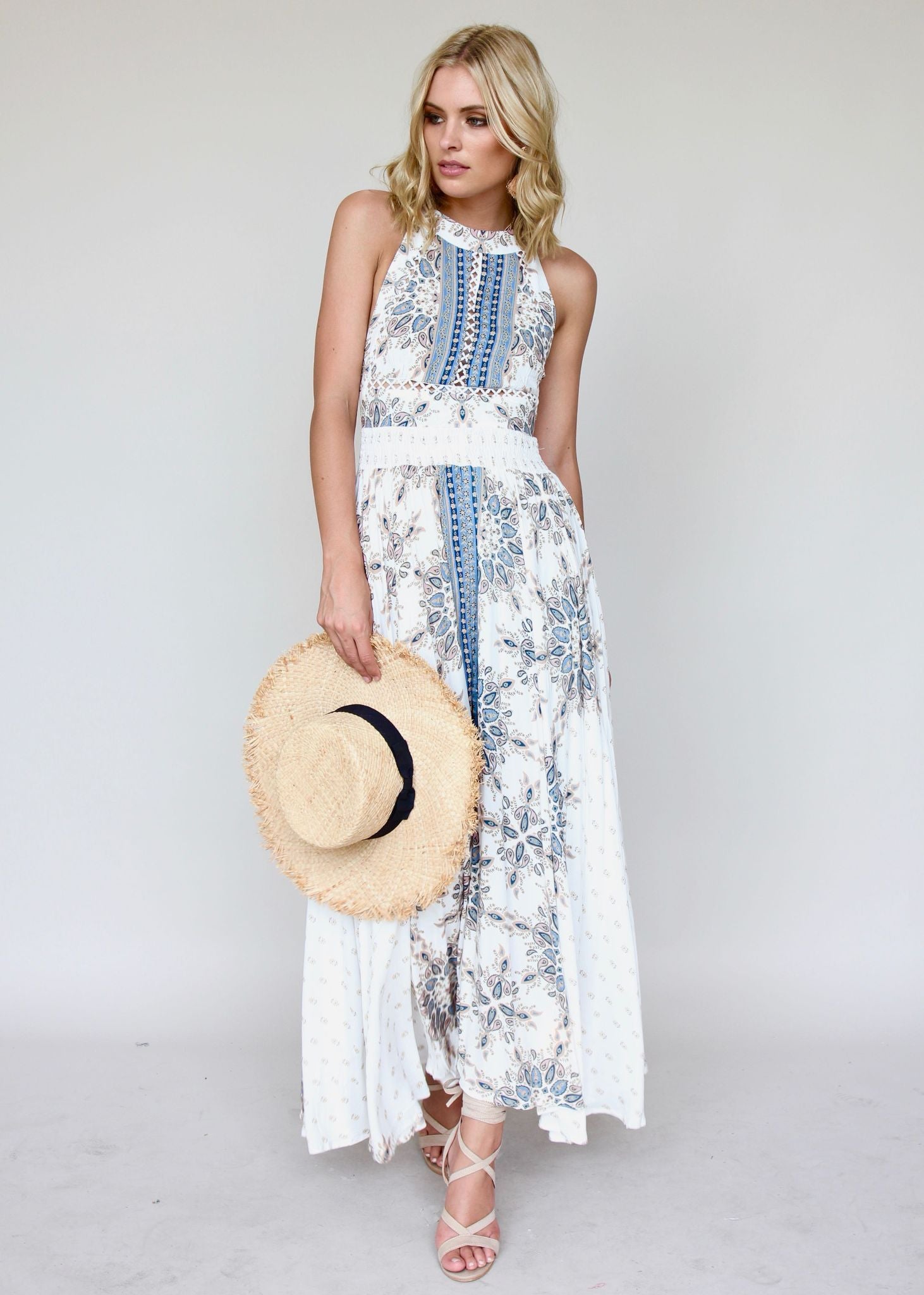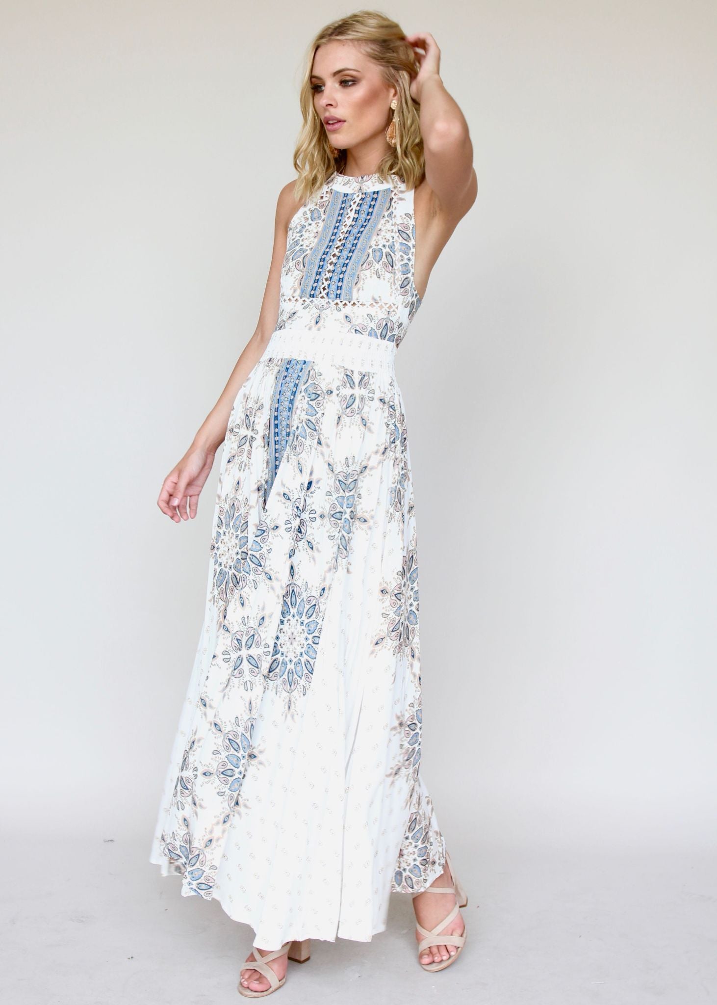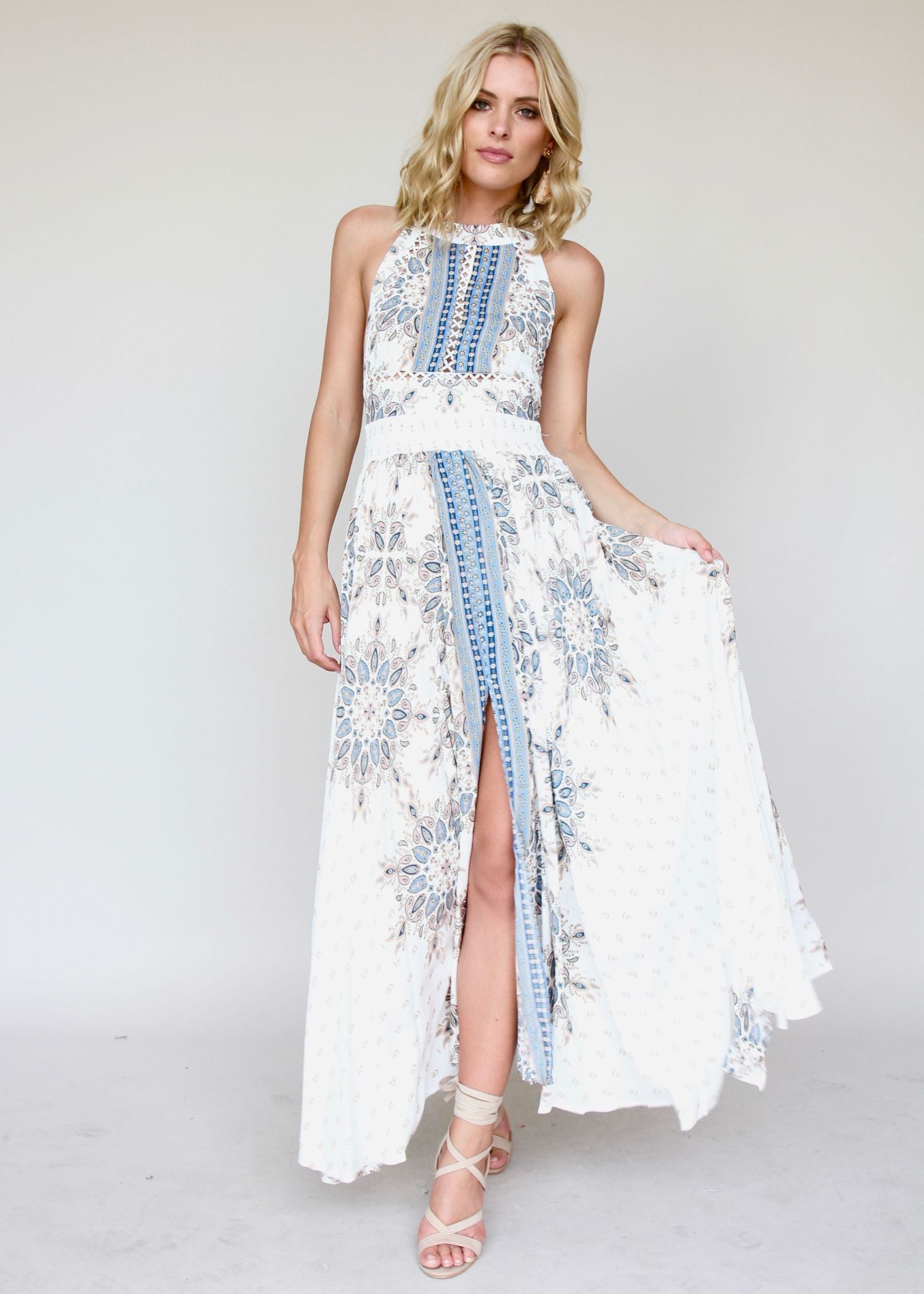 This gorgeous Break of Dawn Maxi Dress features amazing high neckline with button closure, and low back with tie.