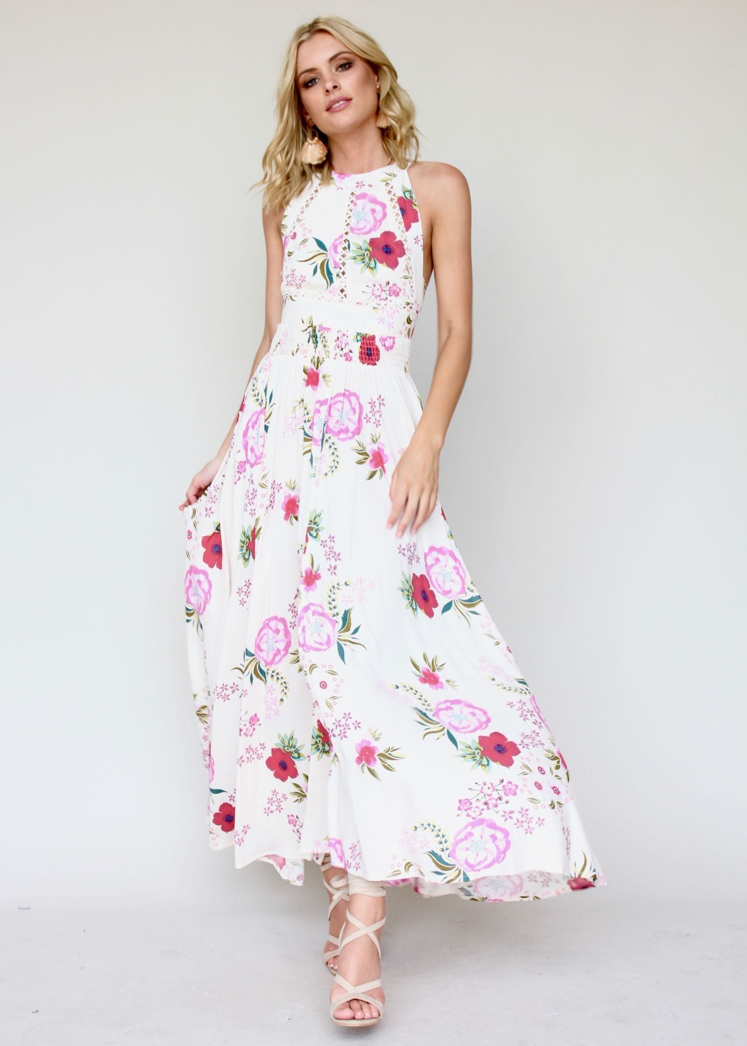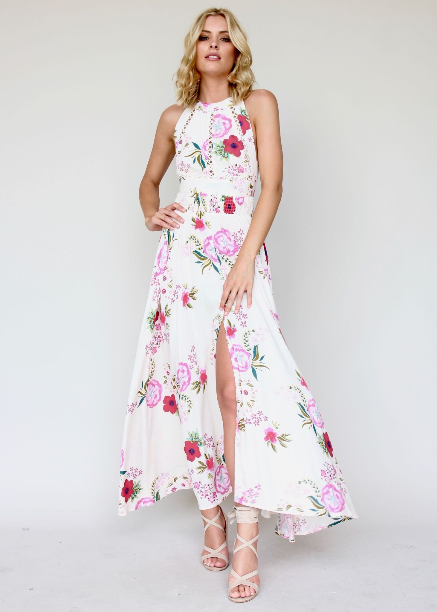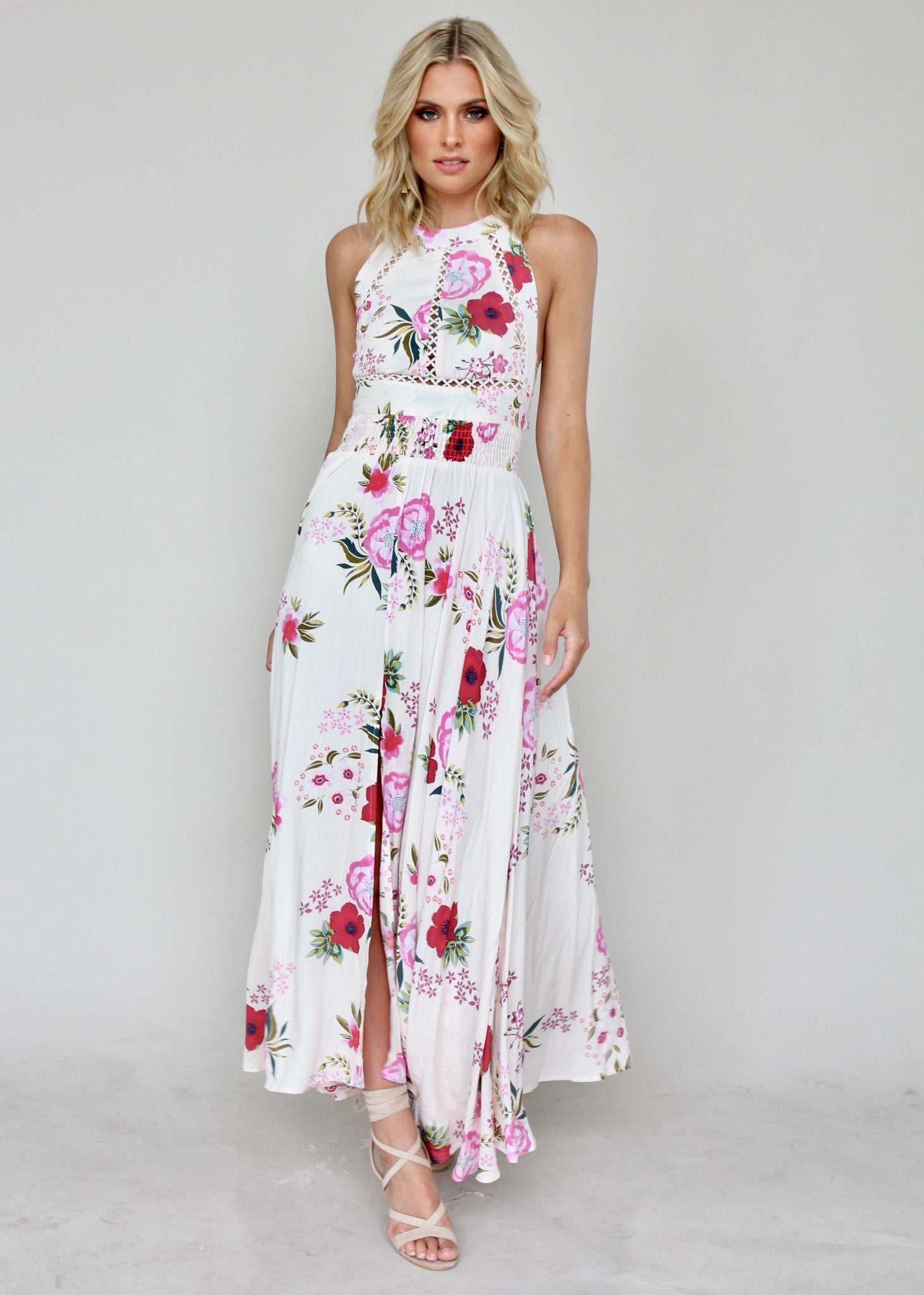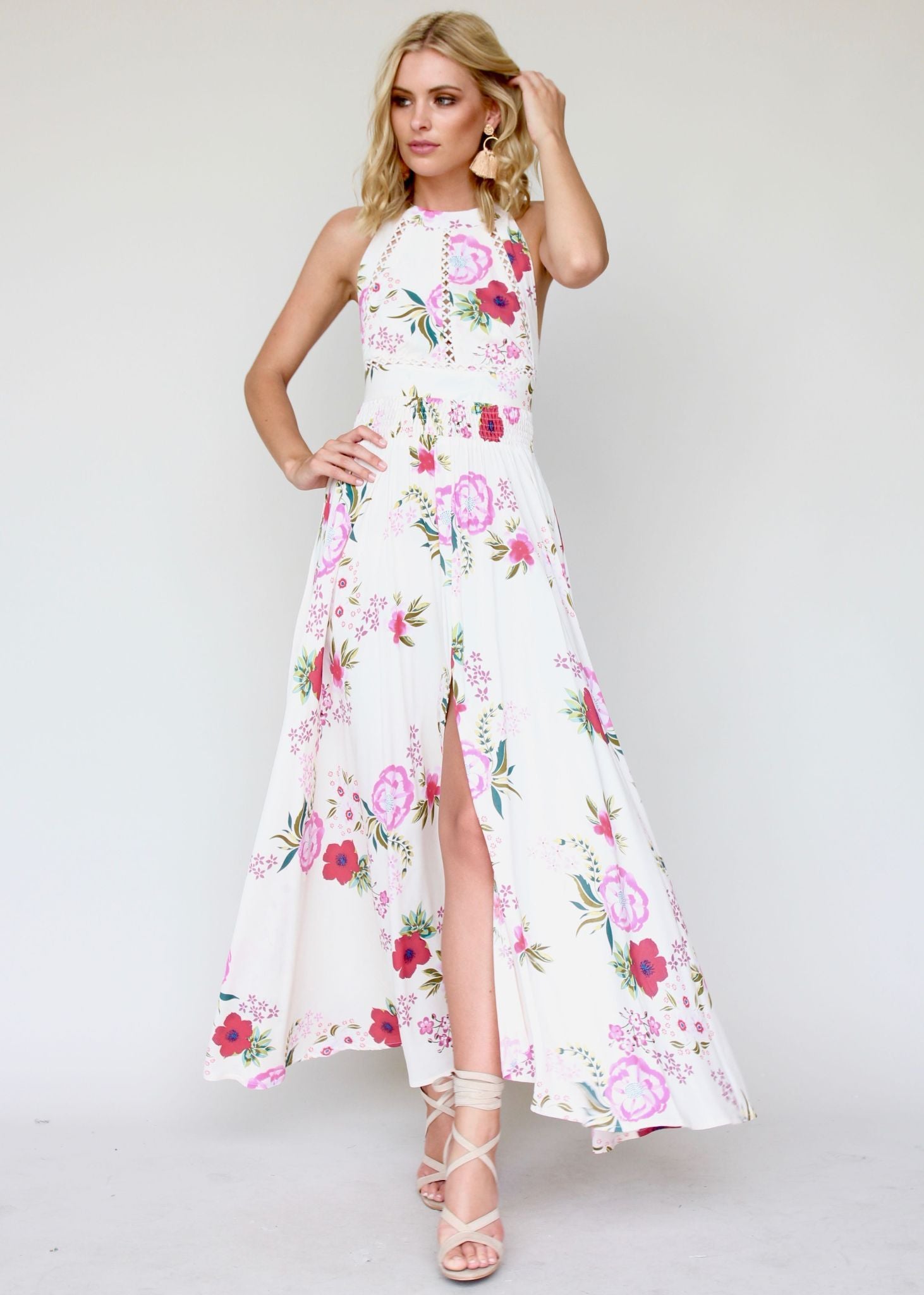 This gorgeous Break of Dawn Maxi Dress features amazing high neckline with button closure, and low back with tie.
