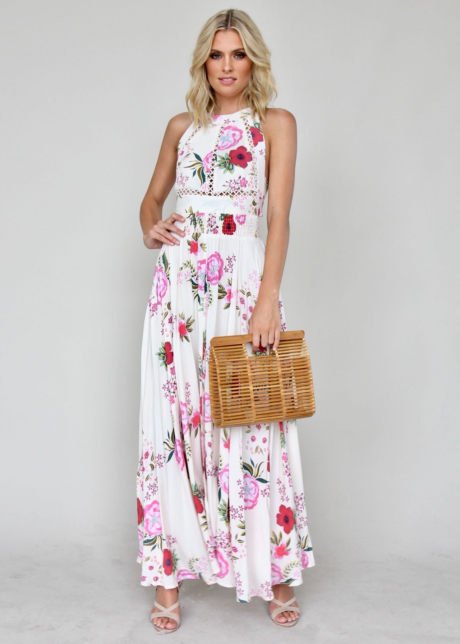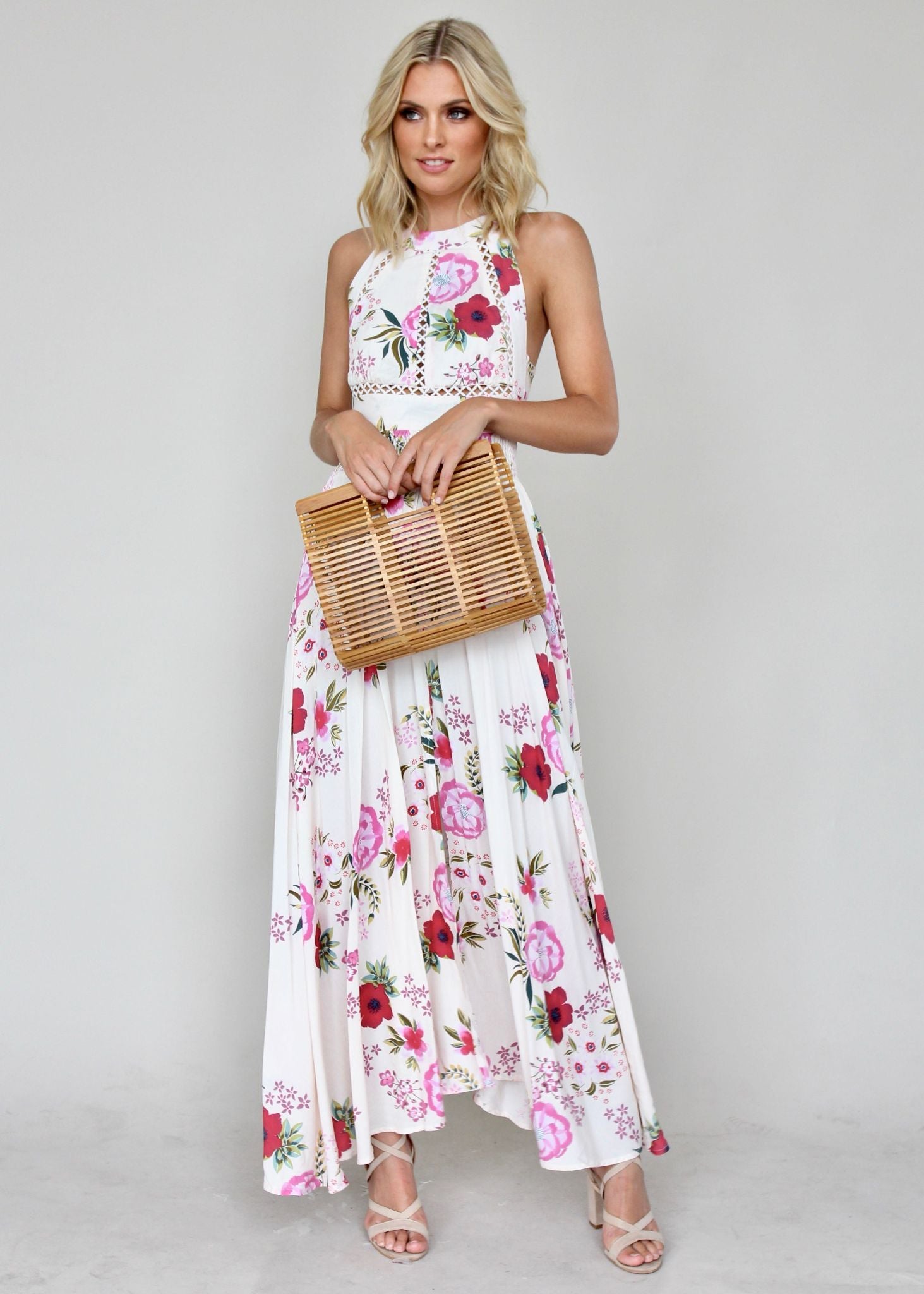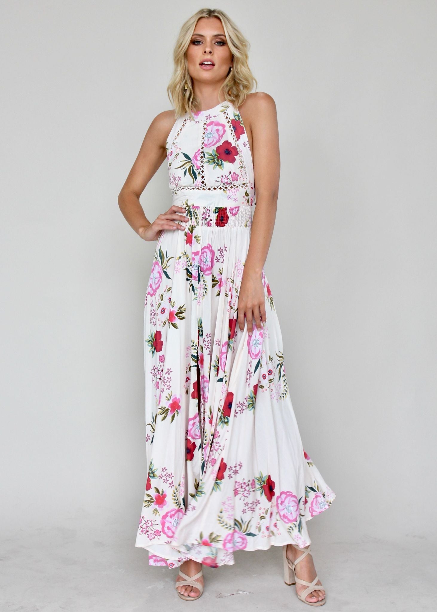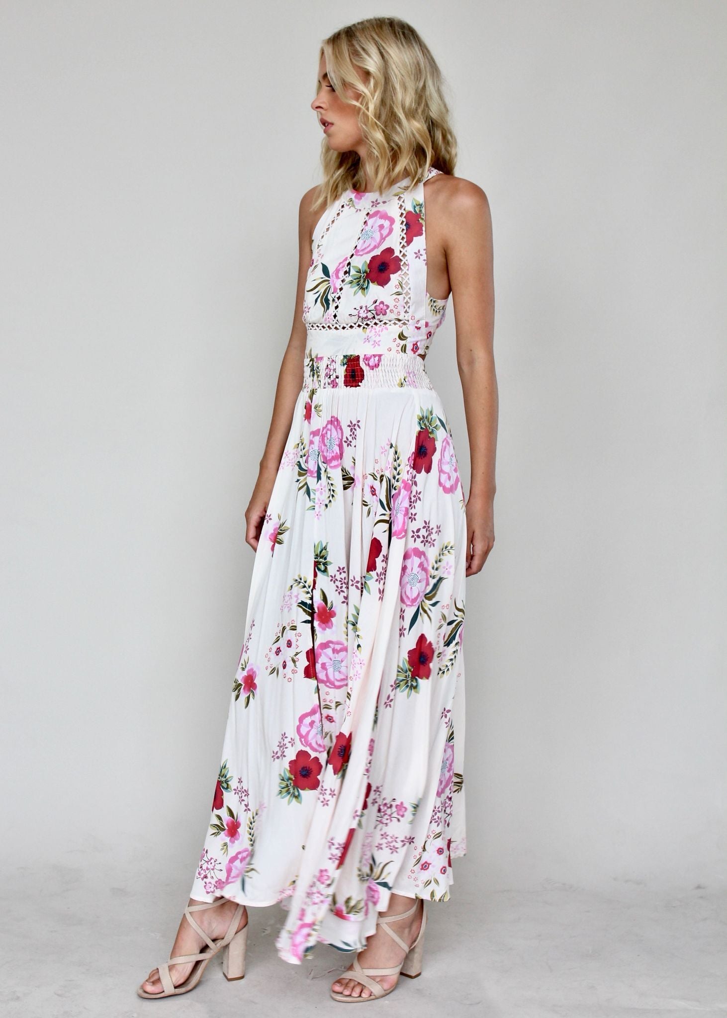 This gorgeous Break of Dawn Maxi Dress features amazing high neckline with button closure, and low back with tie.