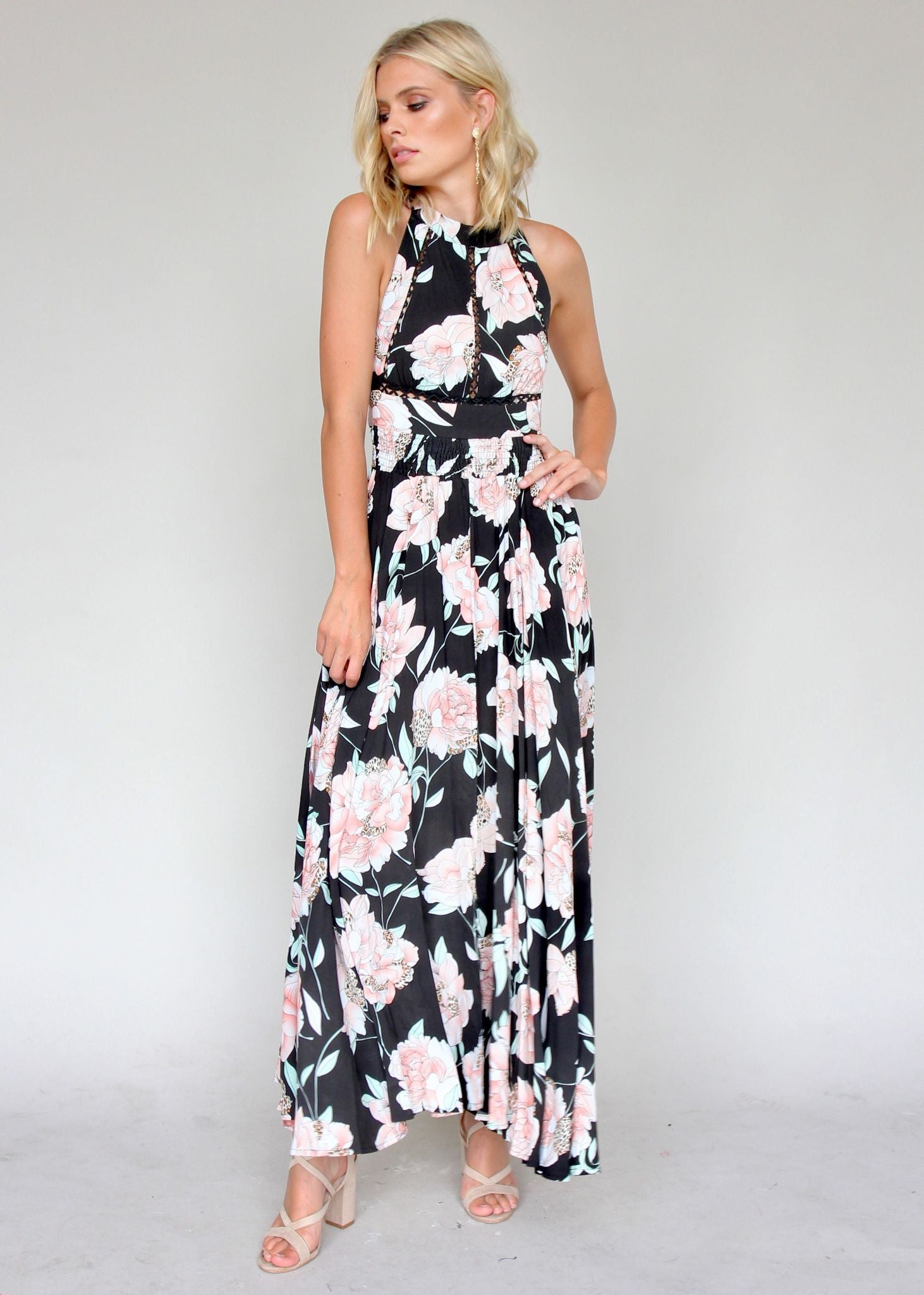 This gorgeous Break of Dawn Maxi Dress features amazing high neckline with button closure, and low back with tie.