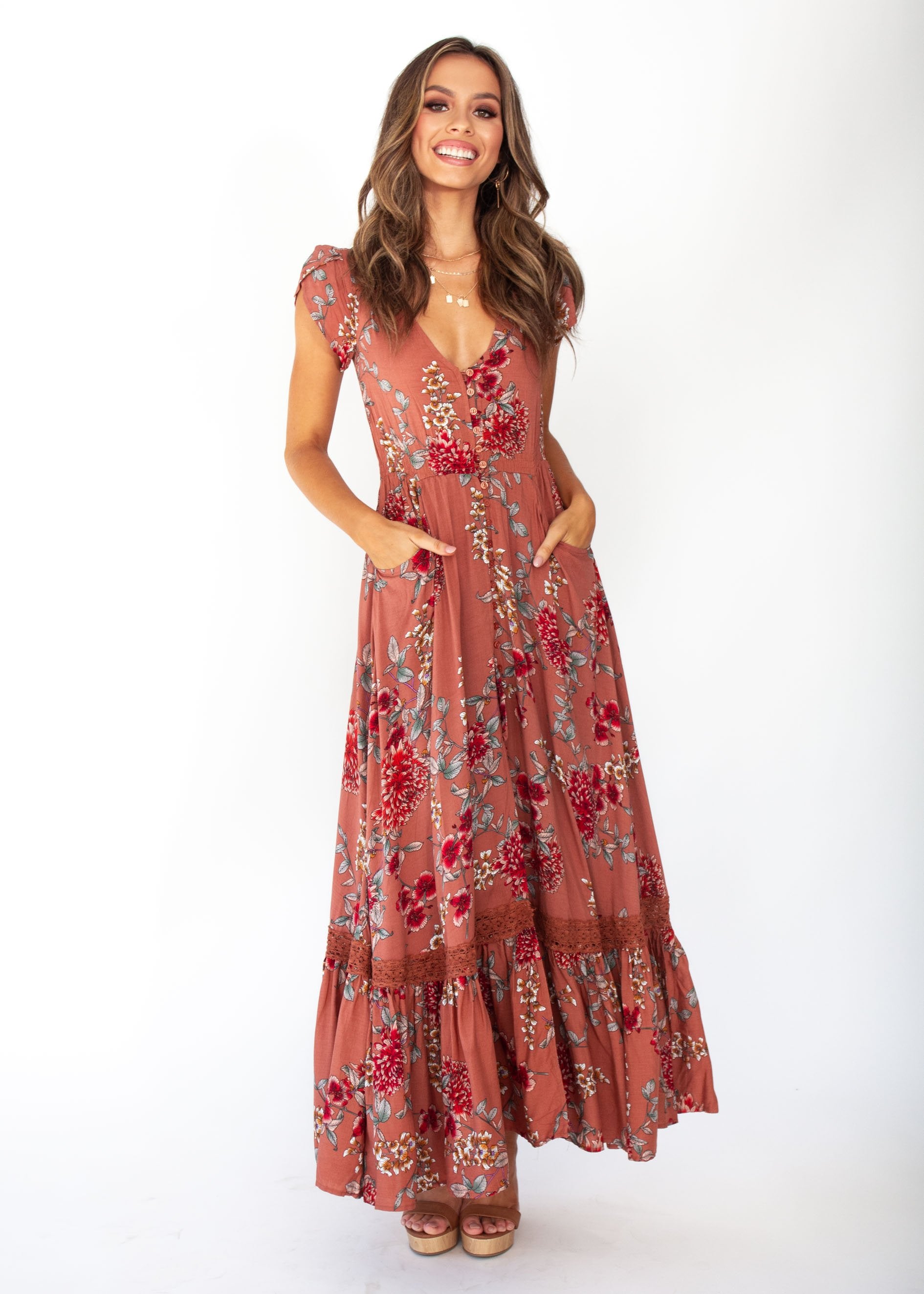 The perfect boho maxi dress has just landed! This gorgeous maxi in our new Dulcie rust floral print is so versatile, our lovely ladies can never get enough of this style. Perfect for even those breastfeeding moments with its simple button front closure.
