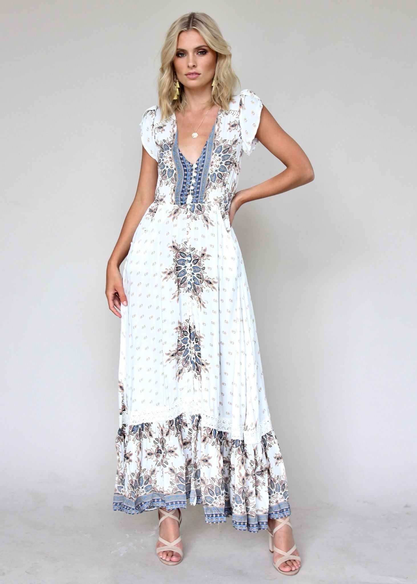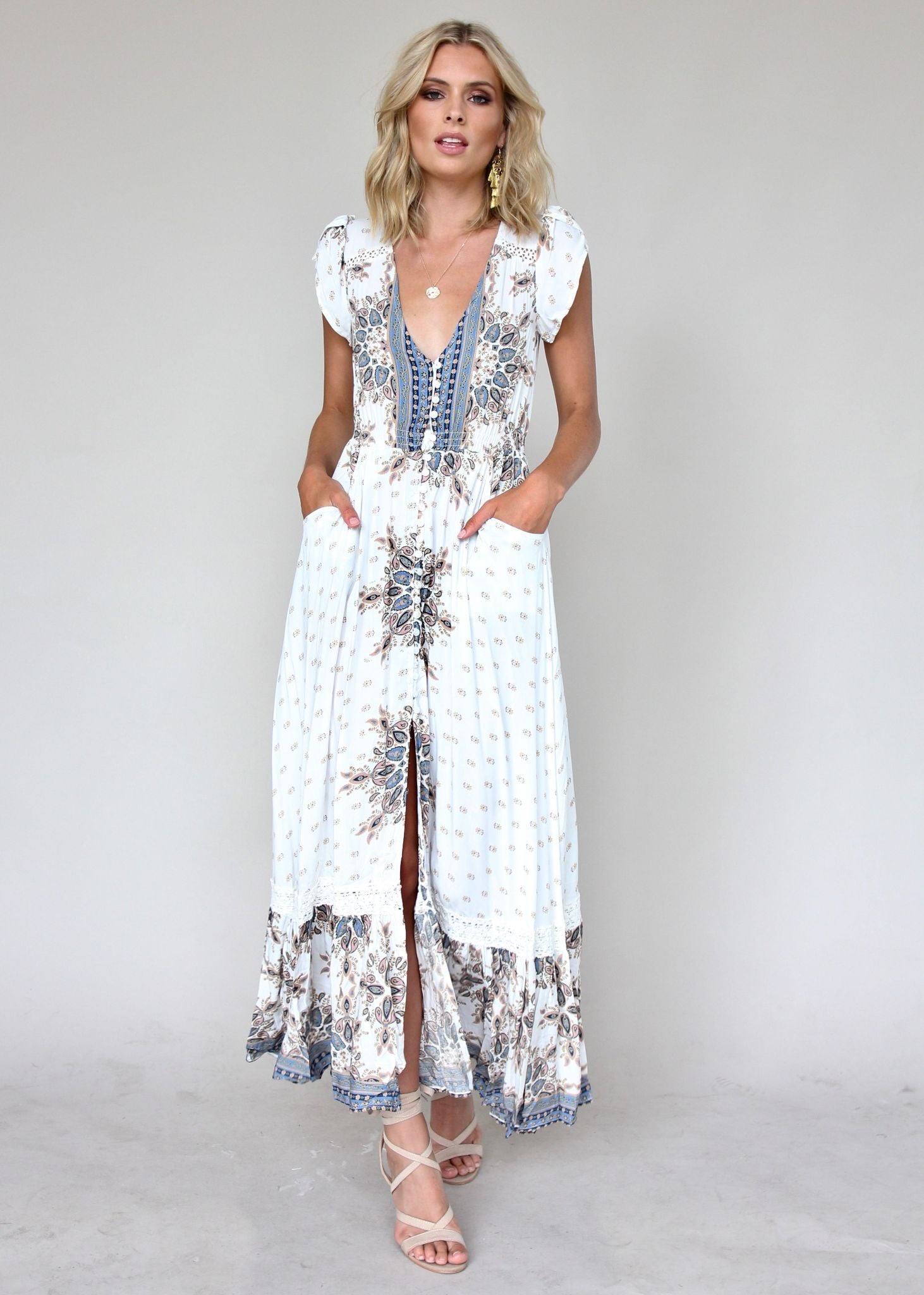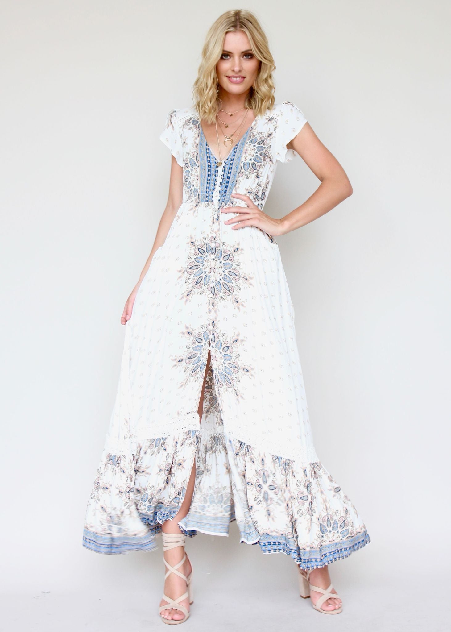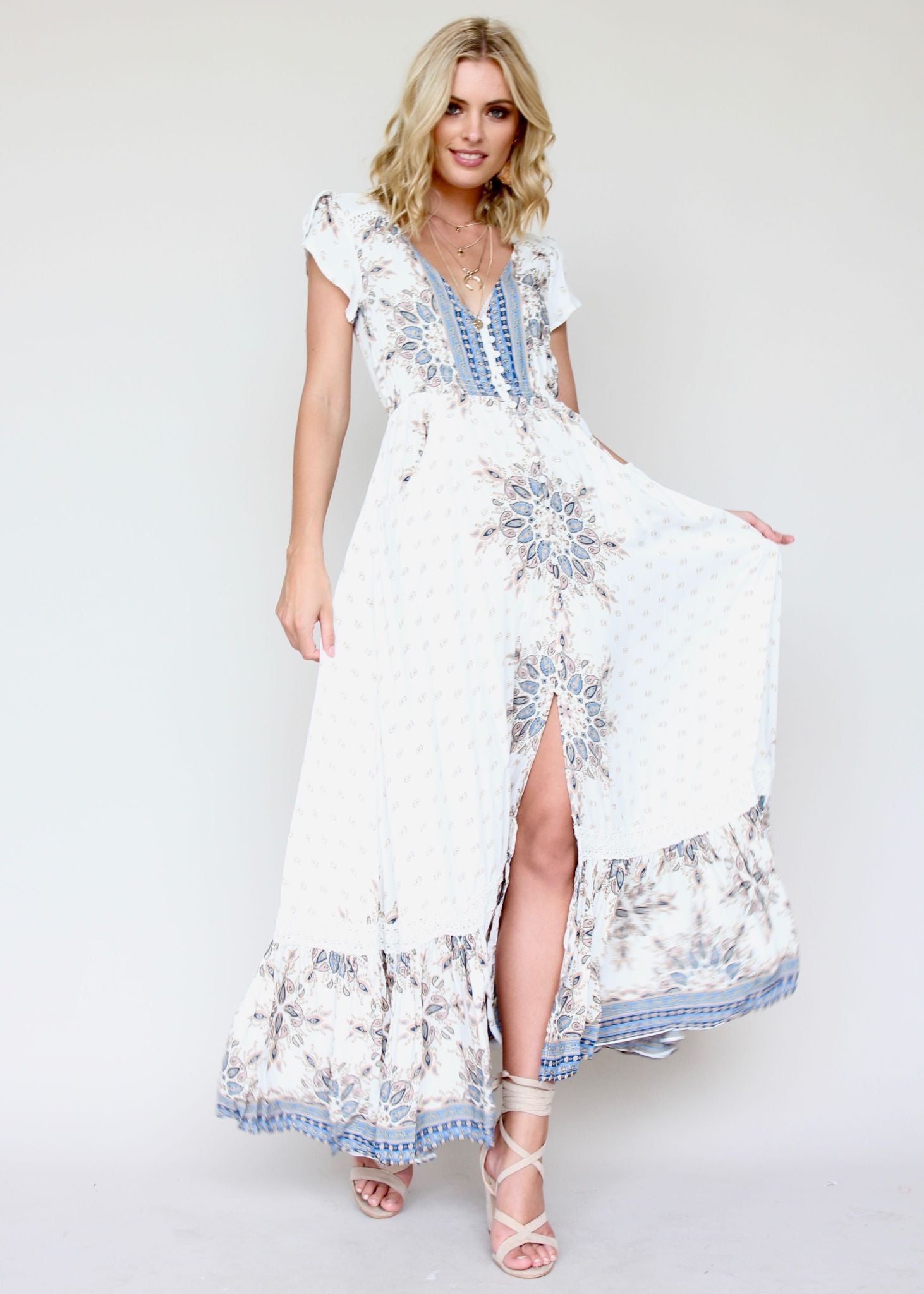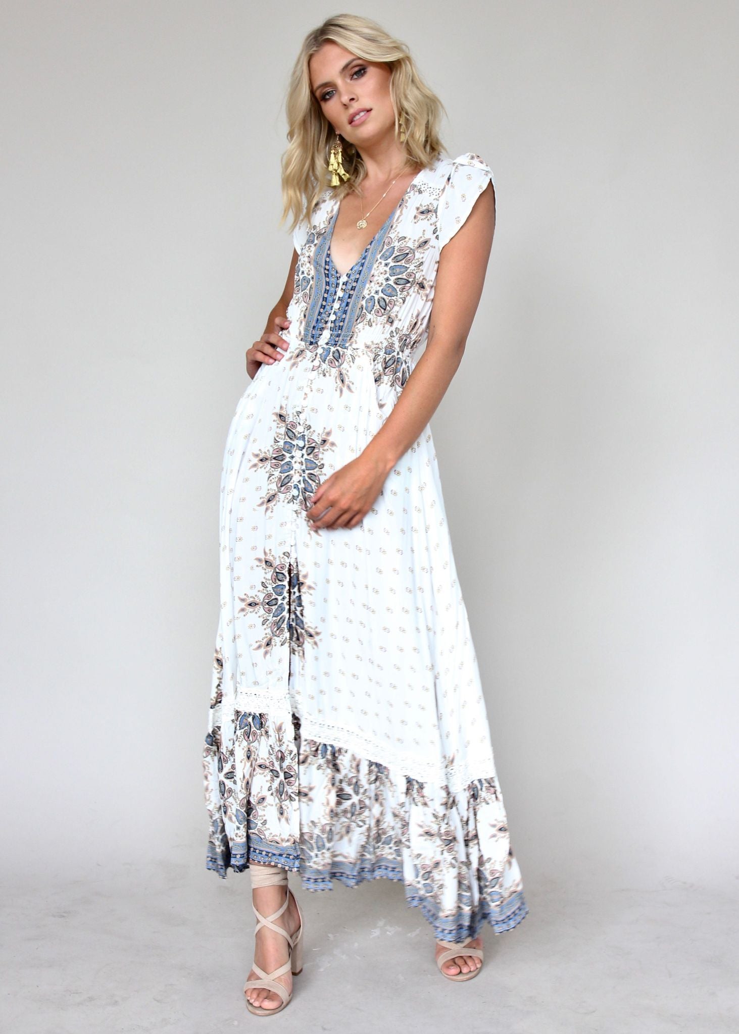 Beautiful Maxi dress with cute cap sleeves features buttons to waist. In a gorgeous blue print, this is the perfect dress for the season!