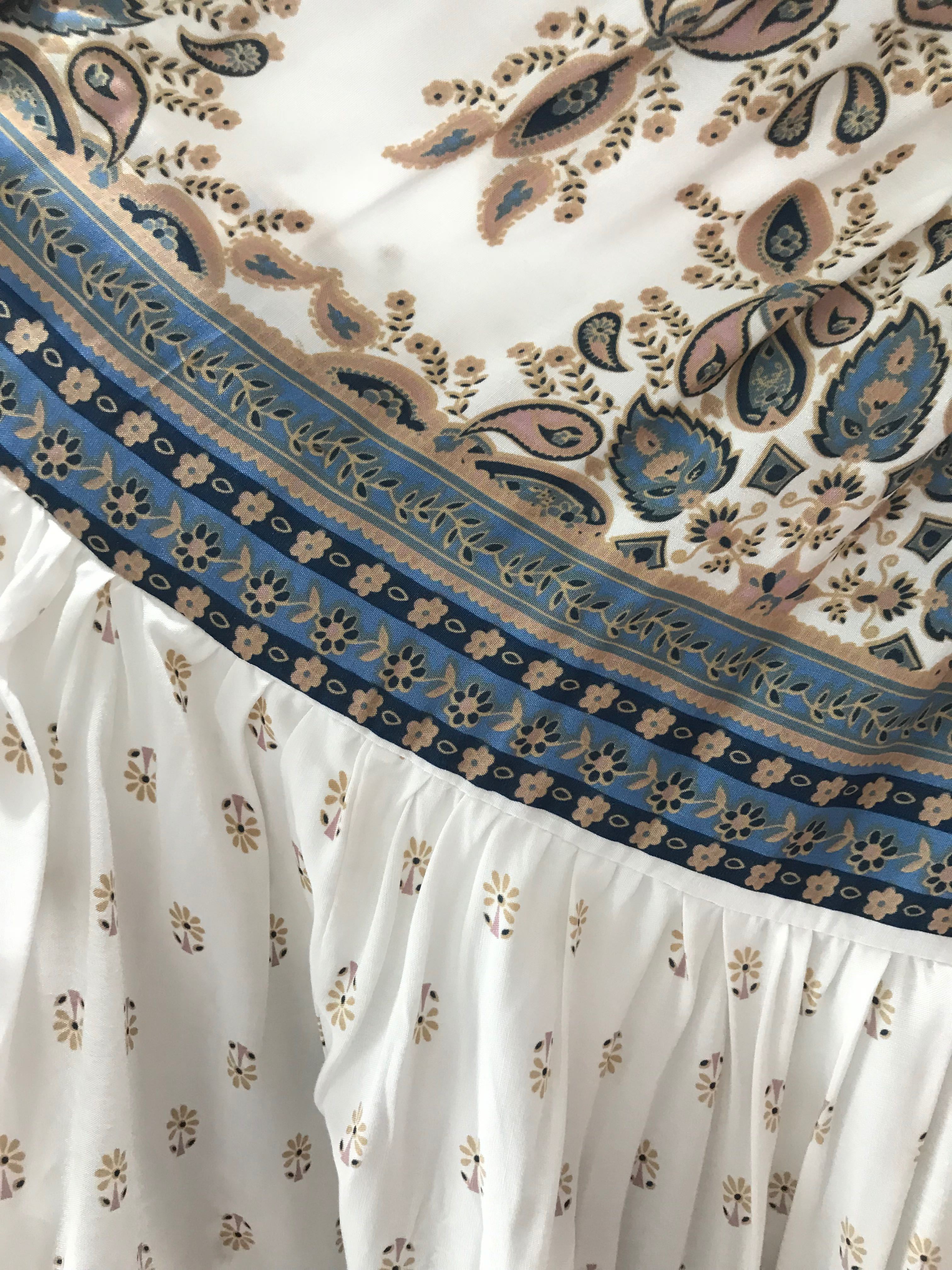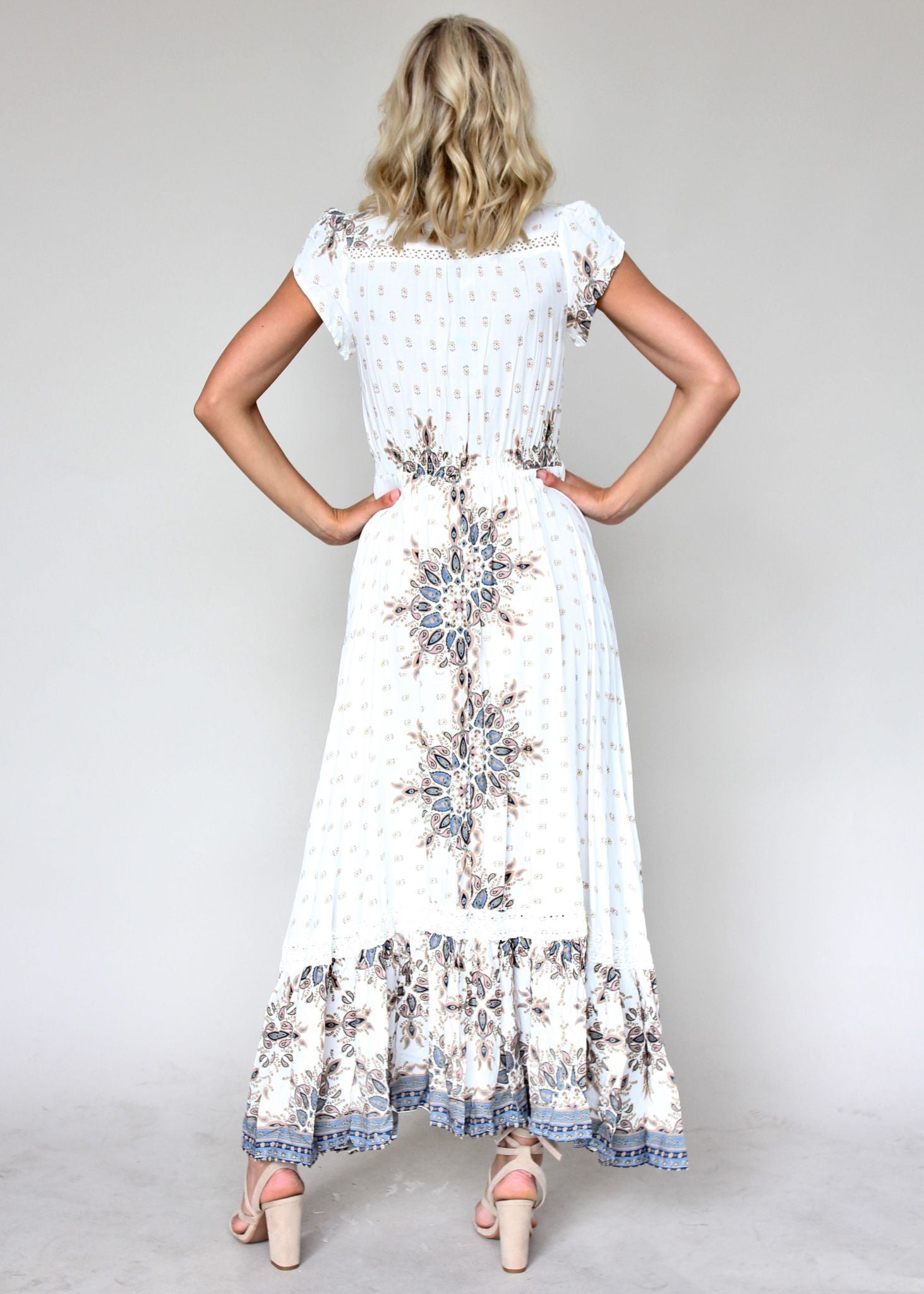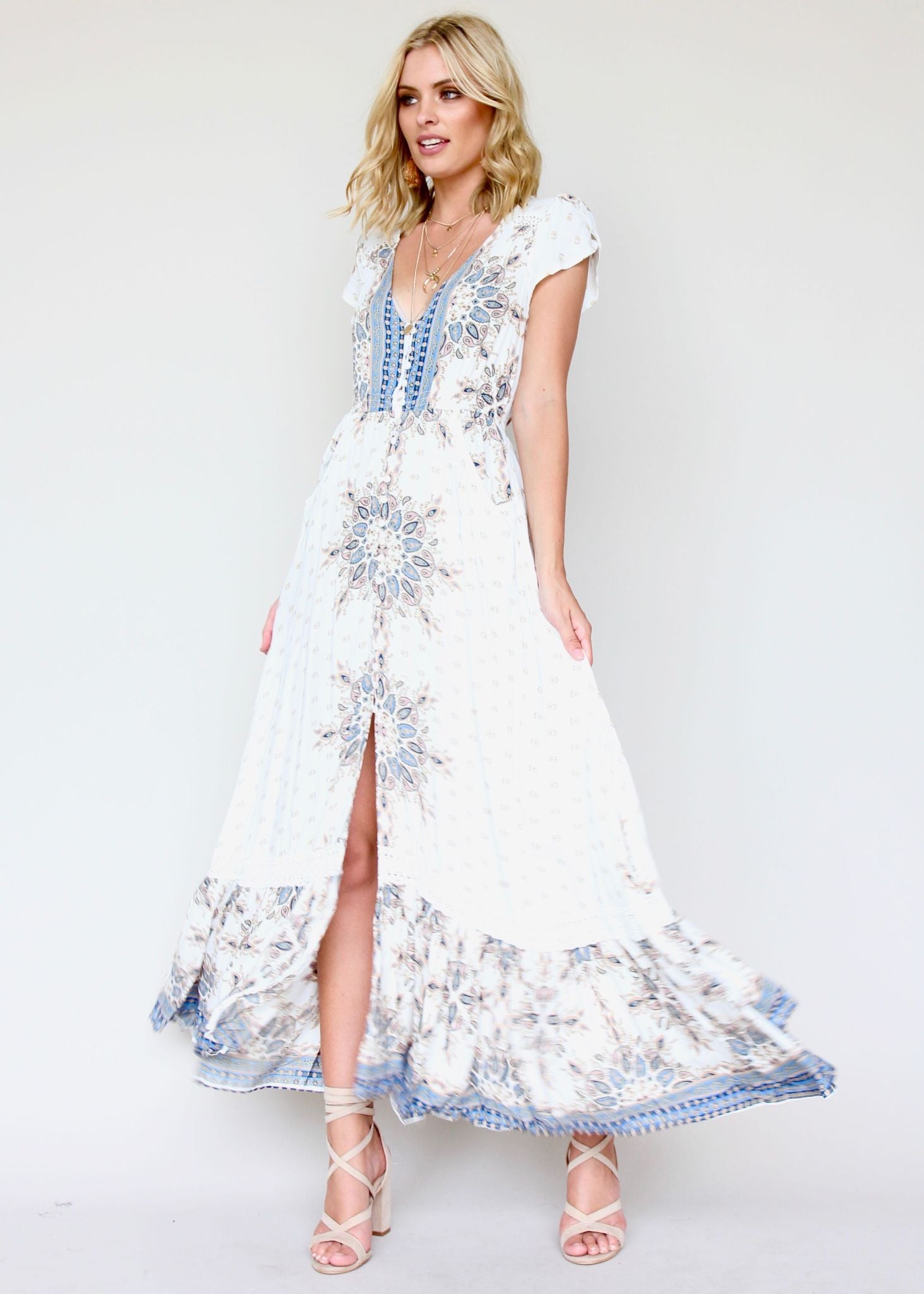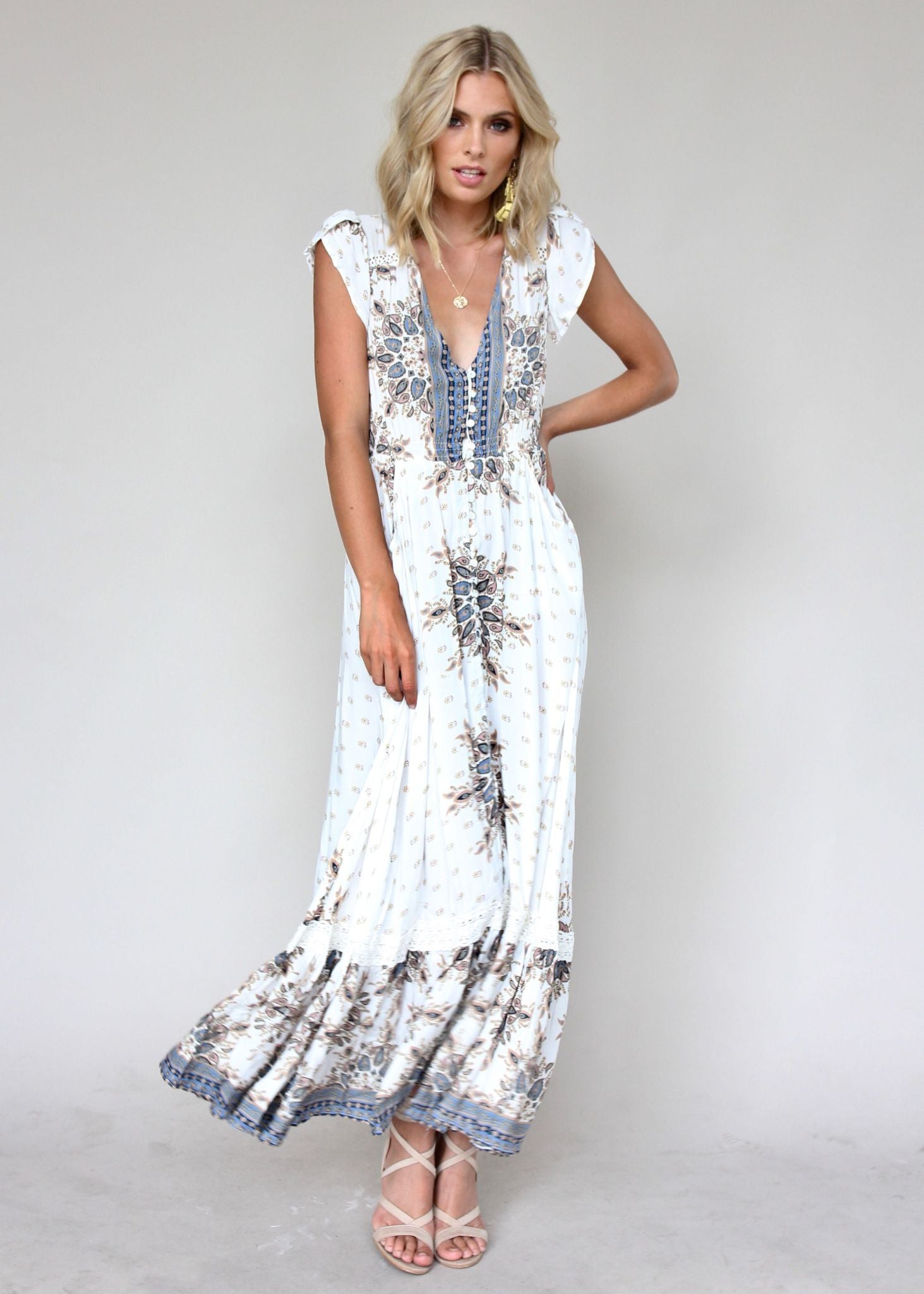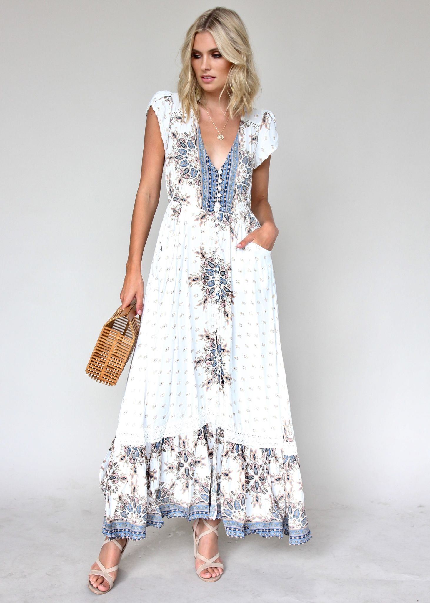 Beautiful Maxi dress with cute cap sleeves features buttons to waist. In a gorgeous blue print, this is the perfect dress for the season!