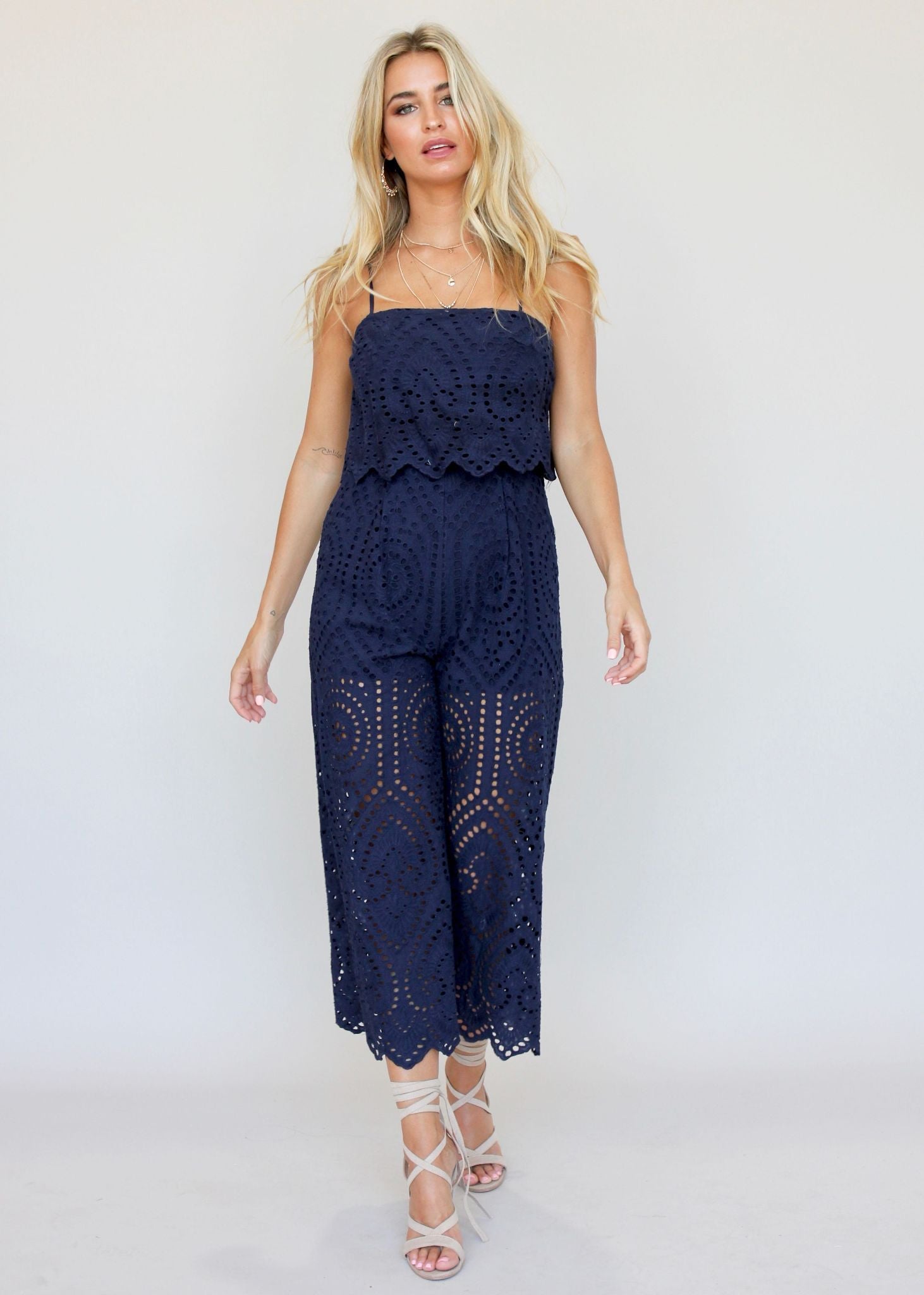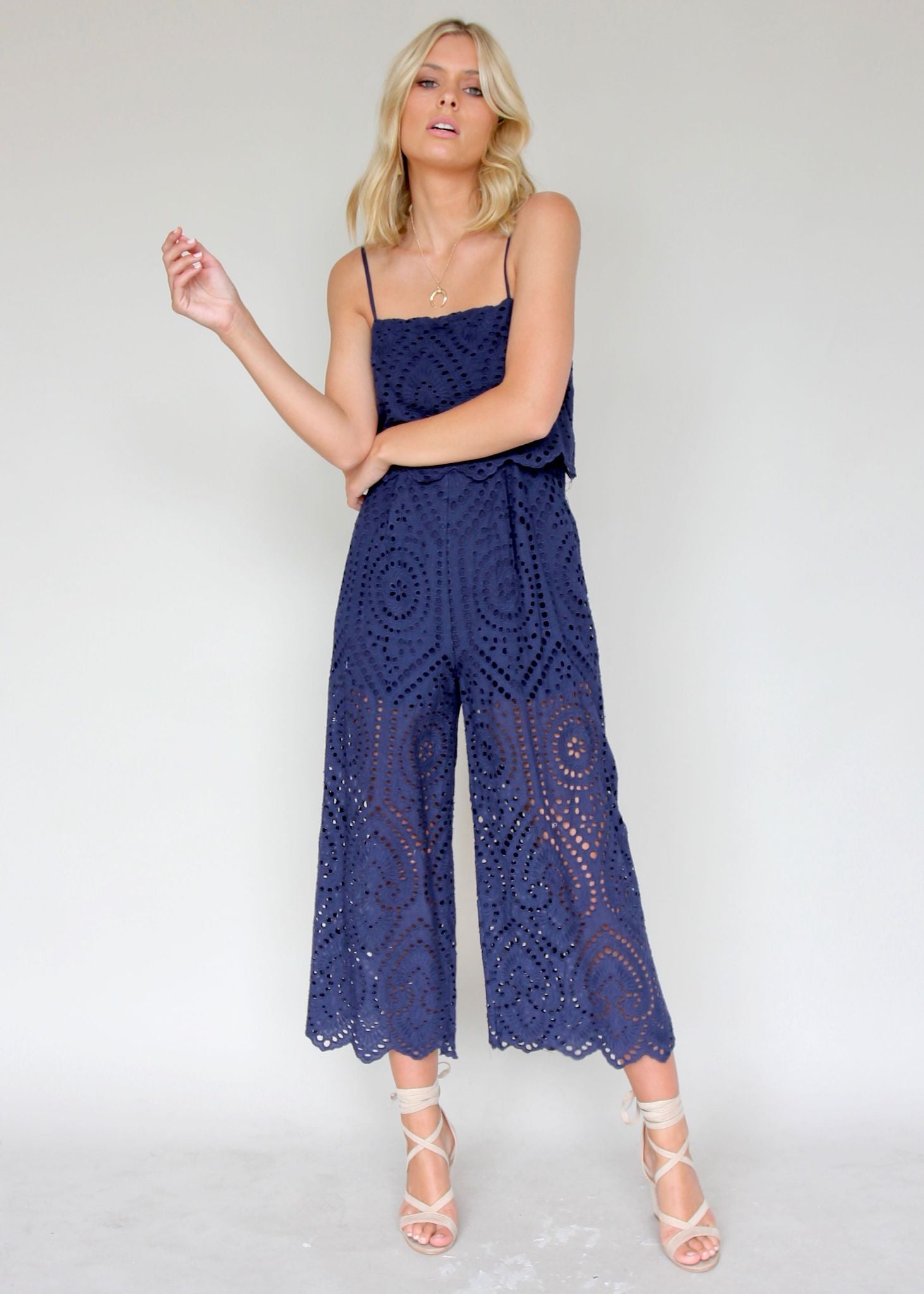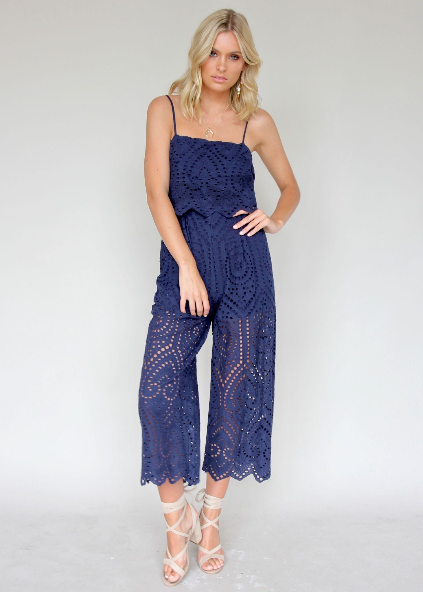 Simple and sophisticated, a gorgeous and delicate eyelet detailed pantsuit! Perfect as festive season nears, this is a great piece to dress up or down.