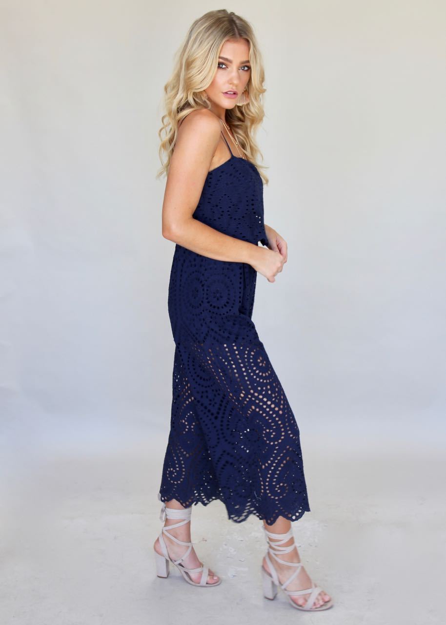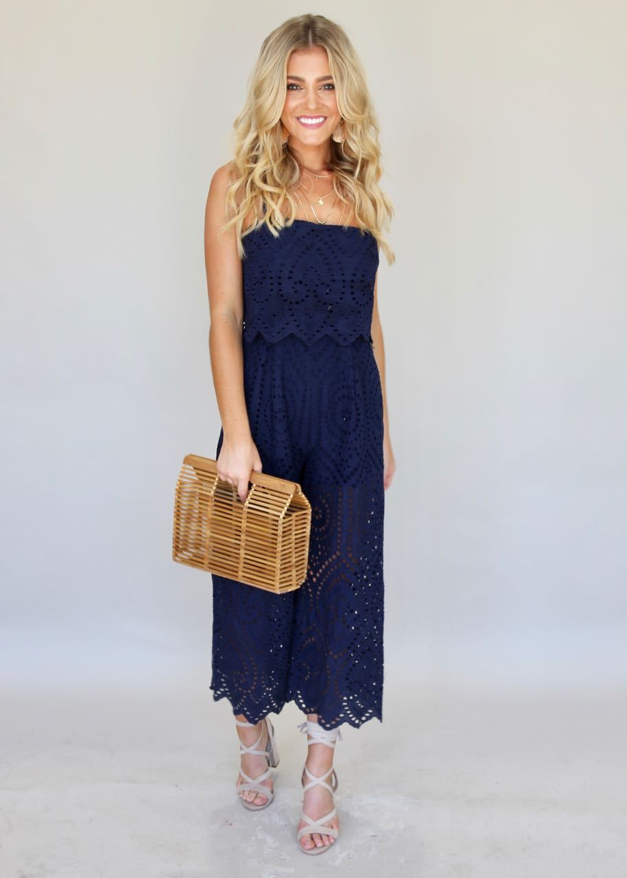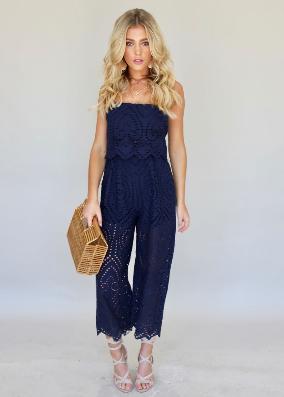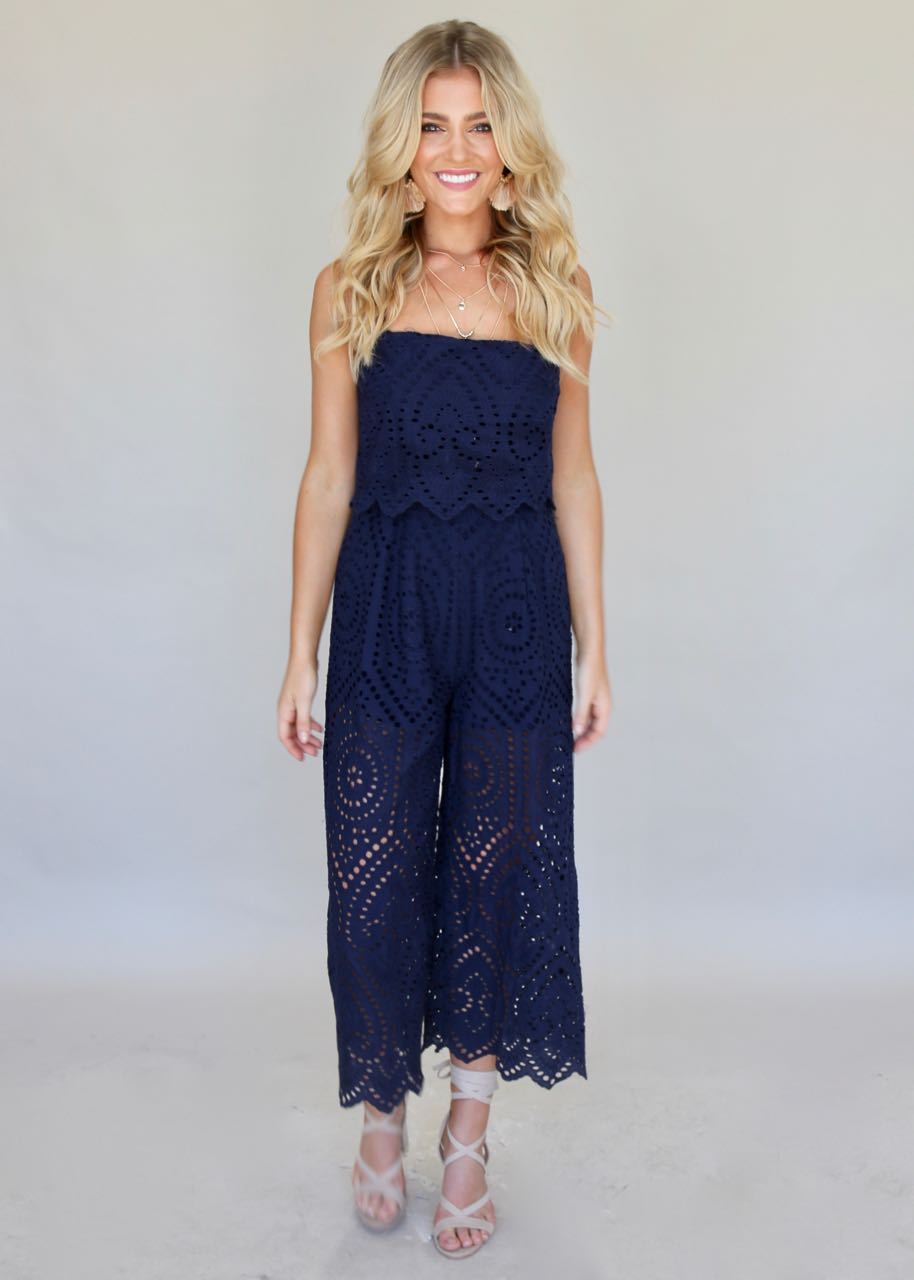 Simple and sophisticated, a gorgeous and delicate eyelet detailed pantsuit! Perfect as festive season nears, this is a great piece to dress up or down.