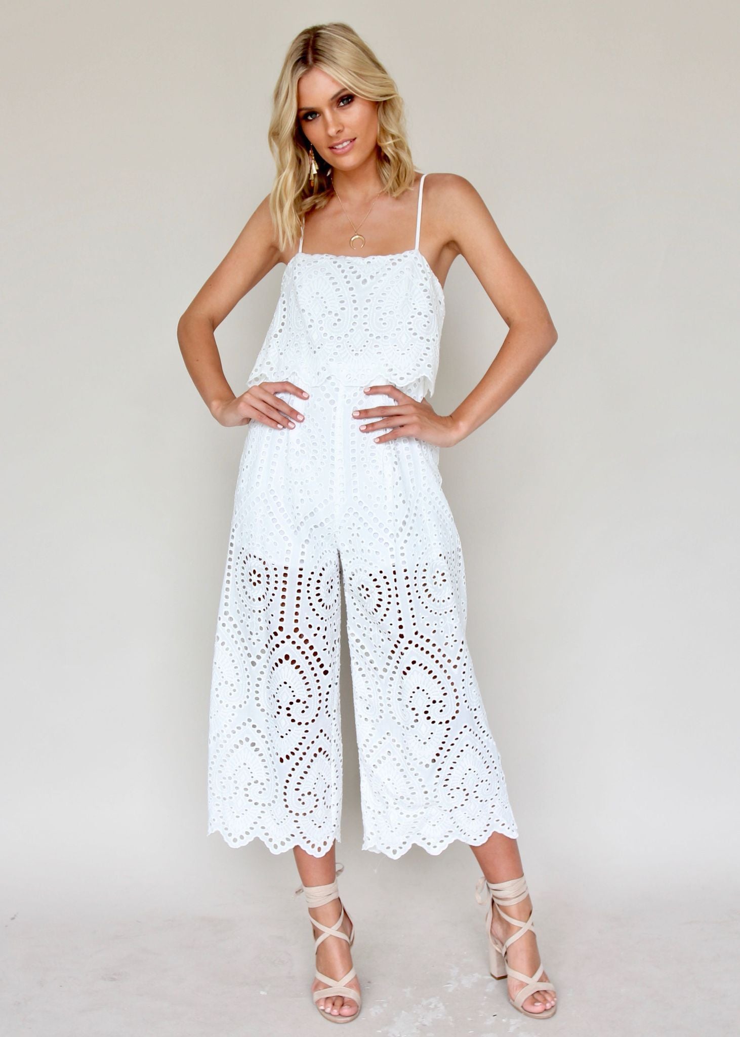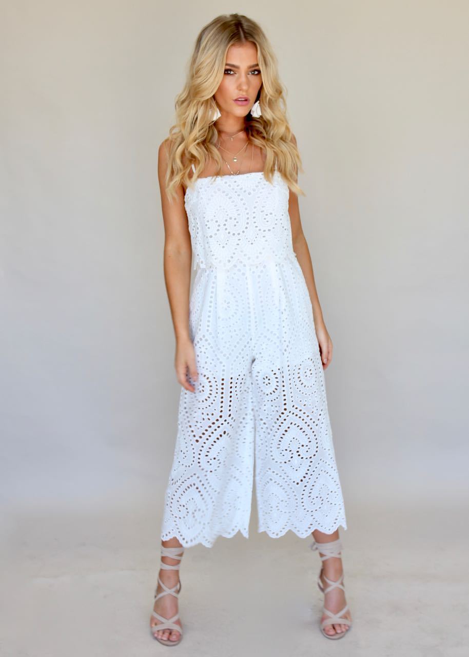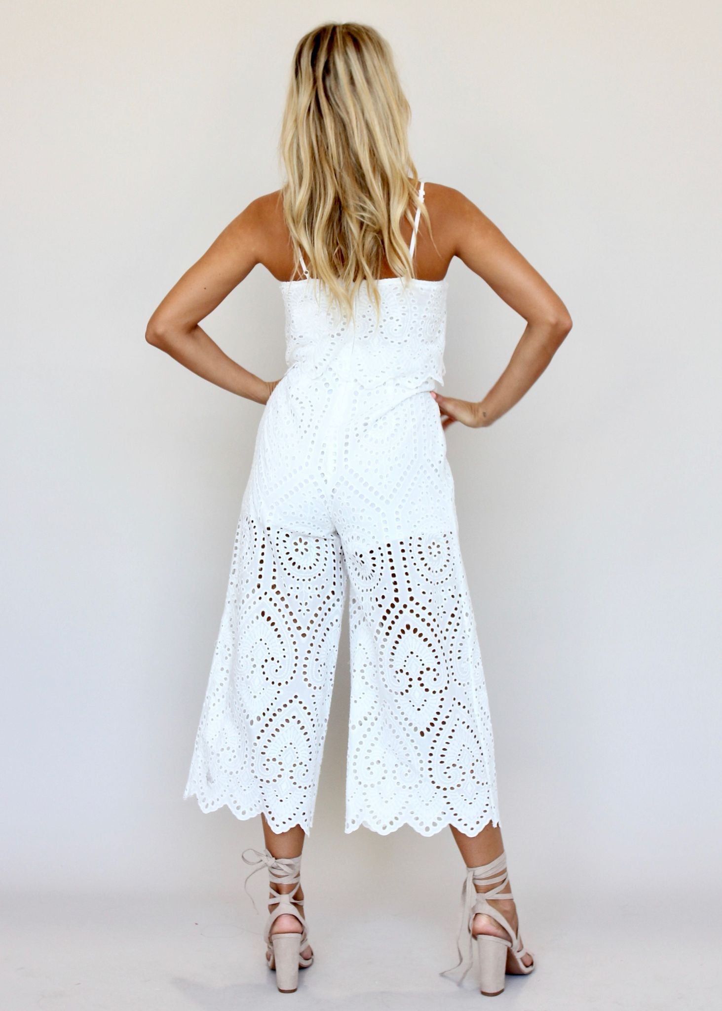 Simple and sophisticated, a gorgeous and delicate eyelet detailed pantsuit! Perfect as festive season nears, this is a great piece to dress up or down.