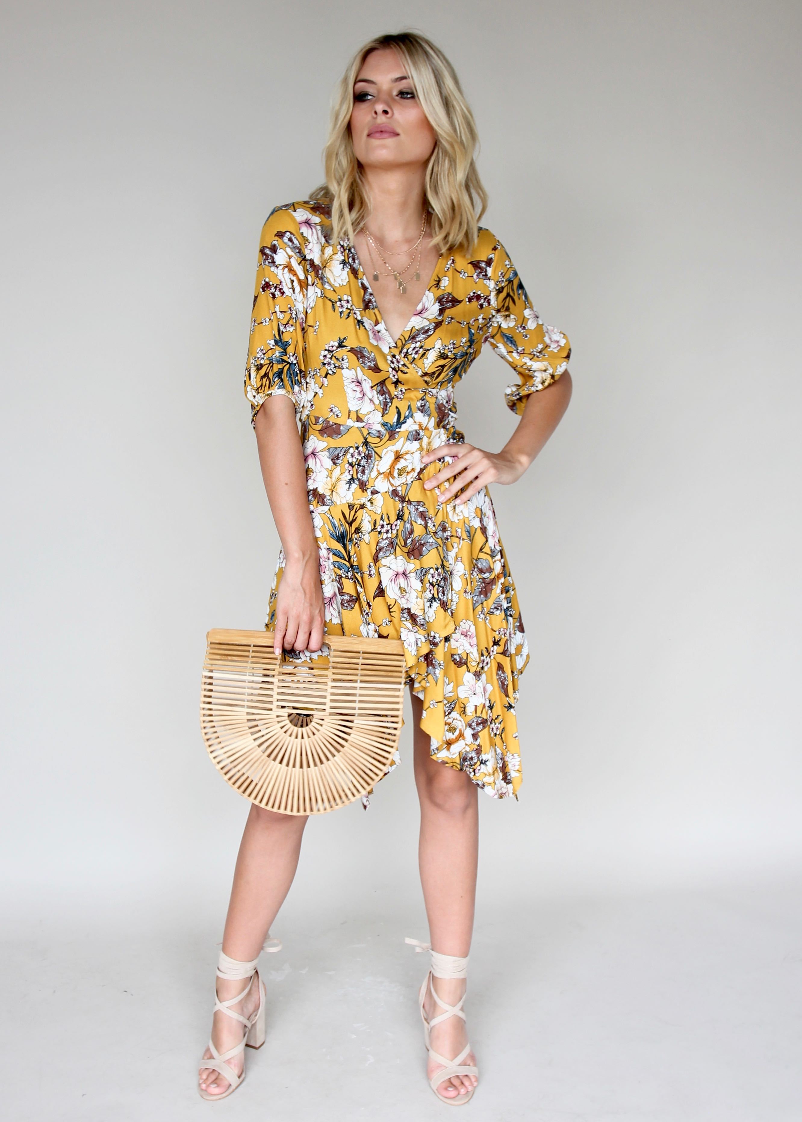 A simple yet stunning wrap style dress in a gorgeous mustard floral! Perfect with our Cavo Bag and your fave tan heels!