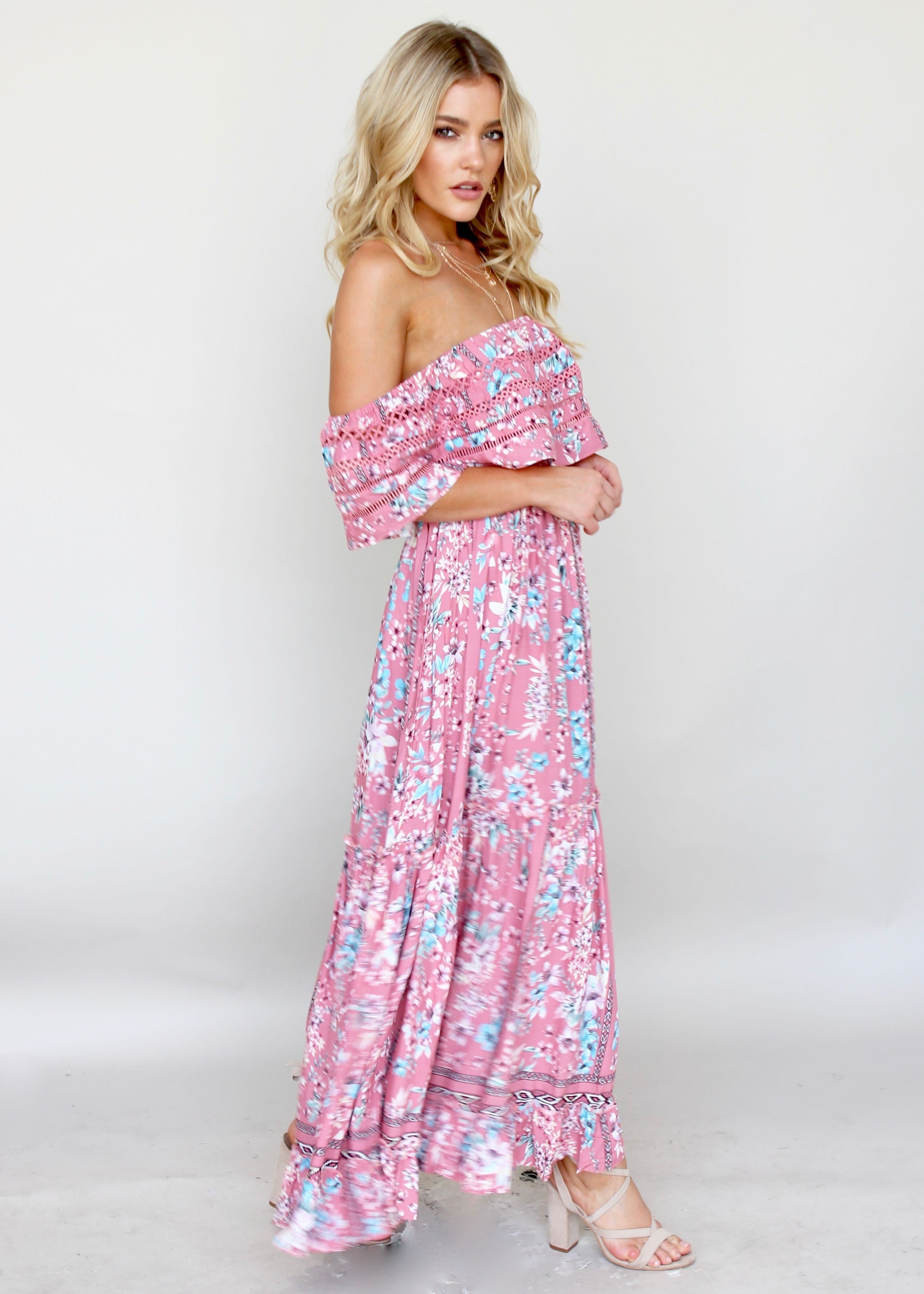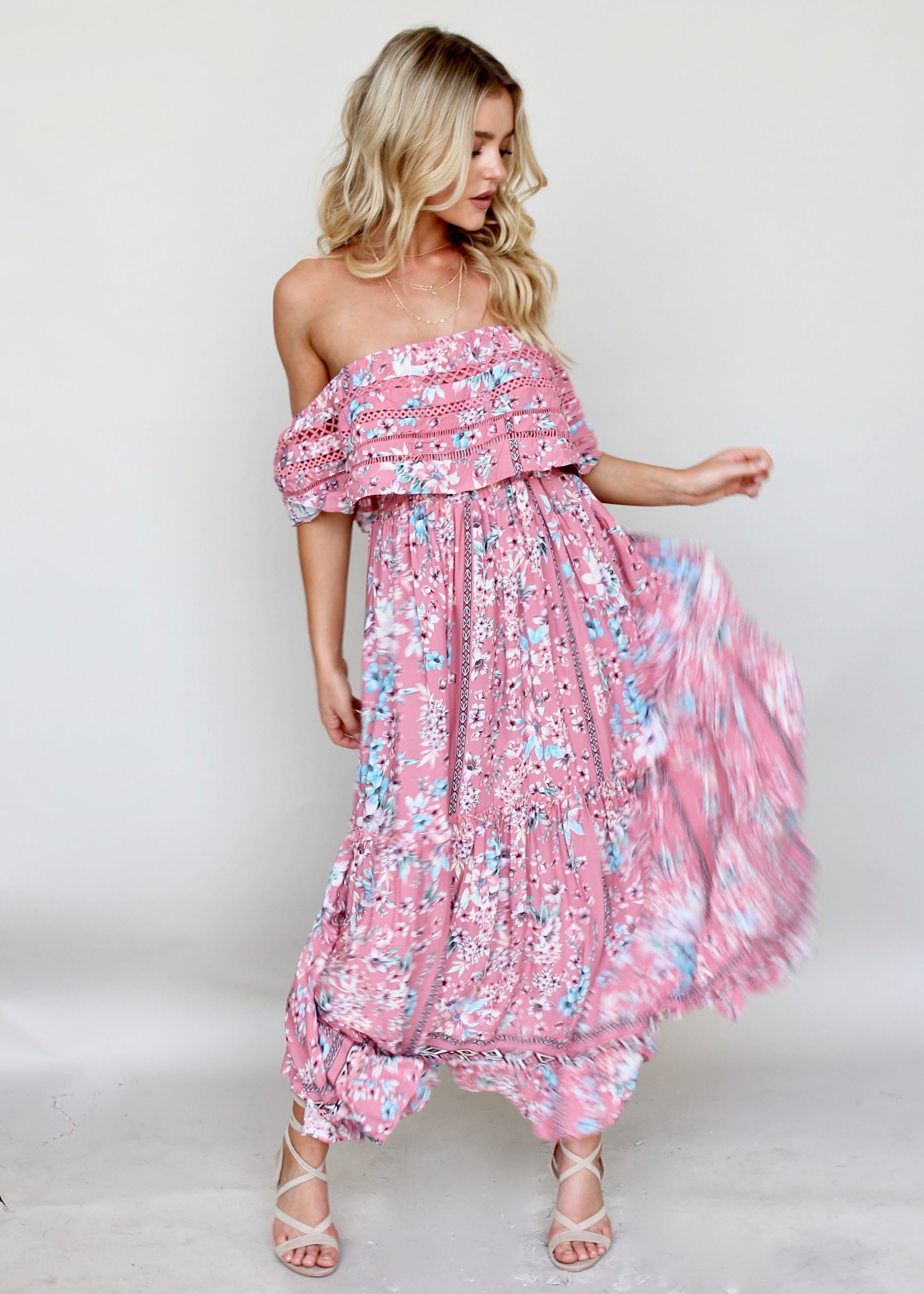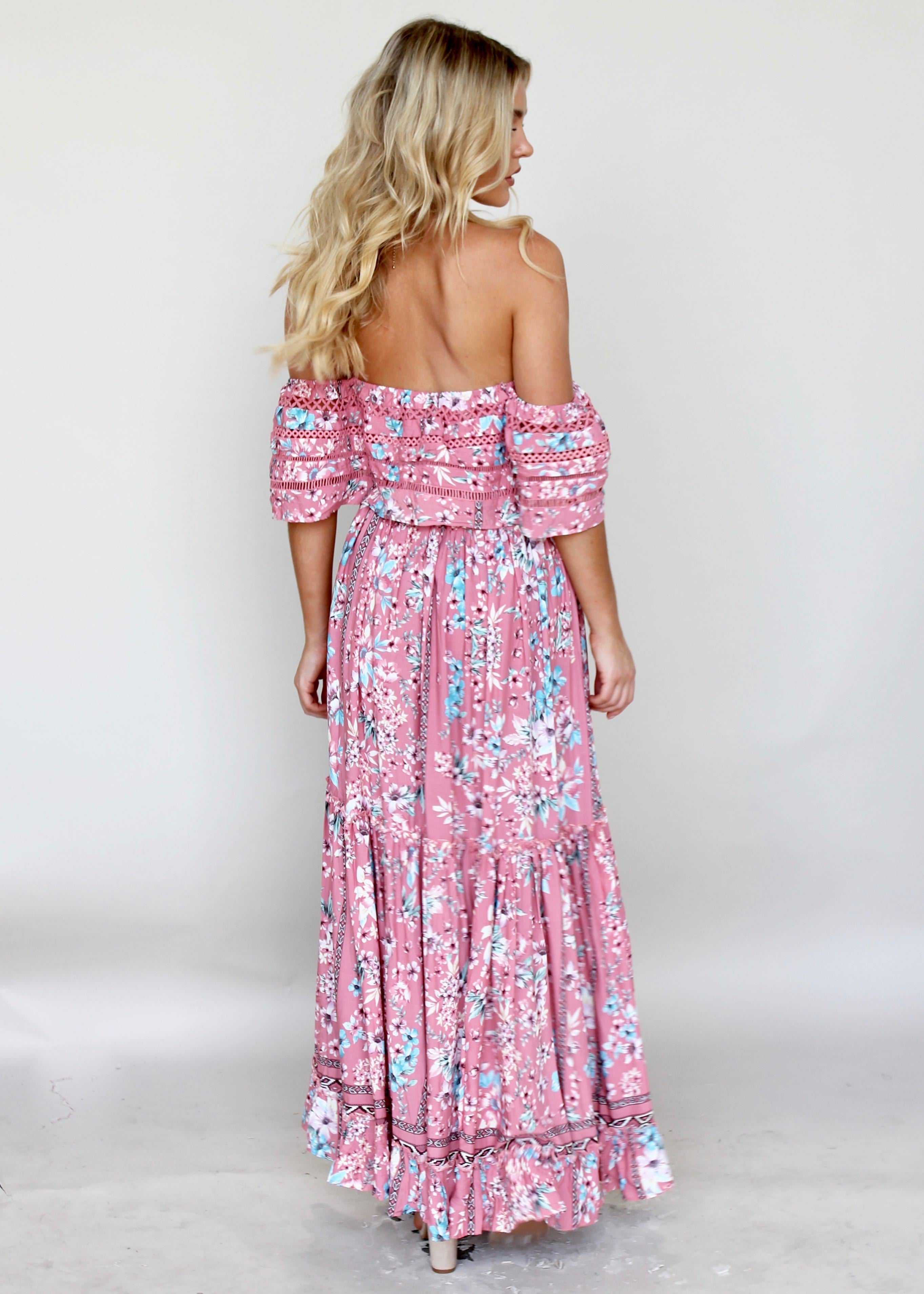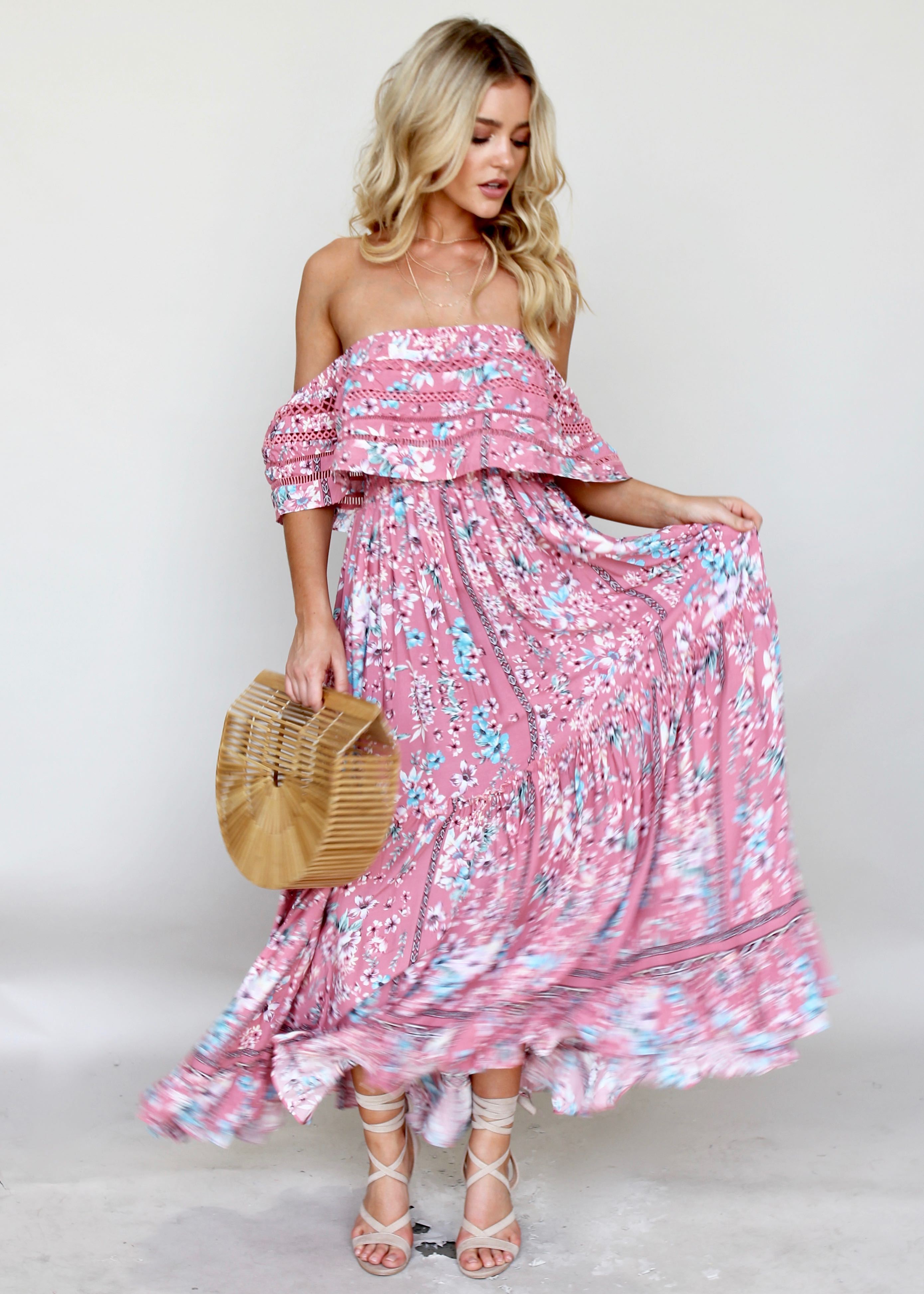 There is no better way to welcome Spring than this gorgeous off shoulder maxi dress! In a soft pink print, you'll be sure to turn heads. Off shoulder is the hottest trend this season. Finish it off with our Santana necklace and Cavo bag for the ultimate look!