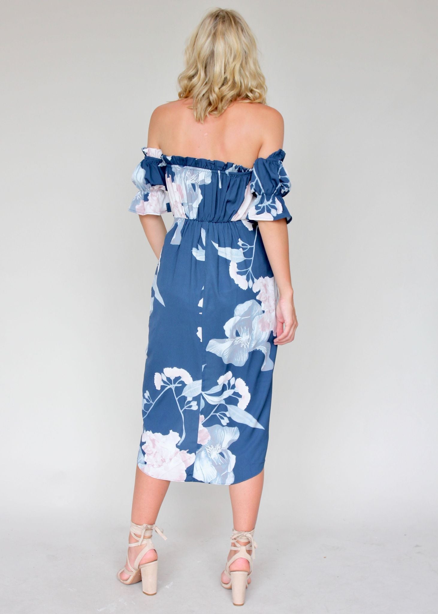 The Kiss & Tell Midi Dress features a a ruffled, off-shoulder necklace, slightly fluted sleeves and petal split skirt with dip hemline. In a gorgeous blue floral print, this dress is perfect for all your events this Summer. Wear it with the Ibiza Disc Necklace in Gold and Roby Earrings.