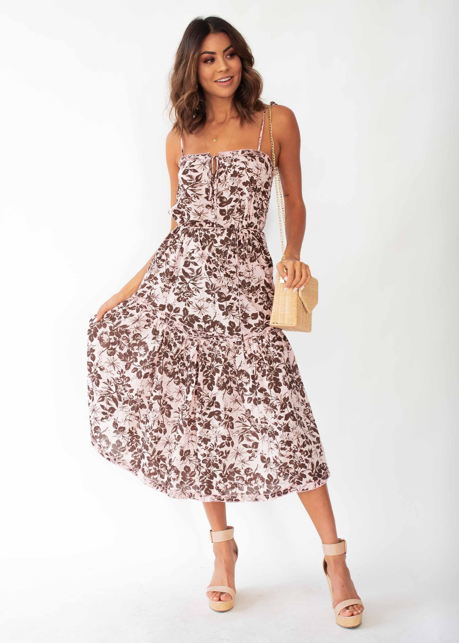 Fall in love with this gorgeous dress this season! This gorgeous midi in the flattering blush floral print will soon be your season go-to in no time.