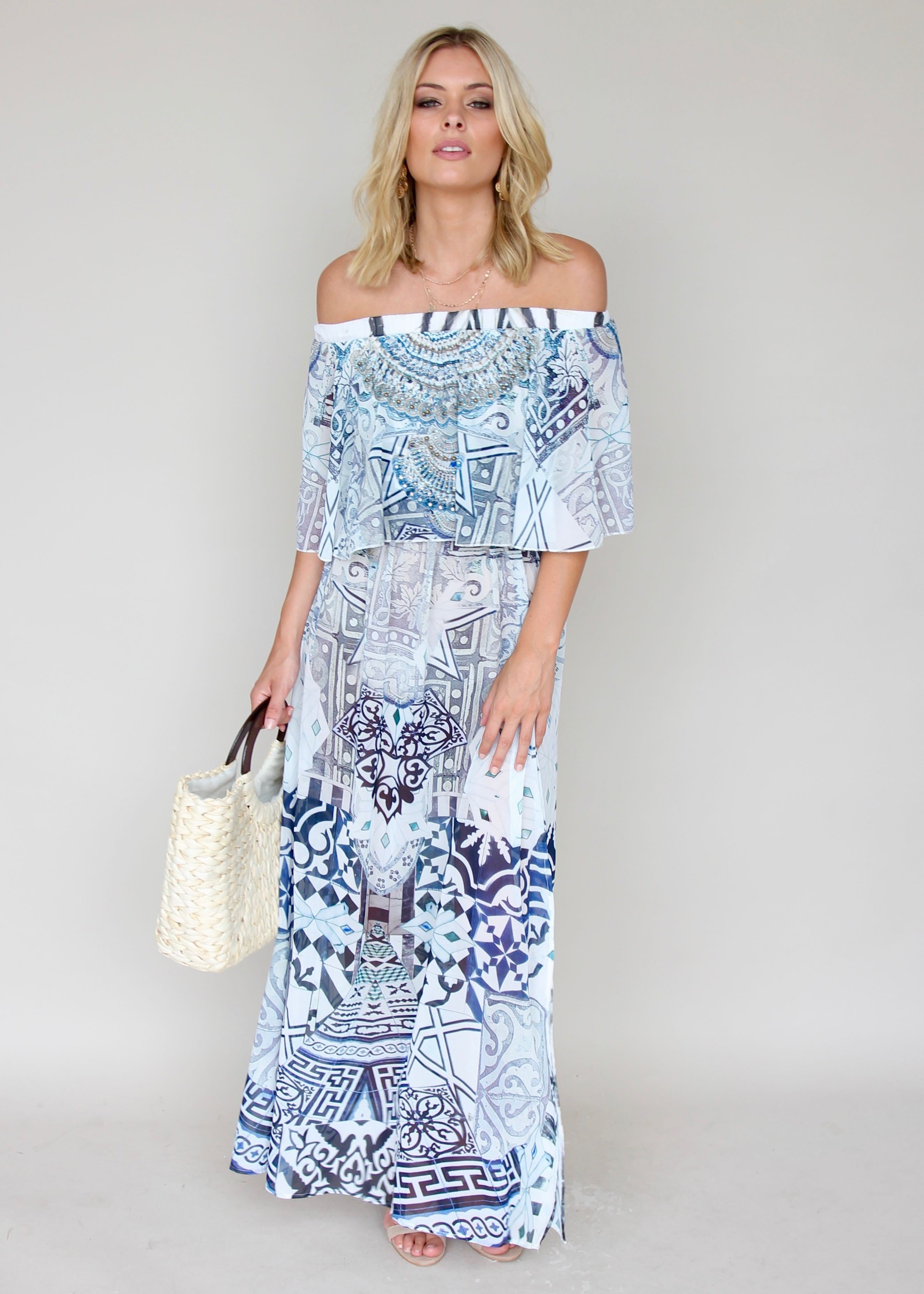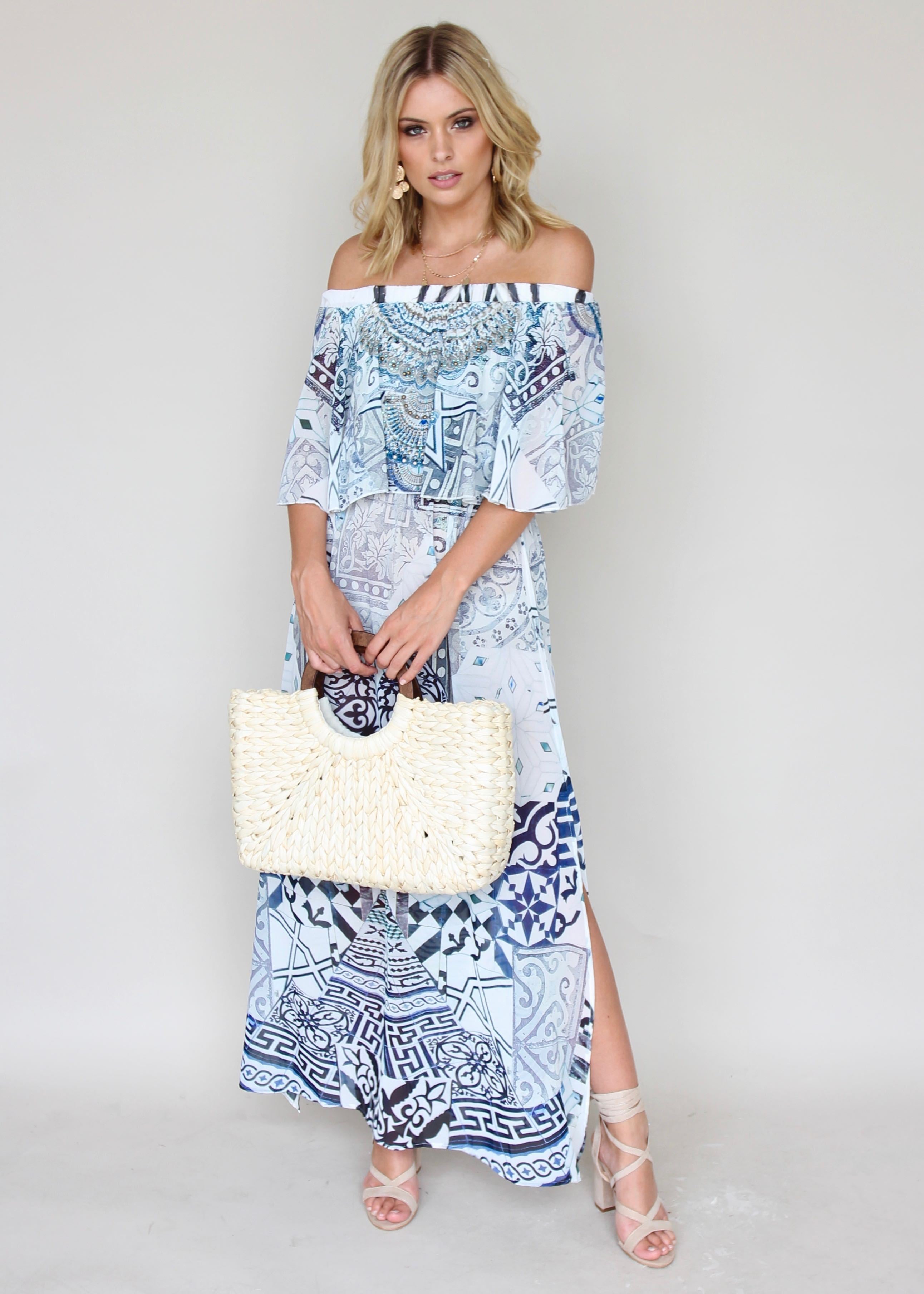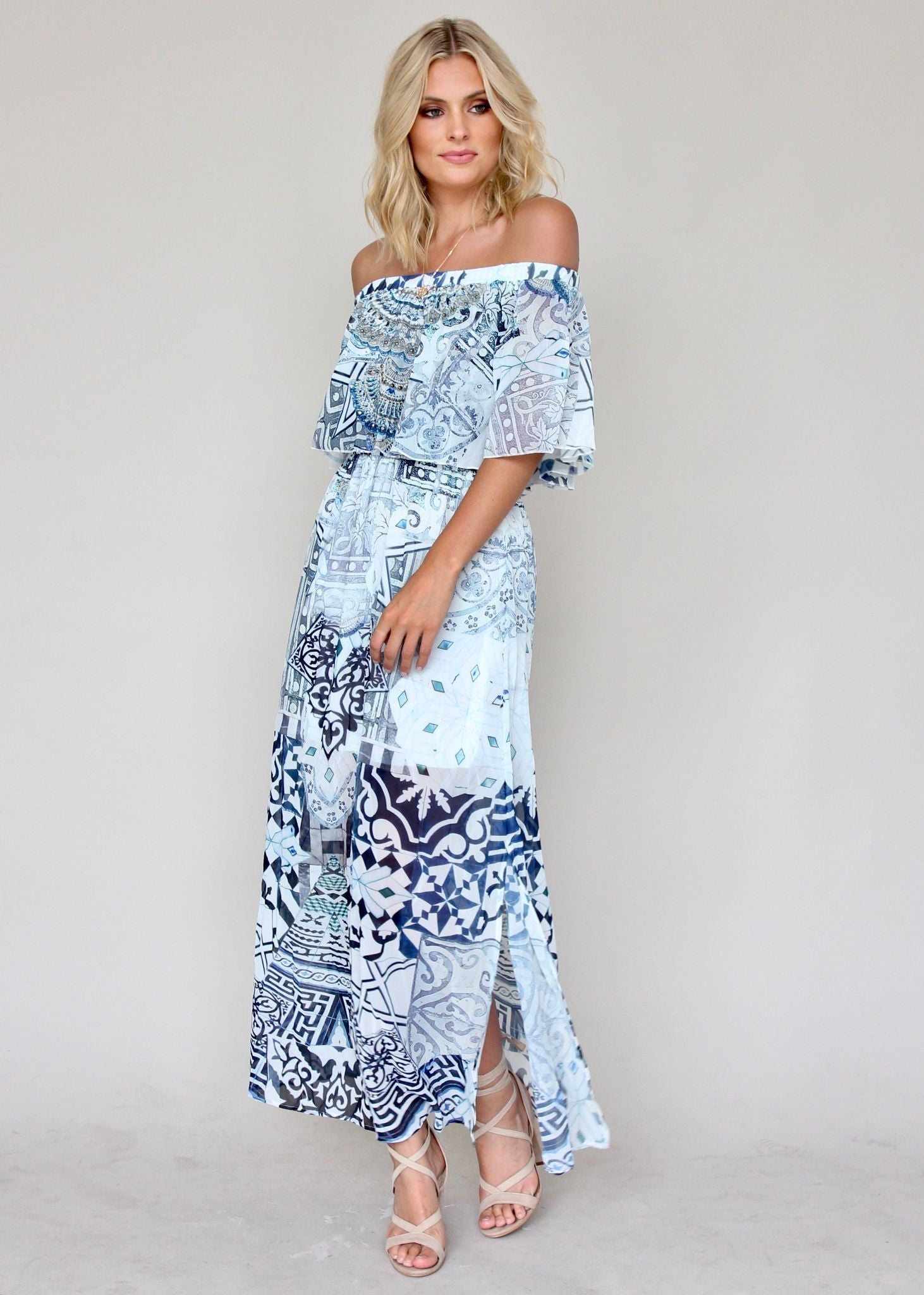 This gorgeous dress is a must have for all boho lovers! This off shoulder maxi features a stunning print - you will be sure to turn heads wherever you go.