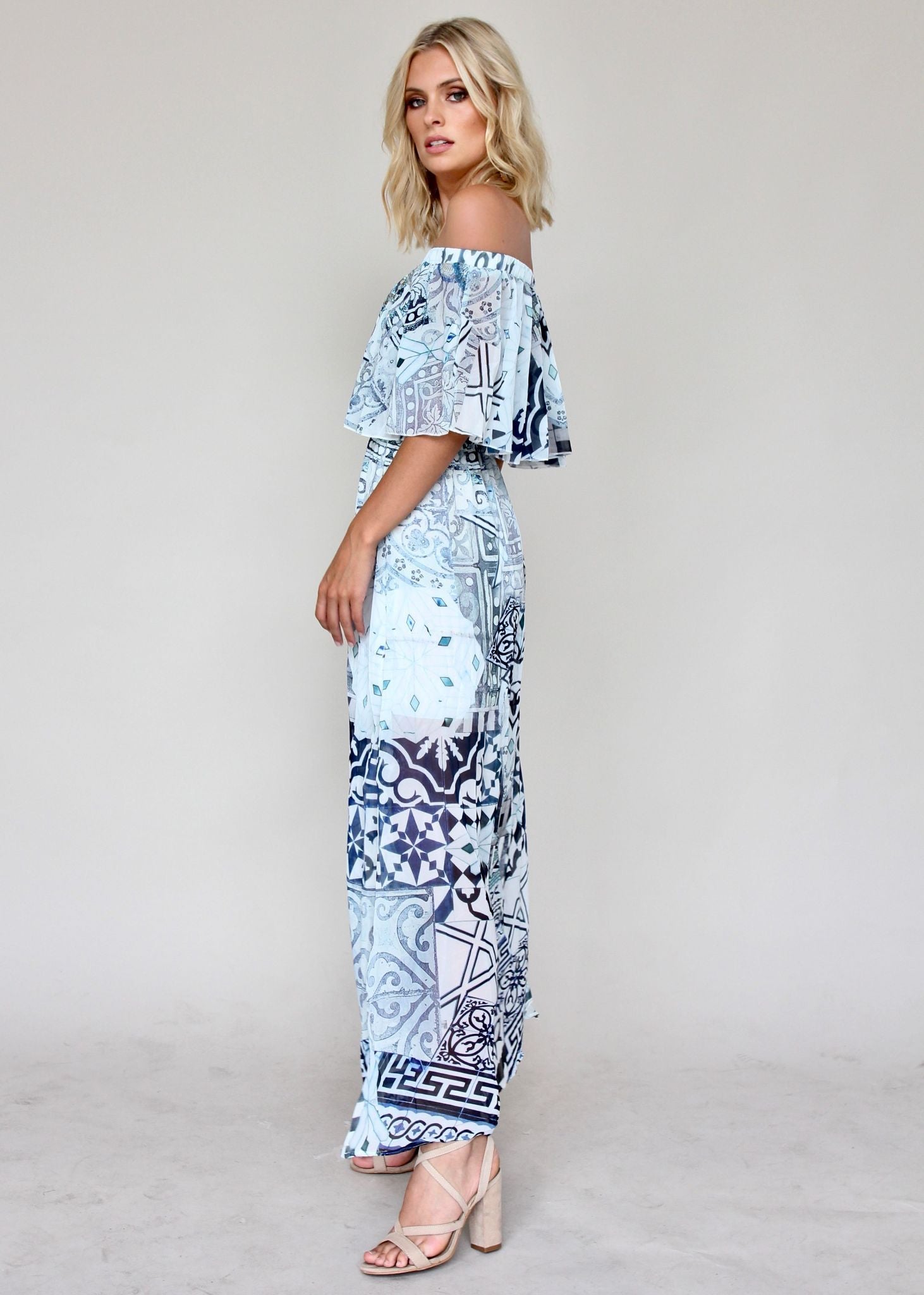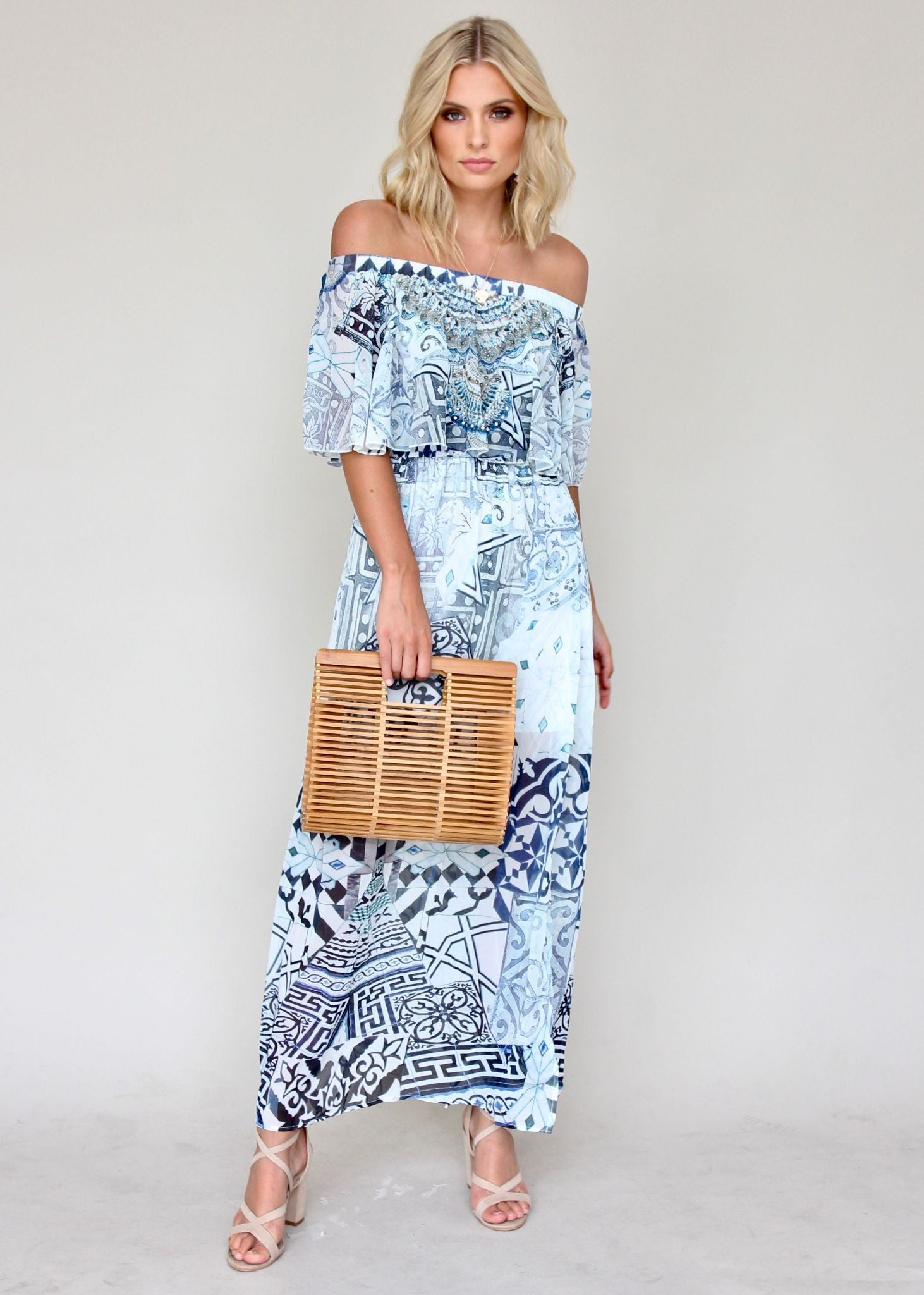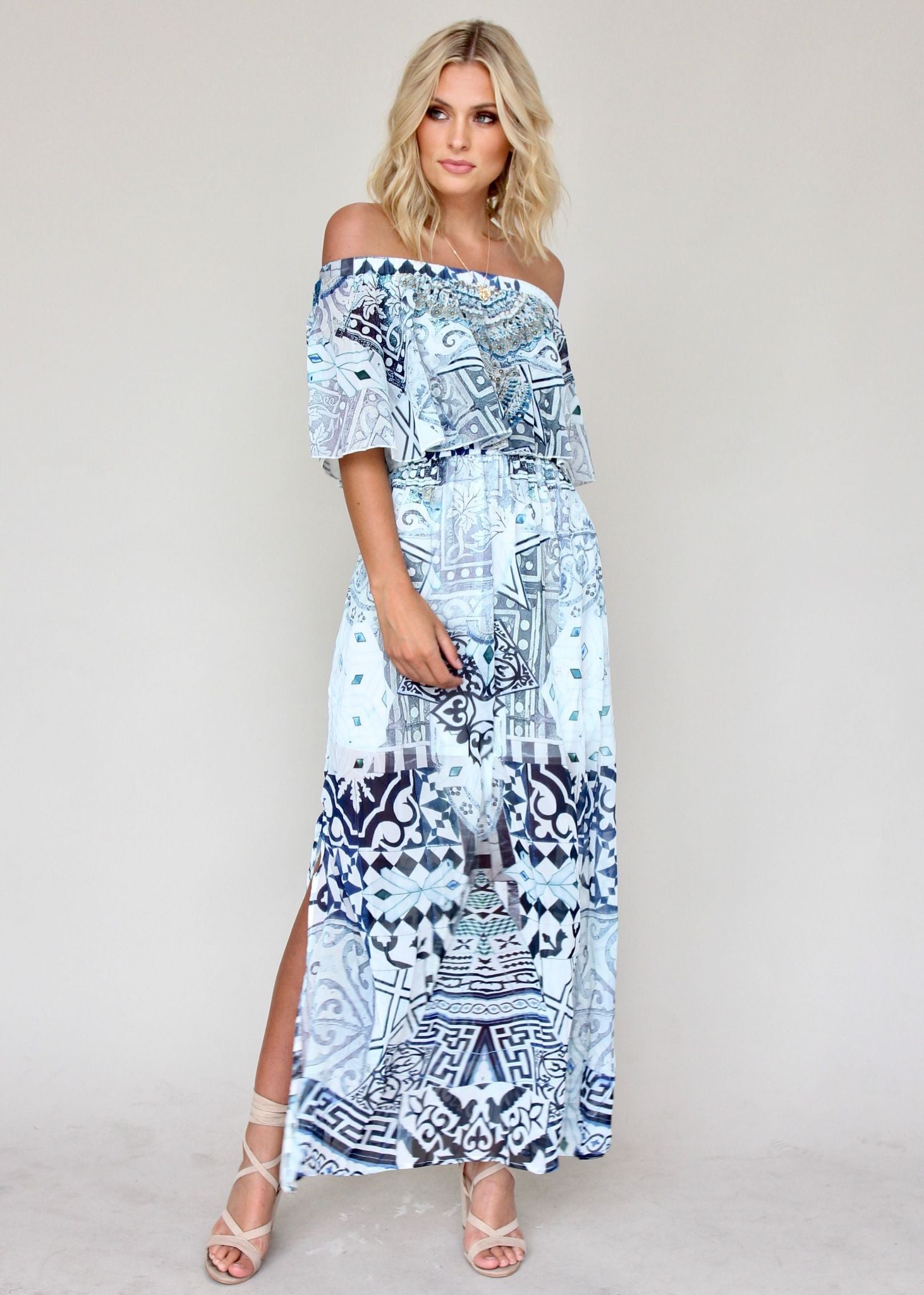 This gorgeous dress is a must have for all boho lovers! This off shoulder maxi features a stunning print - you will be sure to turn heads wherever you go.