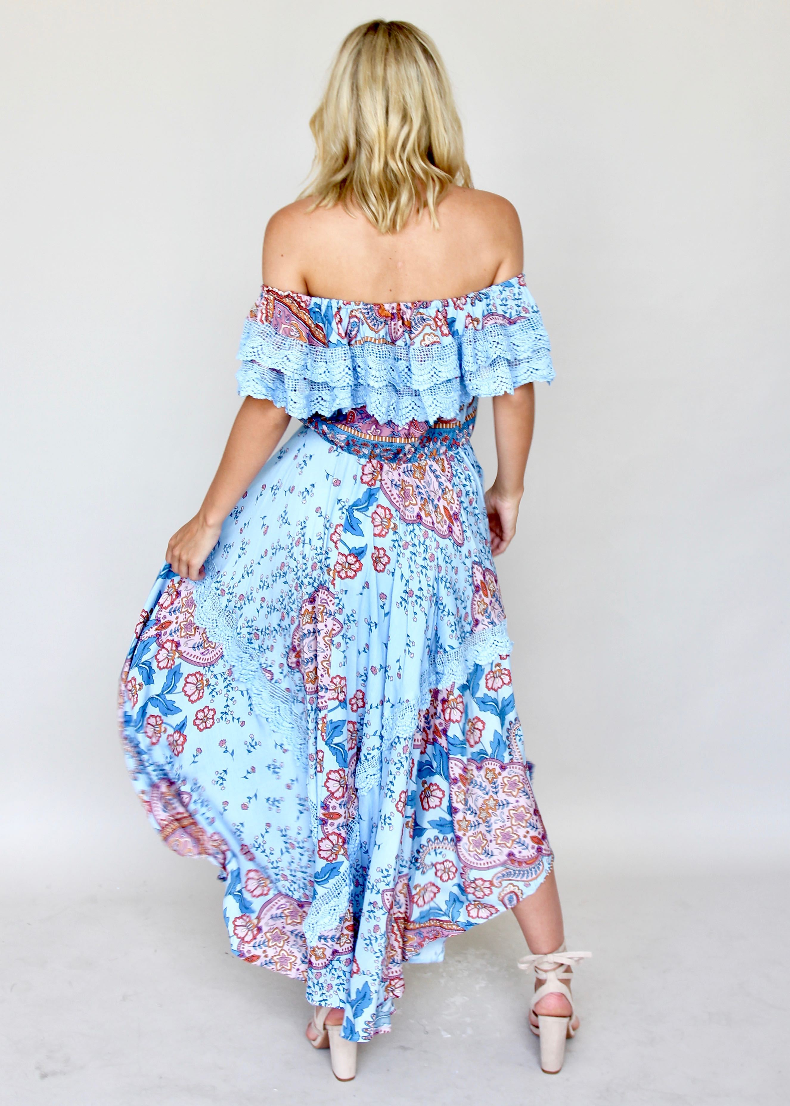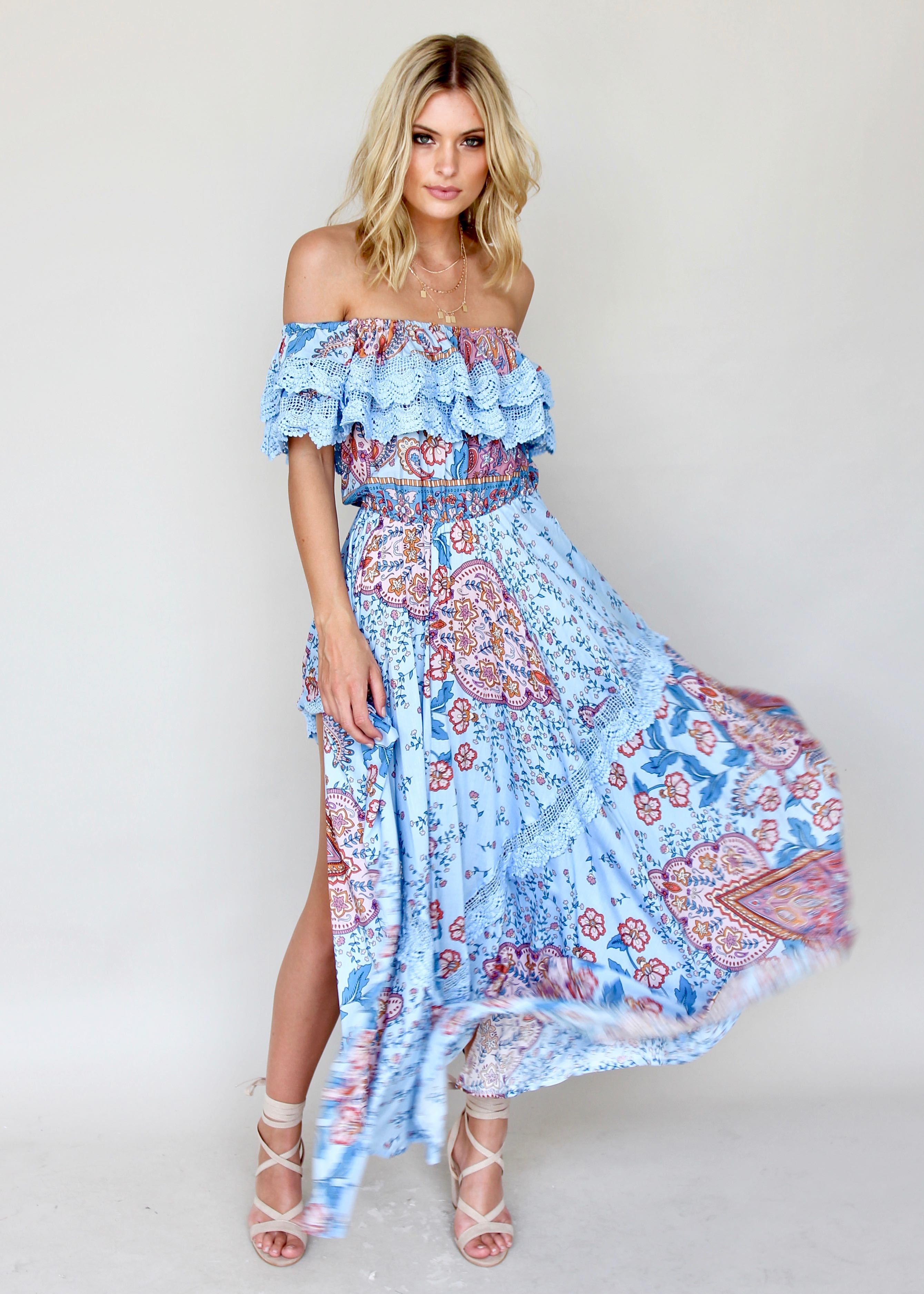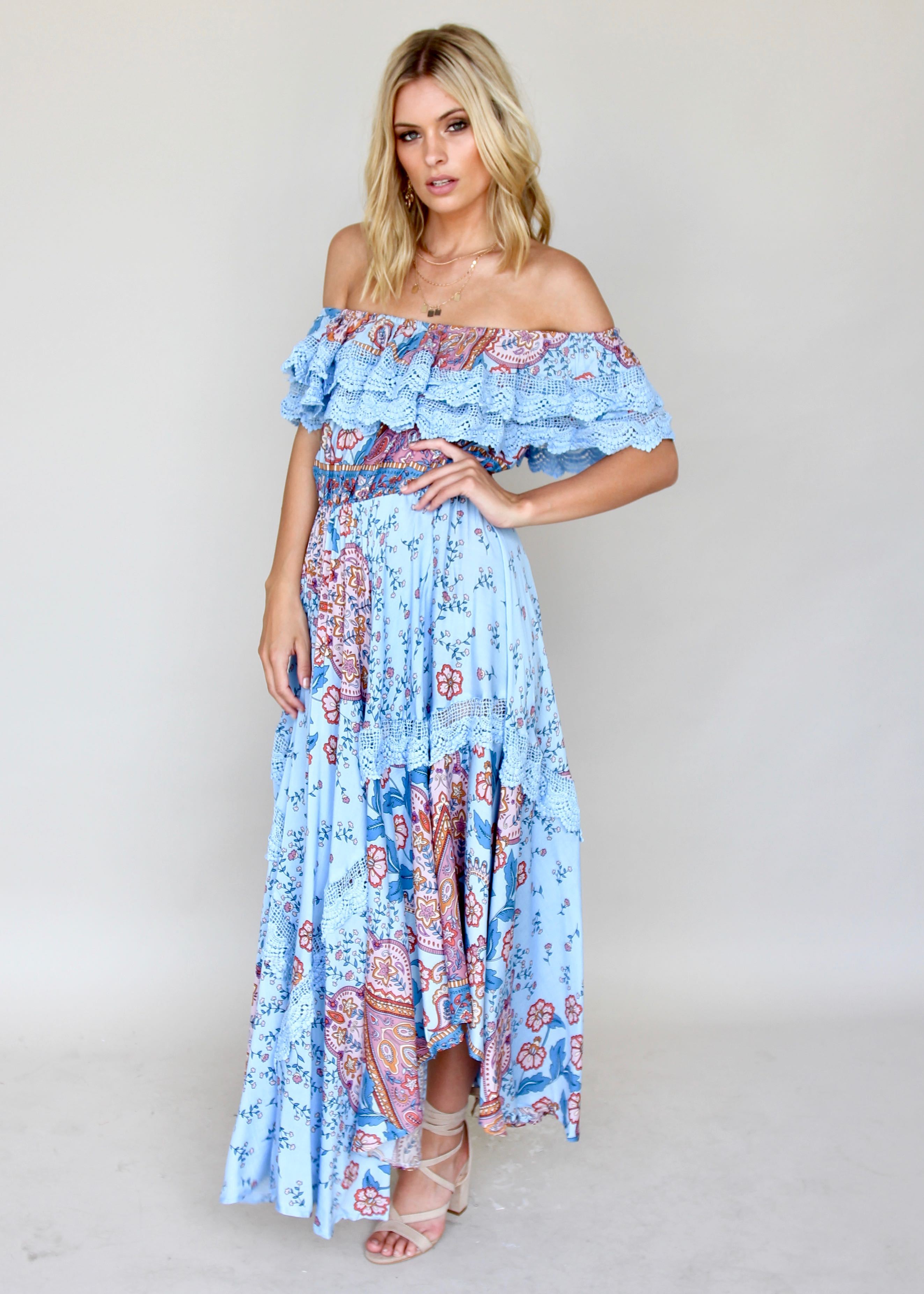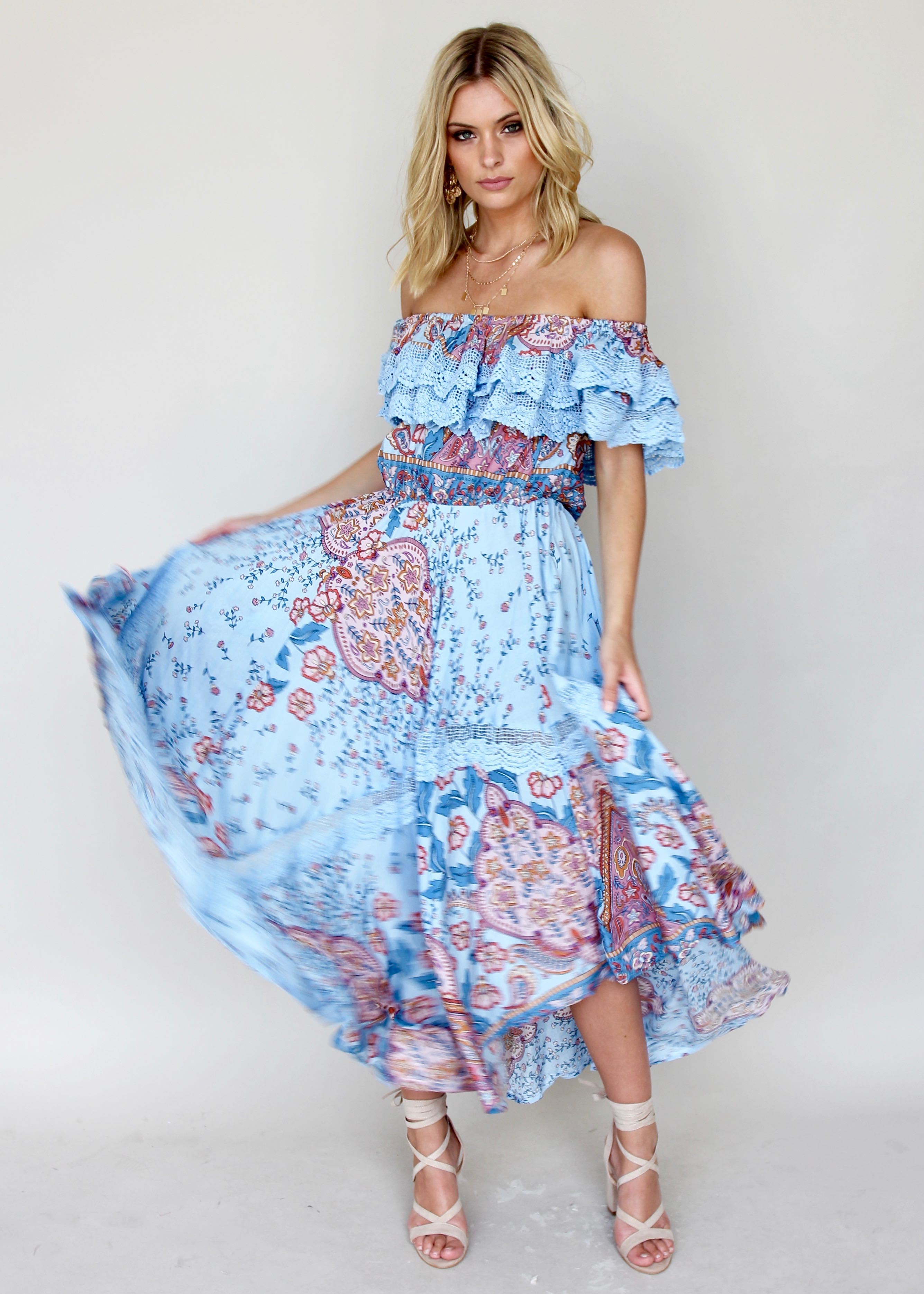 This is the must-have maxi dress for the season! In a gorgeous blue print, you'll want to wear this gorgeous piece everywhere! Finish the look off with our Harlo Bag and our Malaa Choker for an effortless finishing touch.