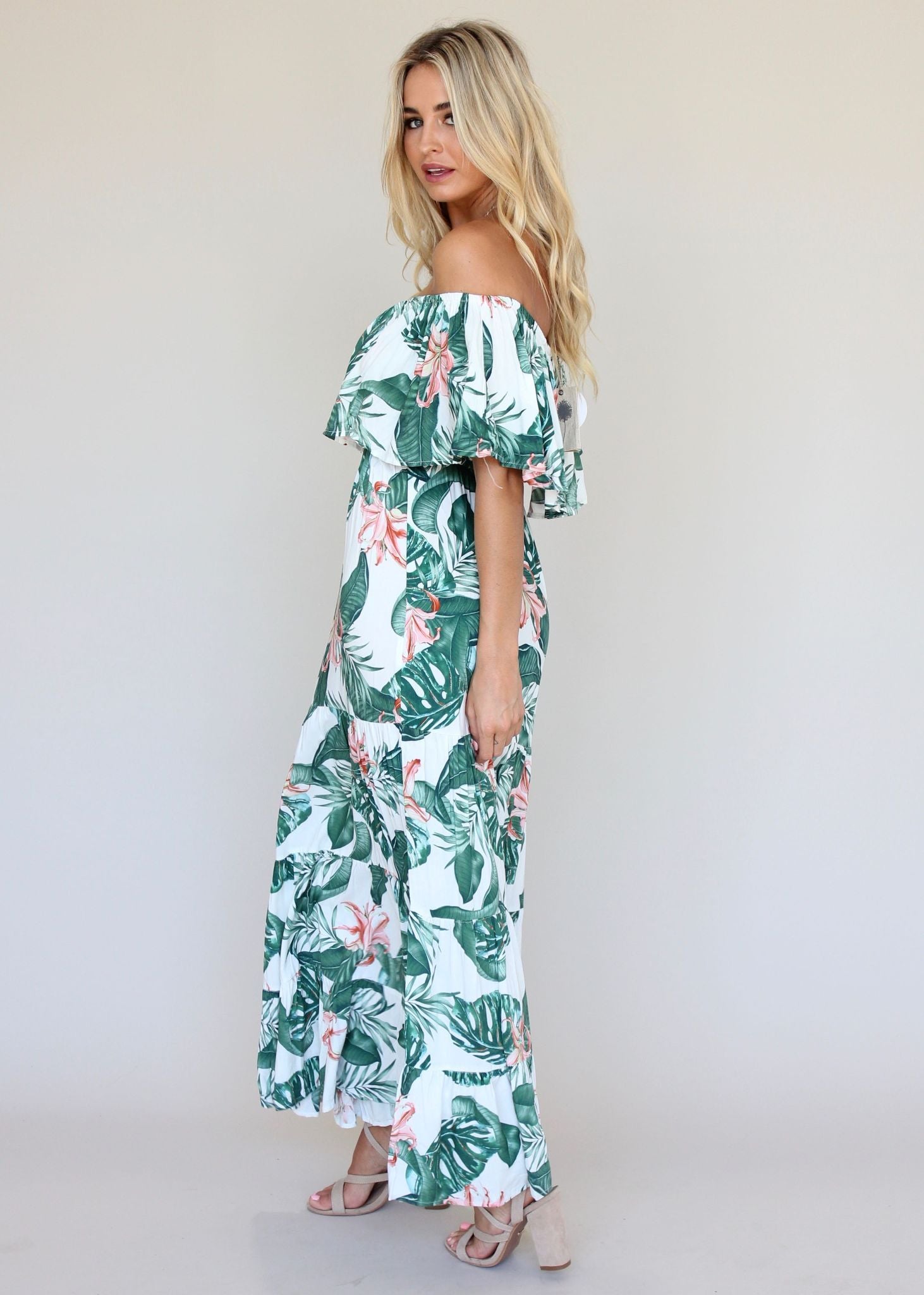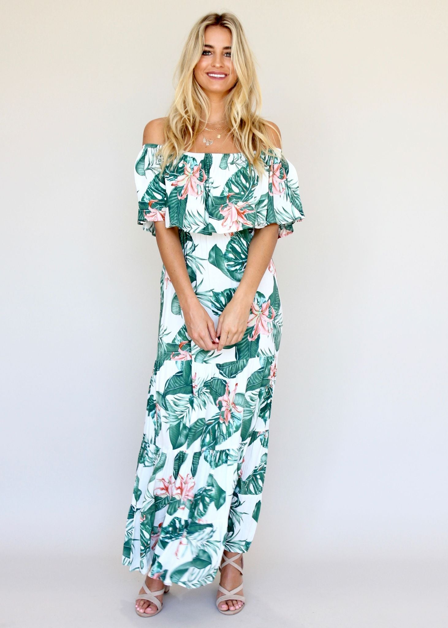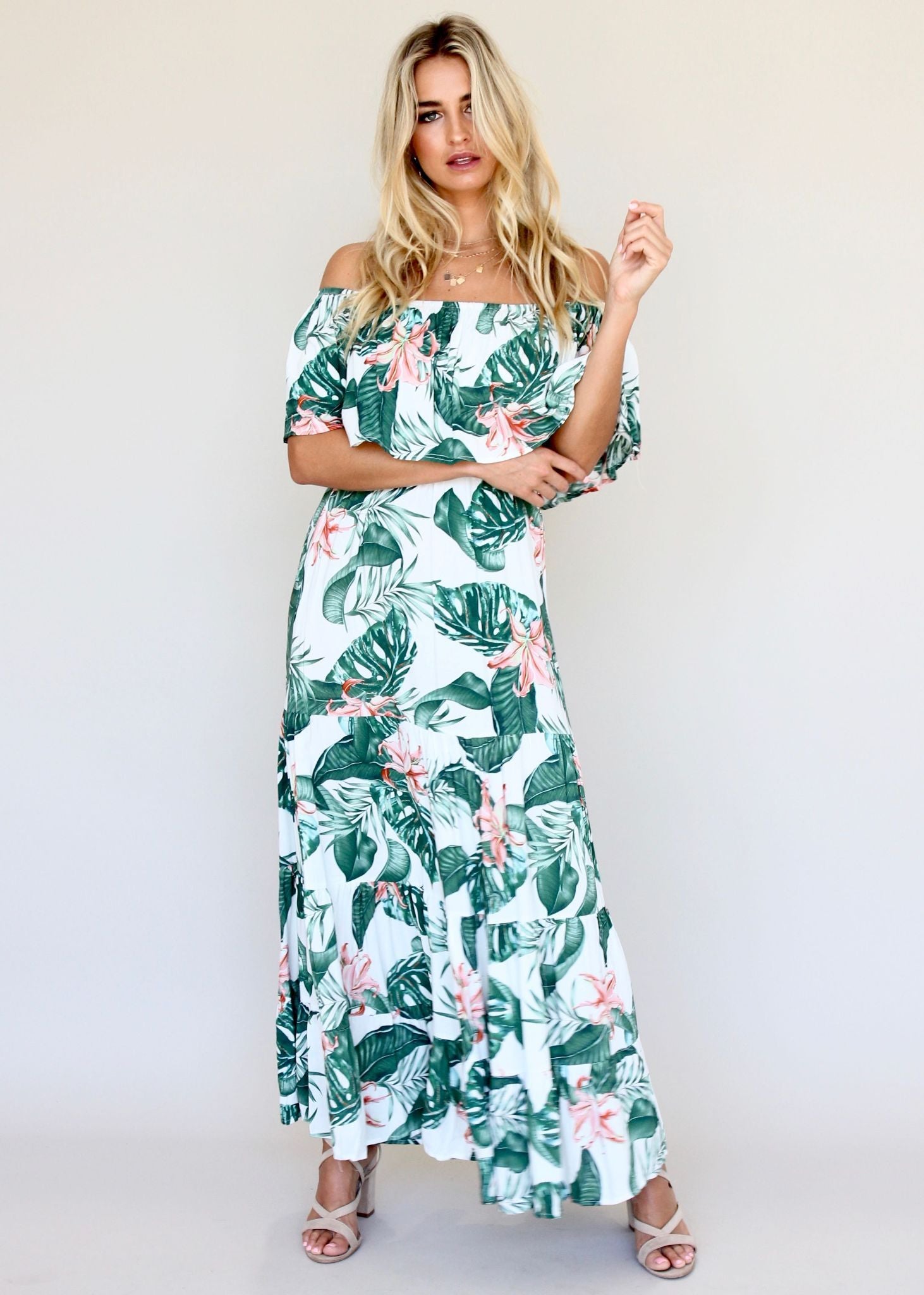 Off shoulder dresses are the must have trend this season! In a gorgeous palms print, what is not to love.