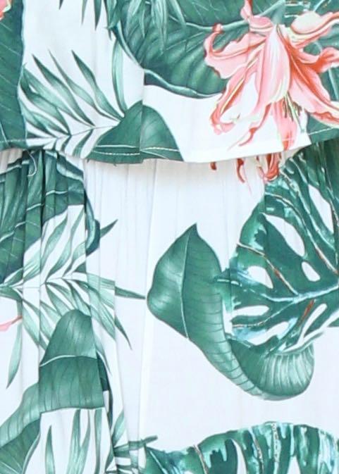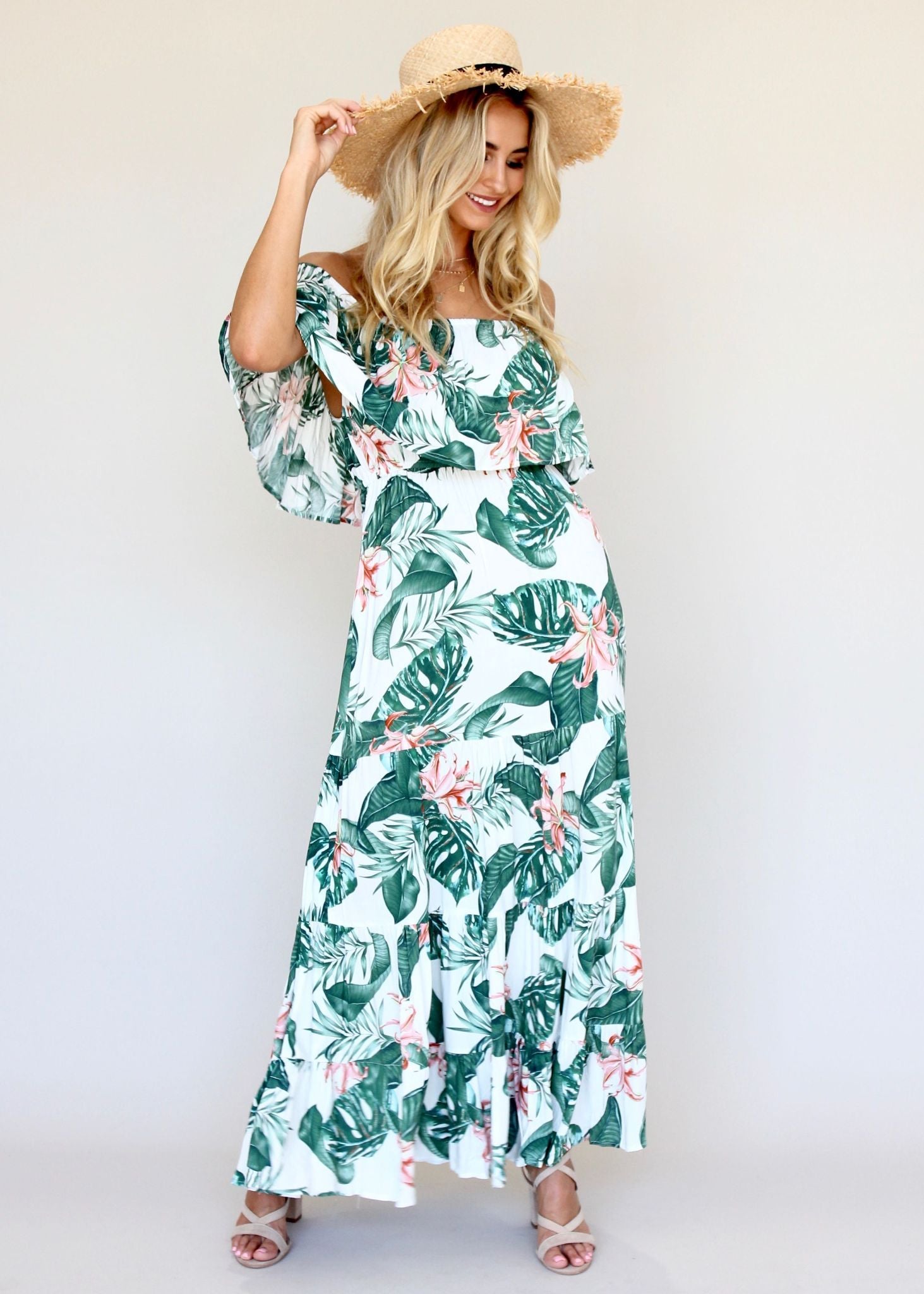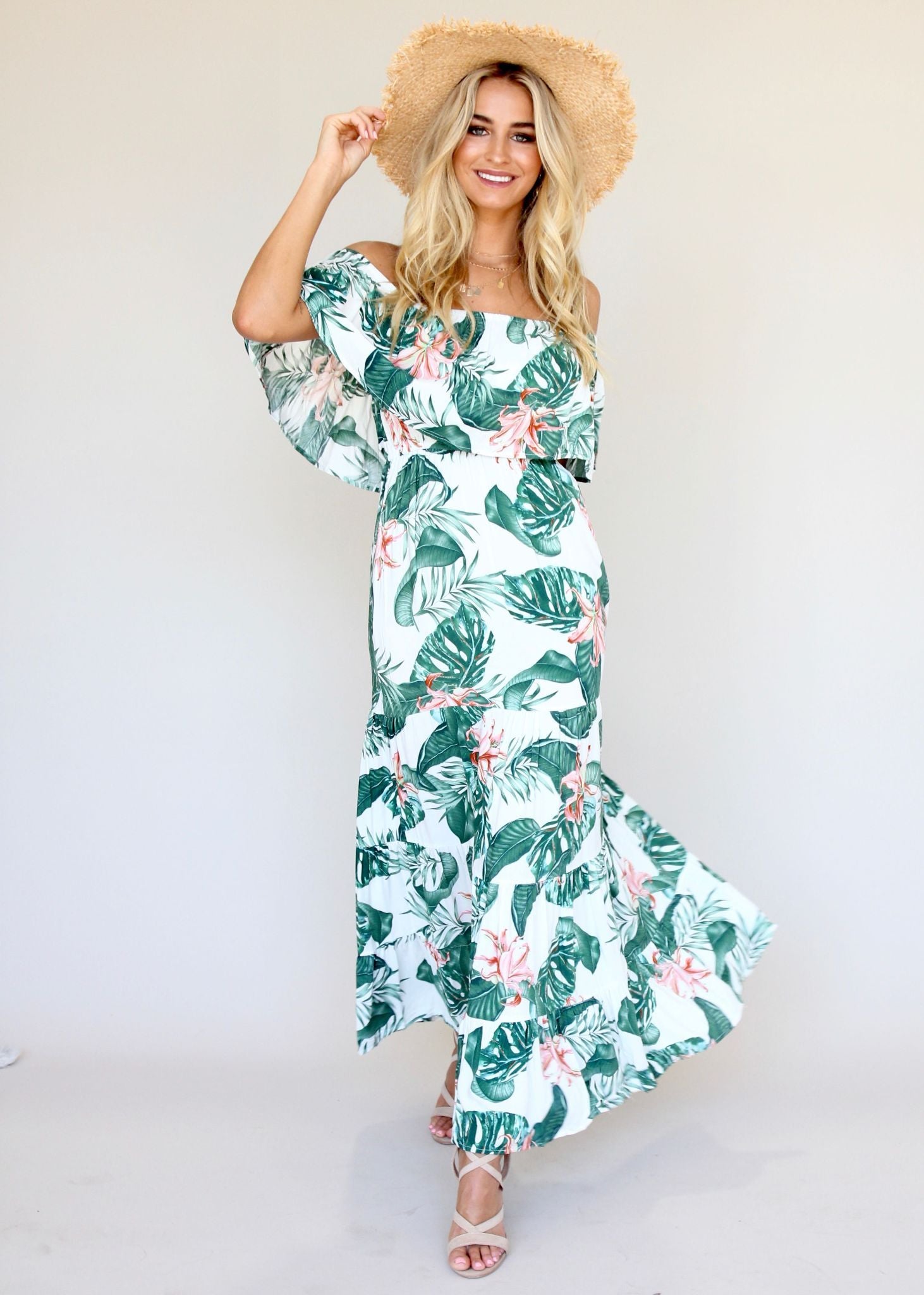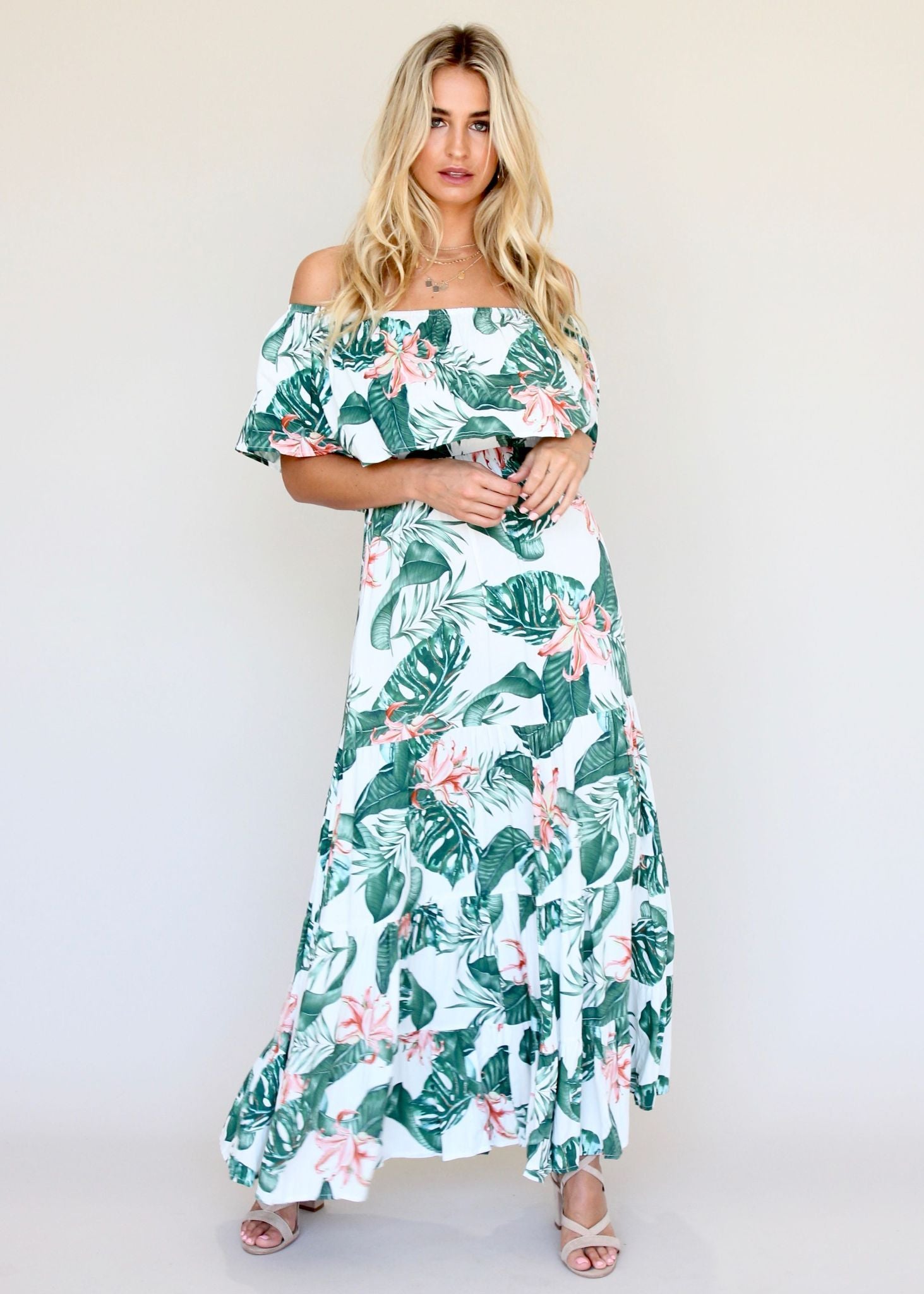 Off shoulder dresses are the must have trend this season! In a gorgeous palms print, what is not to love.