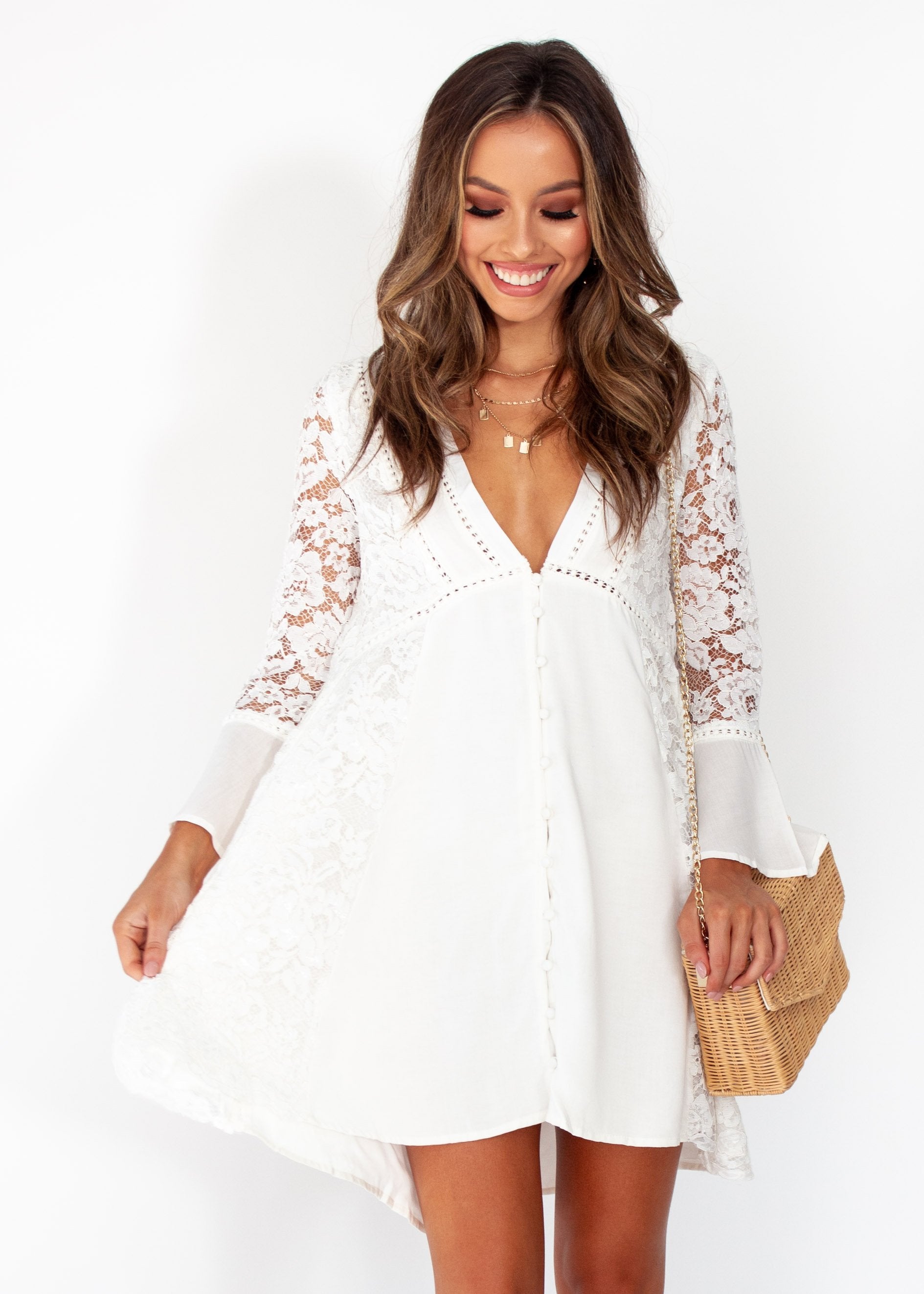 A super cute dress with stunning lace detailing and bell sleeves that you will instantly love!