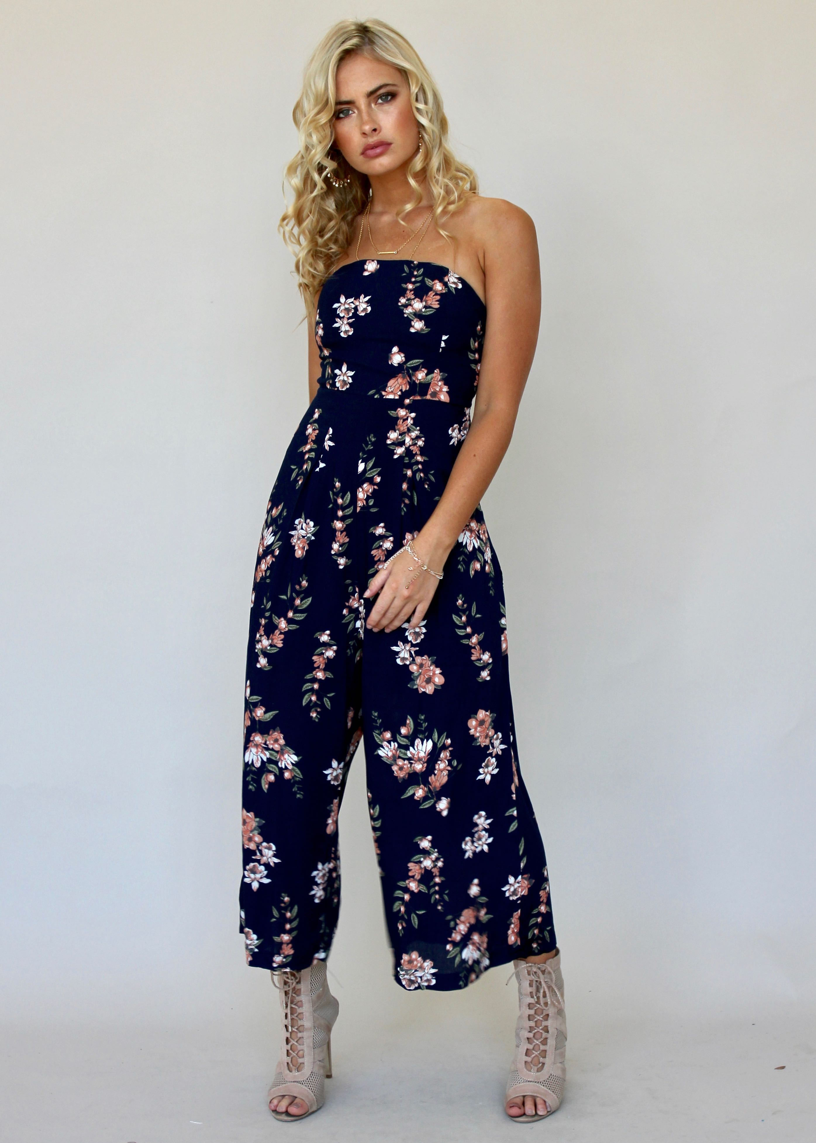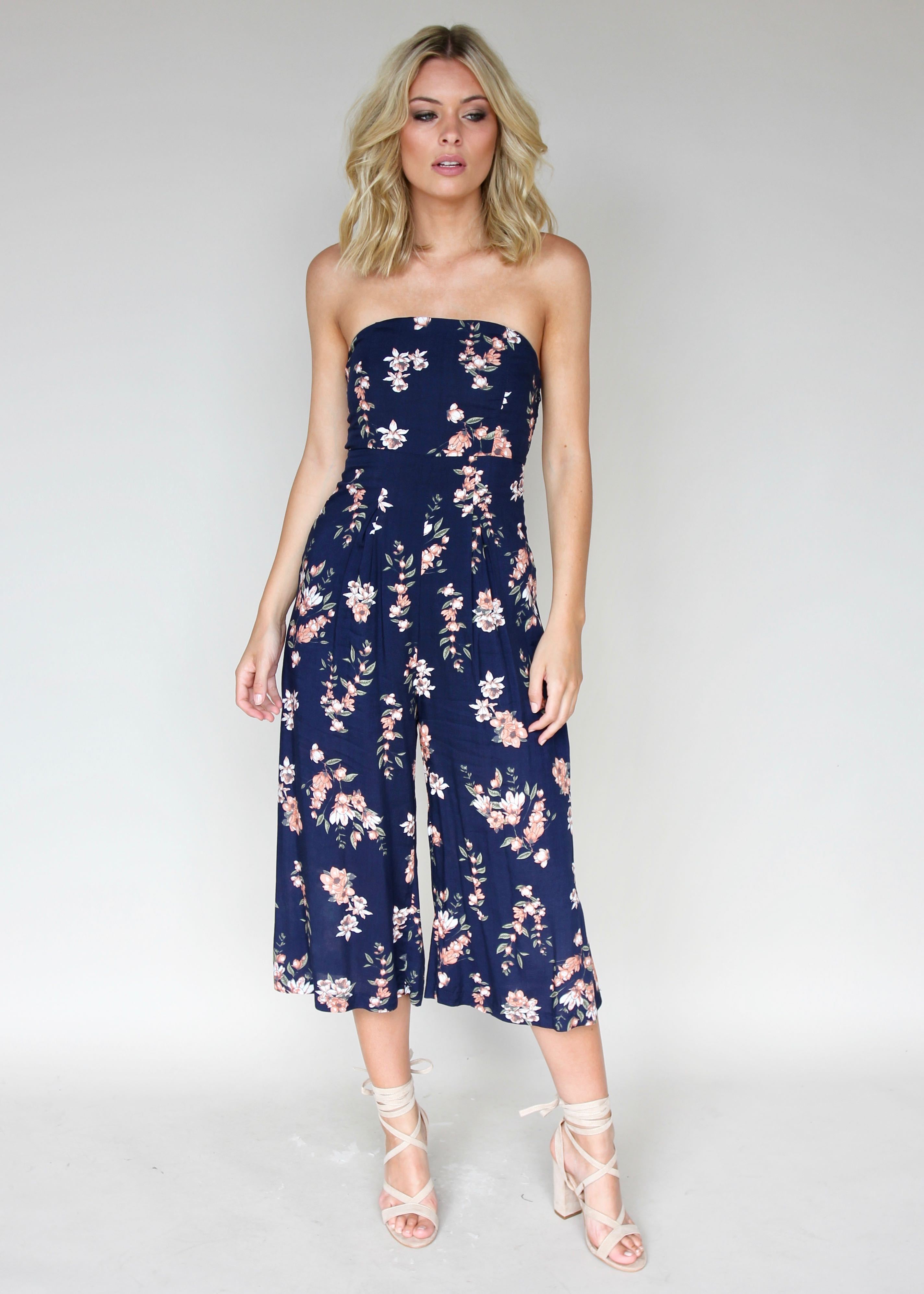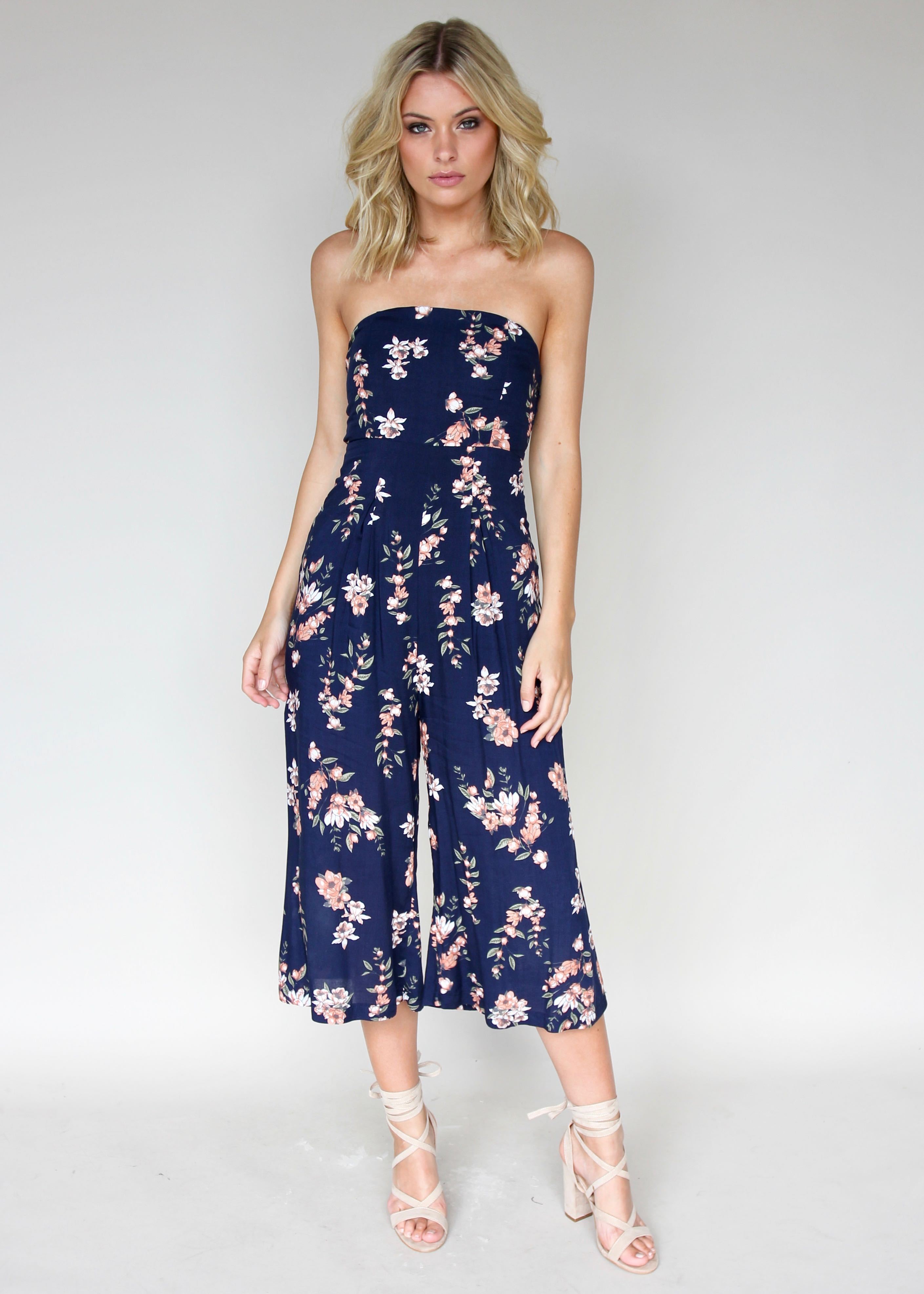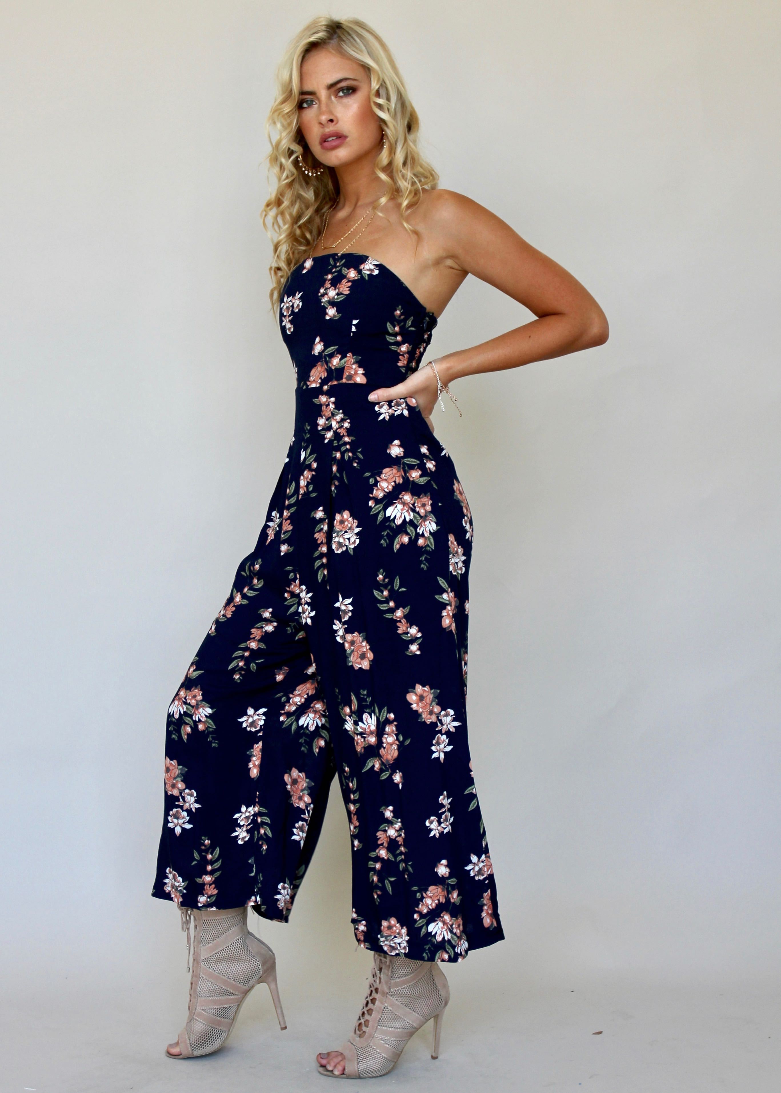 Chic off the shoulder pantsuit with padded bust and an easy to wear dark floral print.