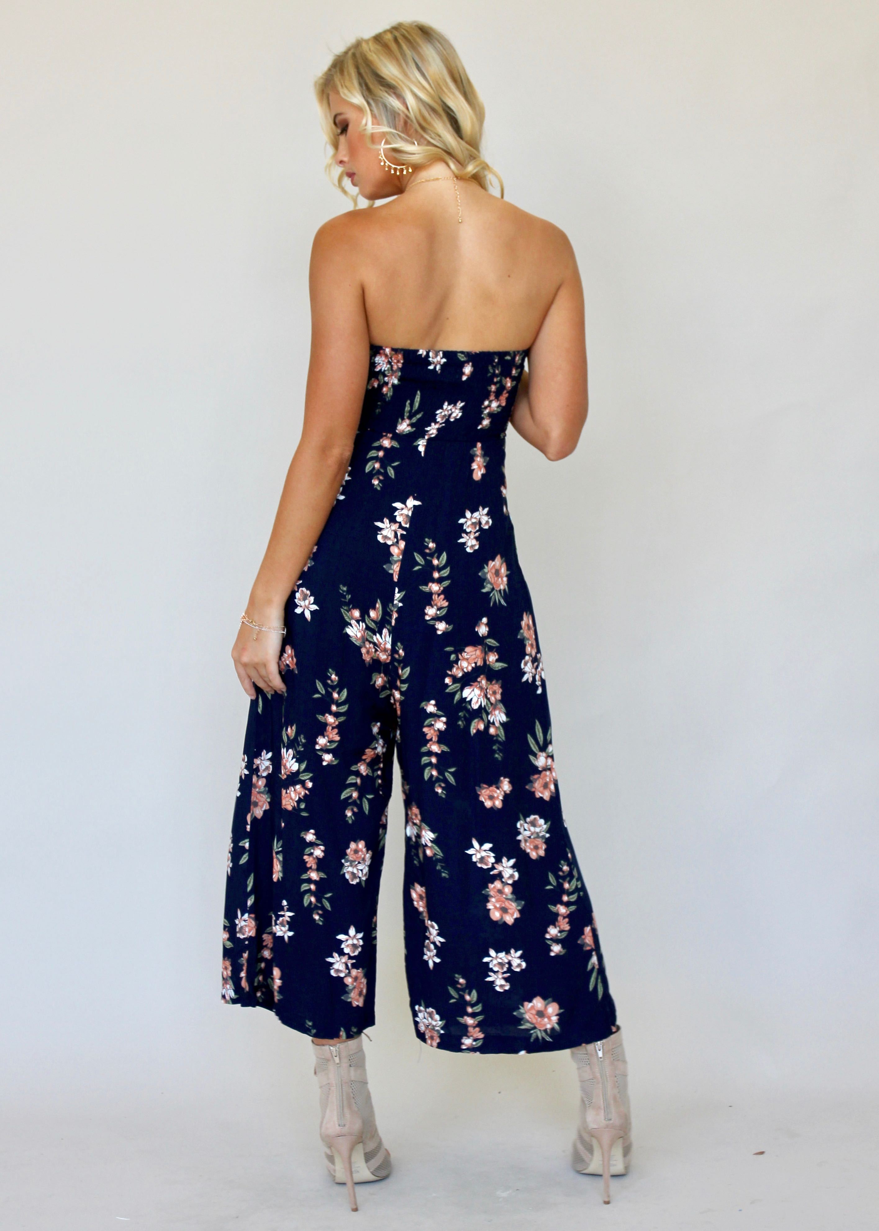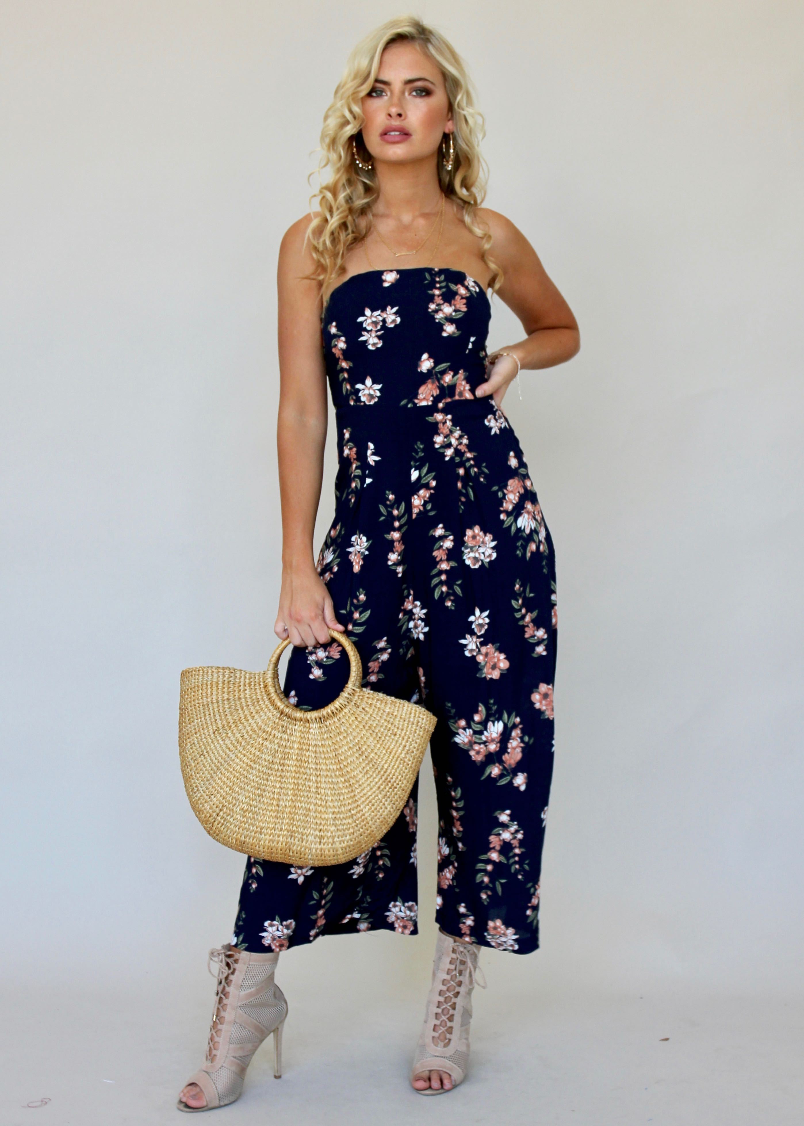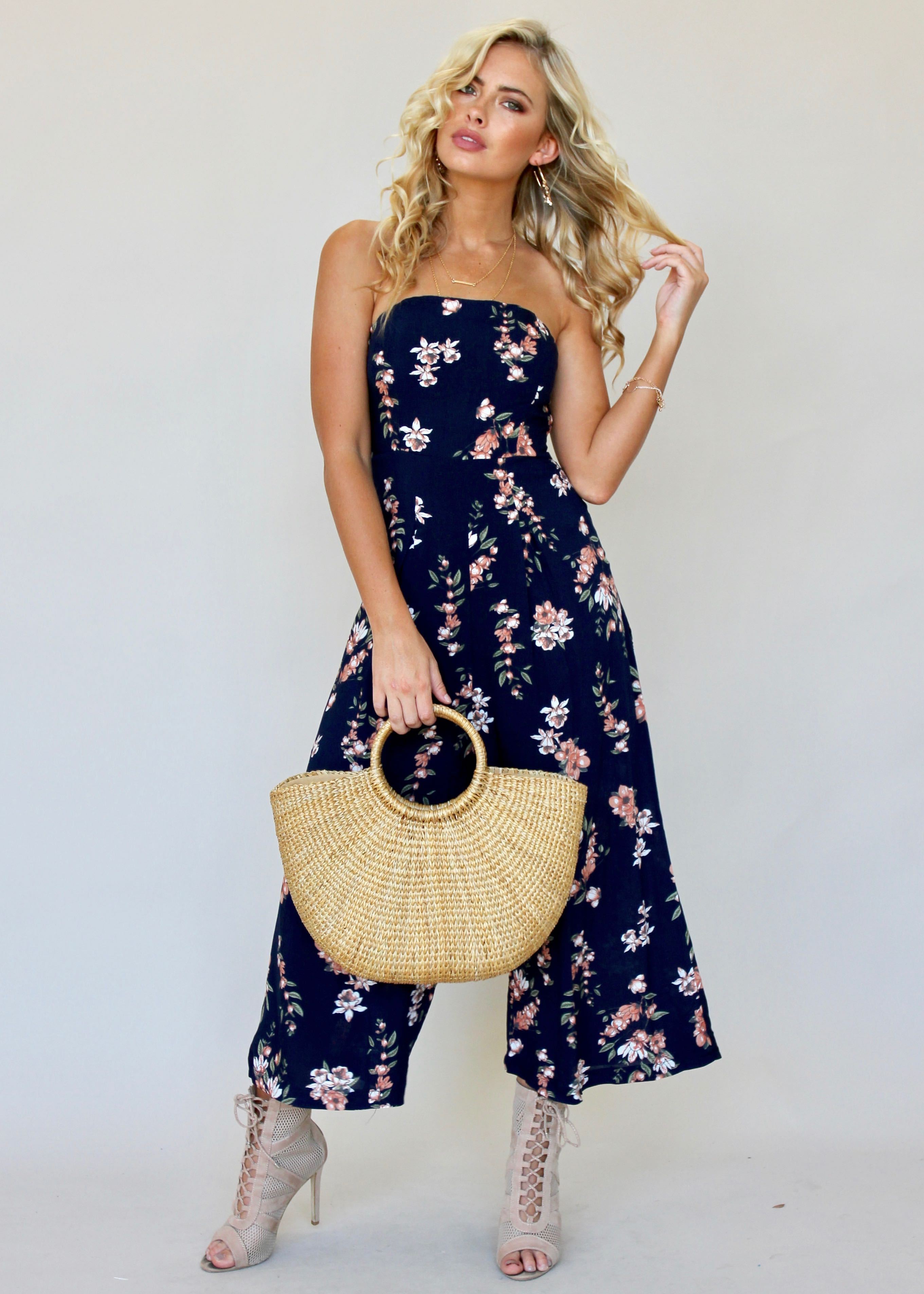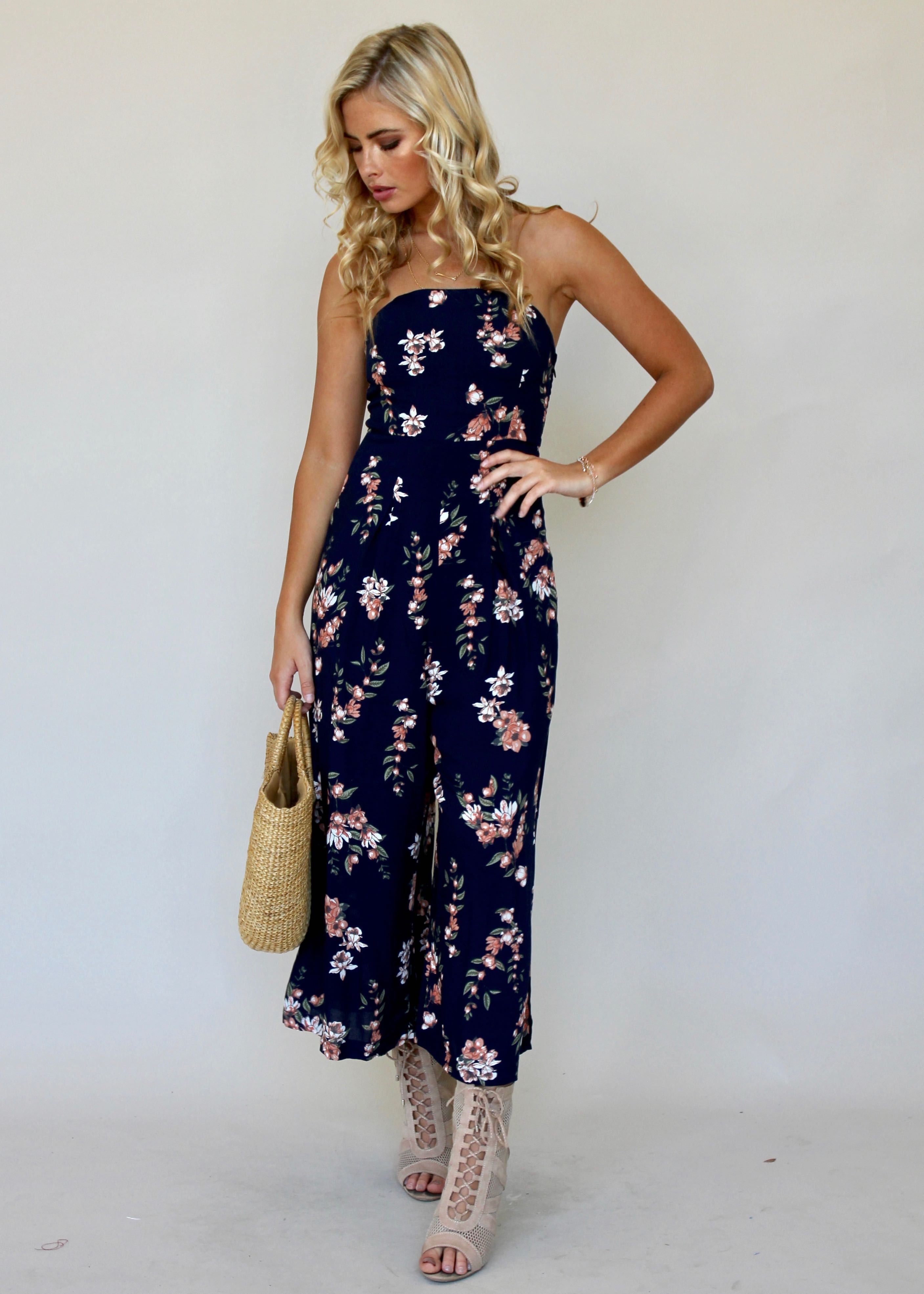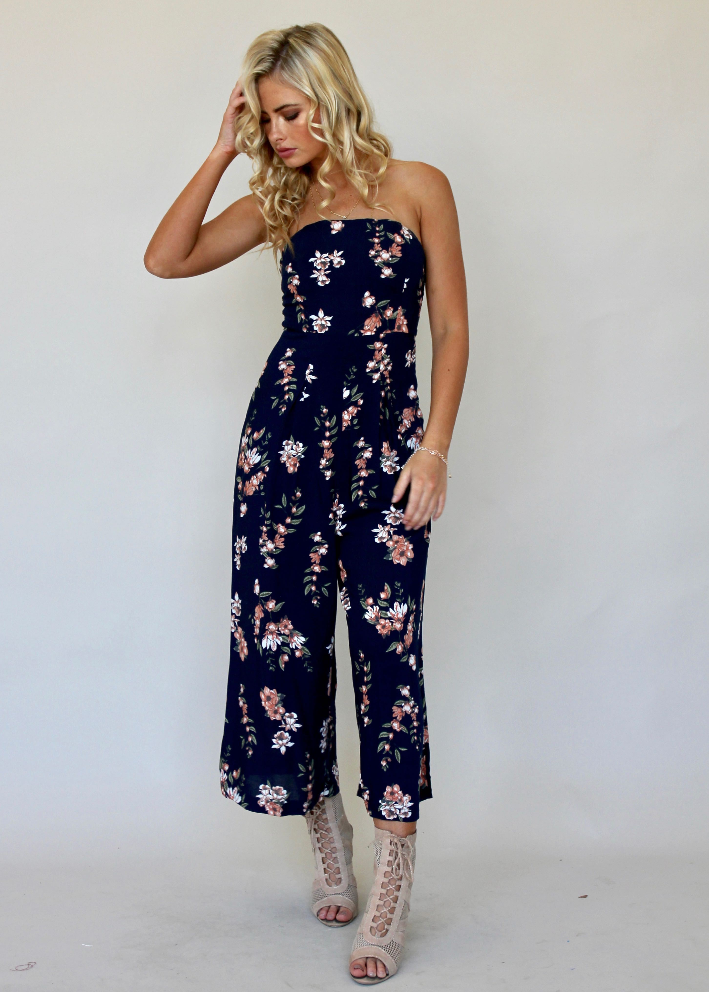 Chic off the shoulder pantsuit with padded bust and an easy to wear dark floral print.