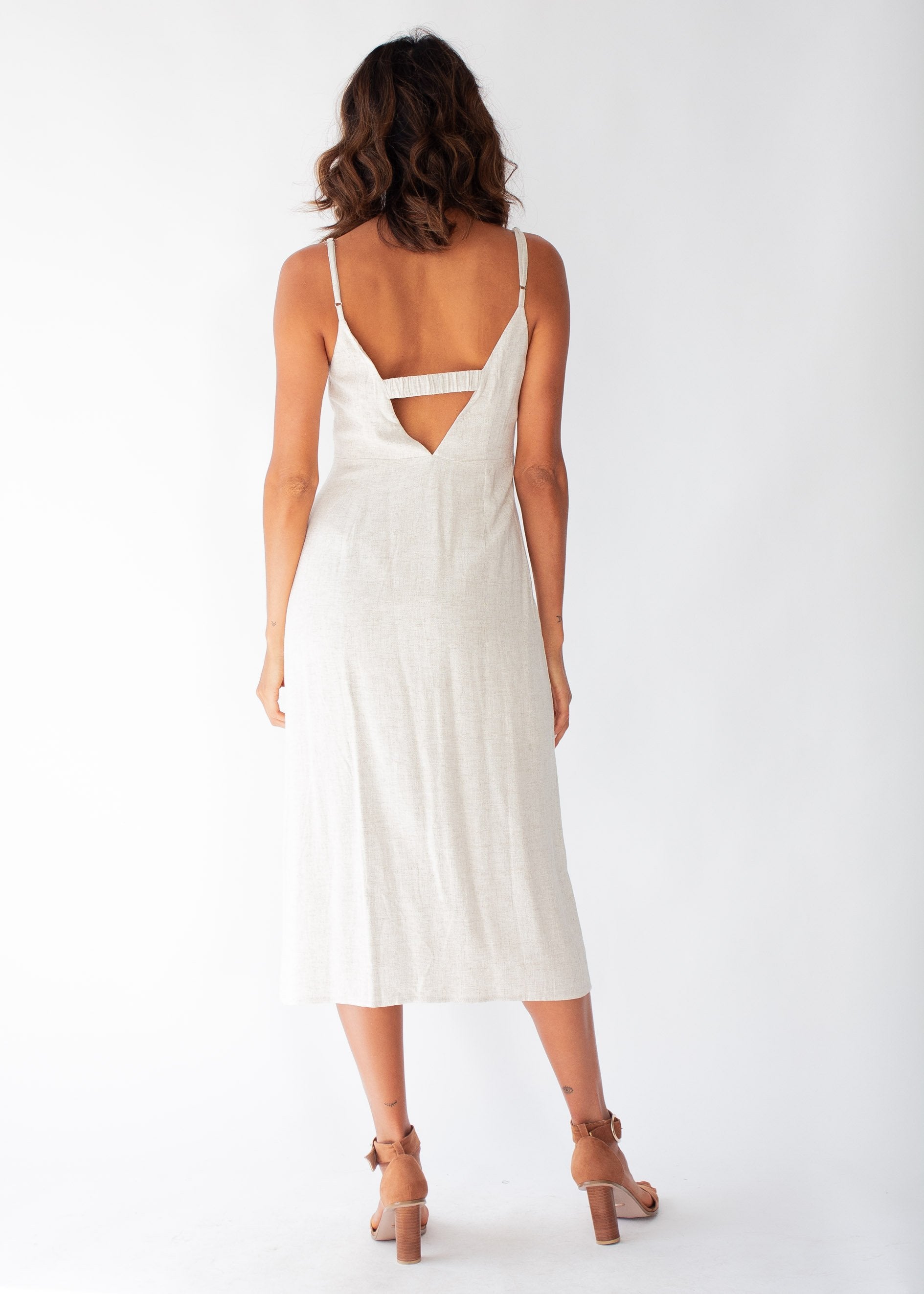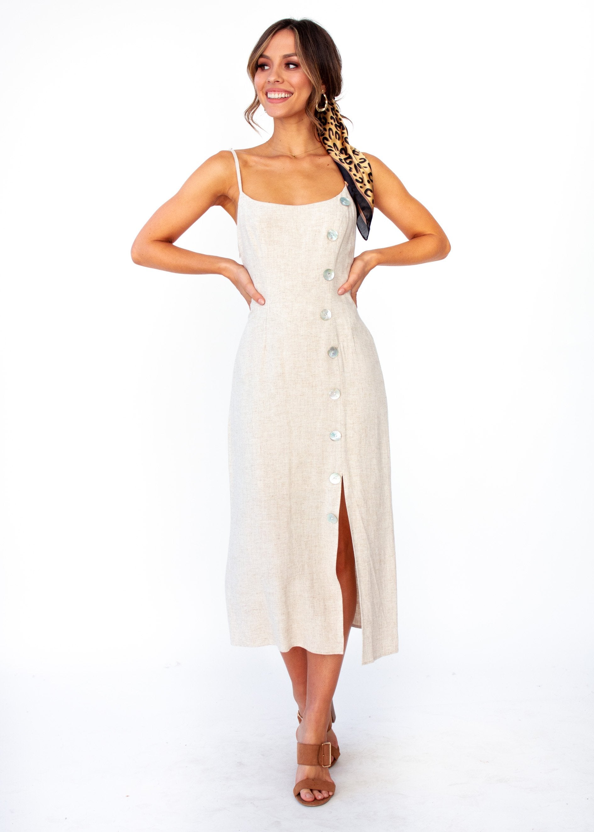 Bring the heat this season in this gorgeous neutral midi dress! You'll instantly fall in love with this easy-to-wear and on trend piece.