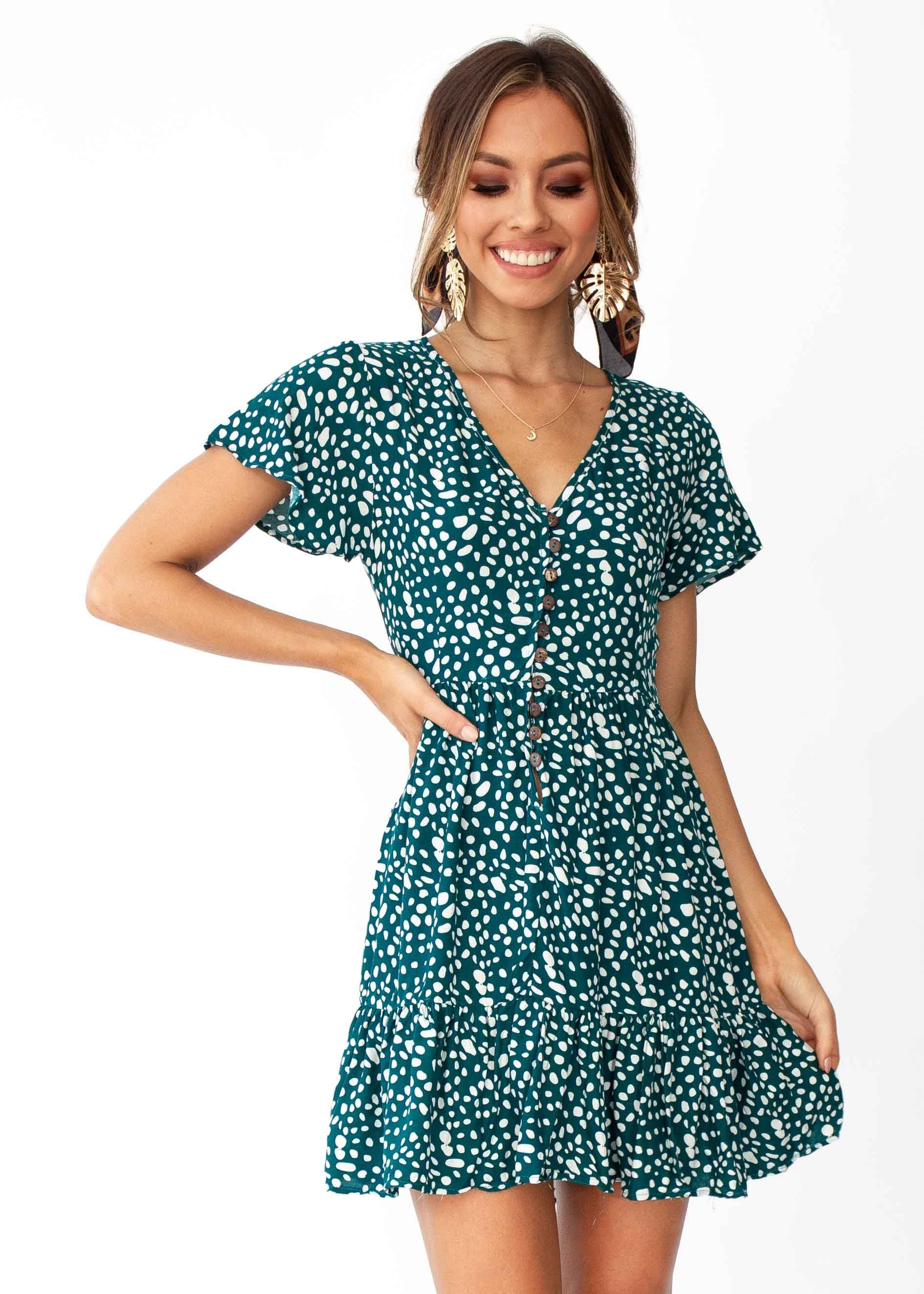 Swing into this season with the gorgeous Sumatra Dress in the flattering Emerald Spot print.