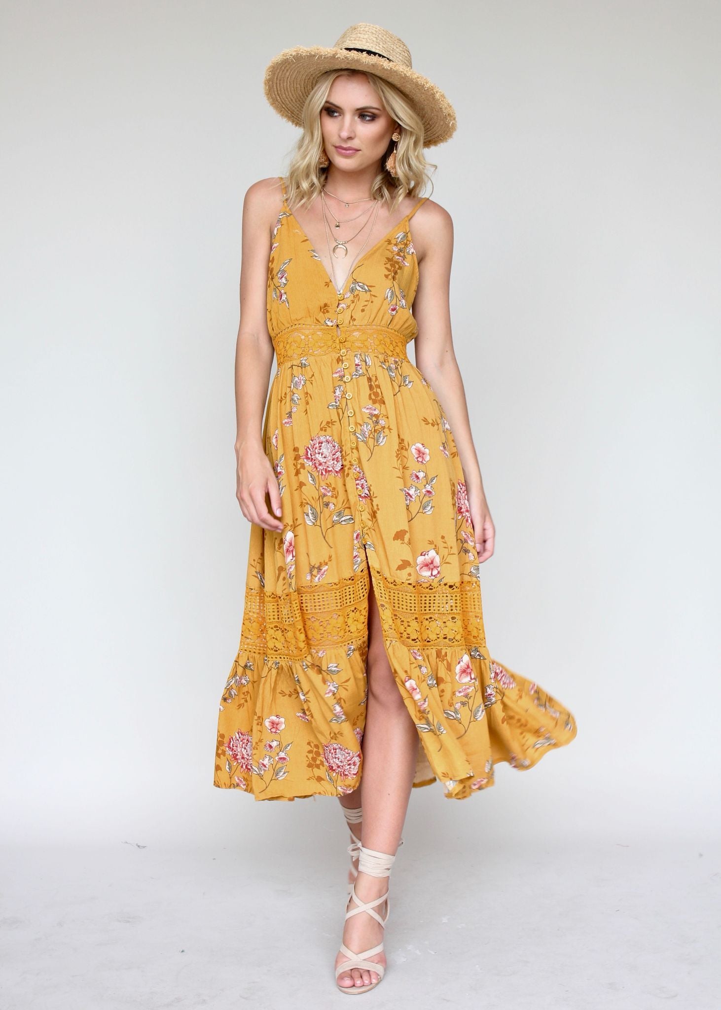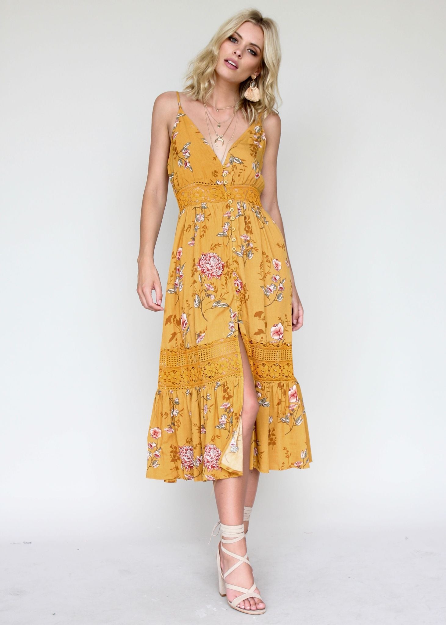Looking for the perfect Spring dress? Look no further! A delicate and easy to wear mid length dress in a gorgeous mustard floral. Perfectly paired with your go-to tan shoes and our Barca bag for a complete outfit!