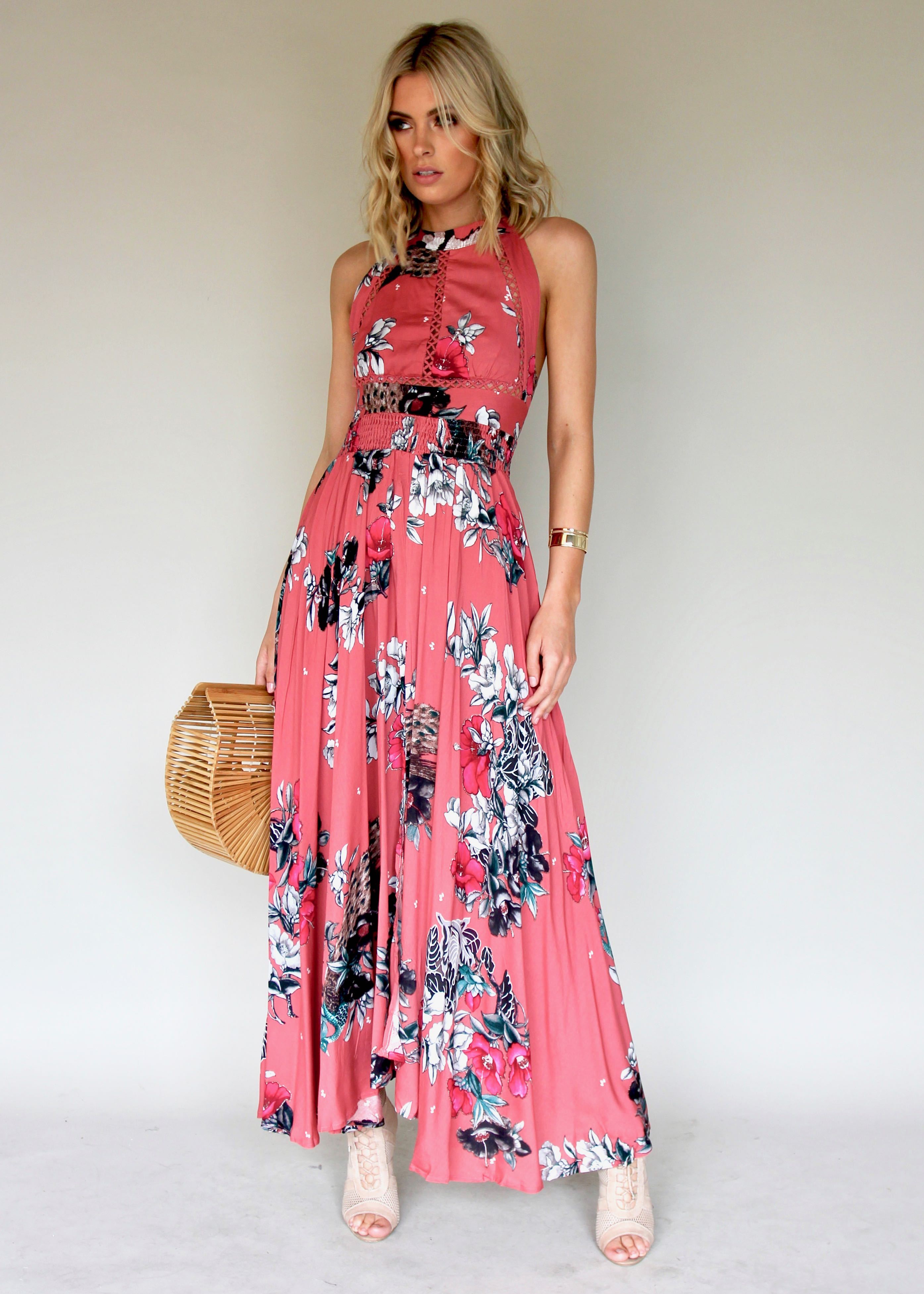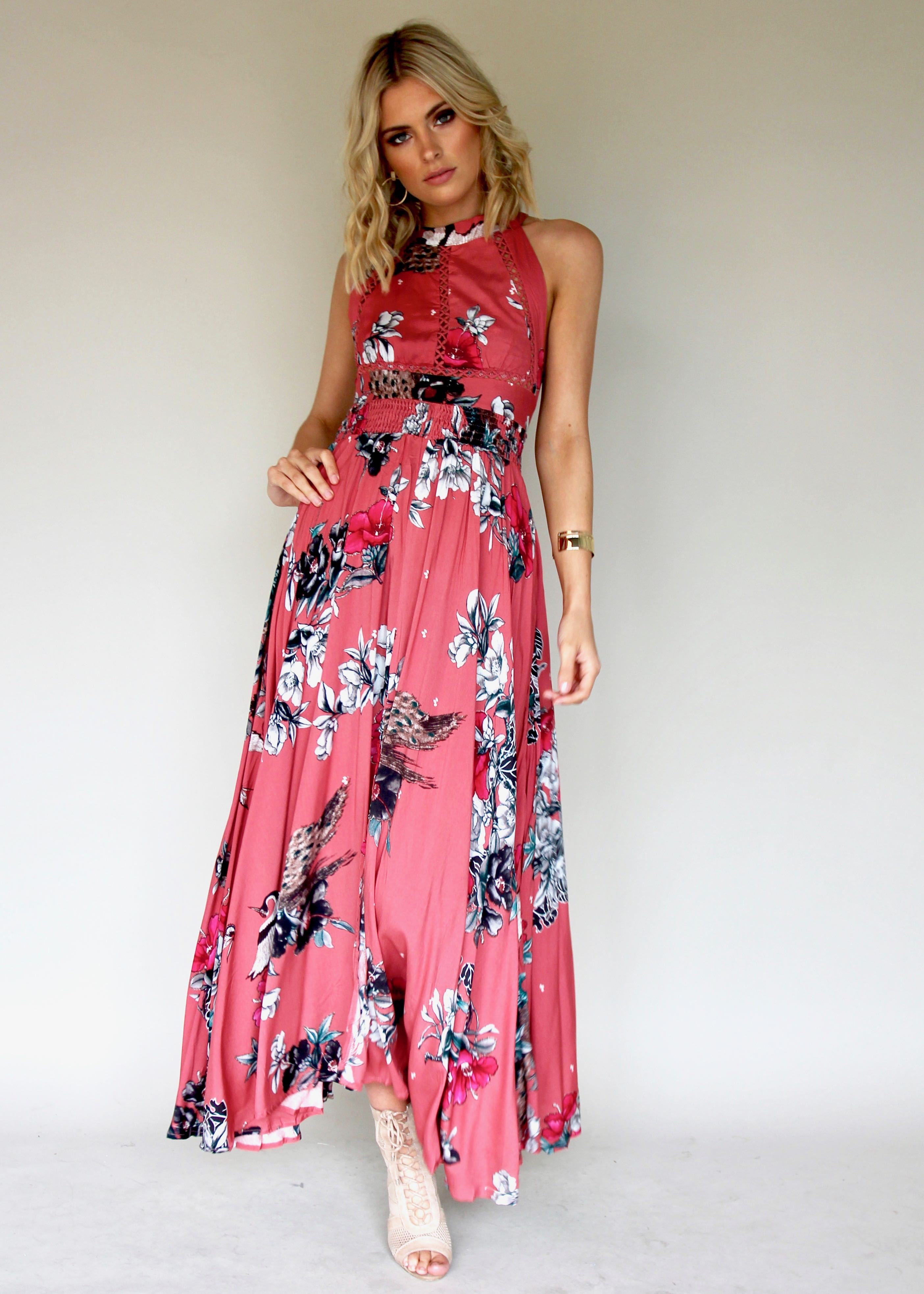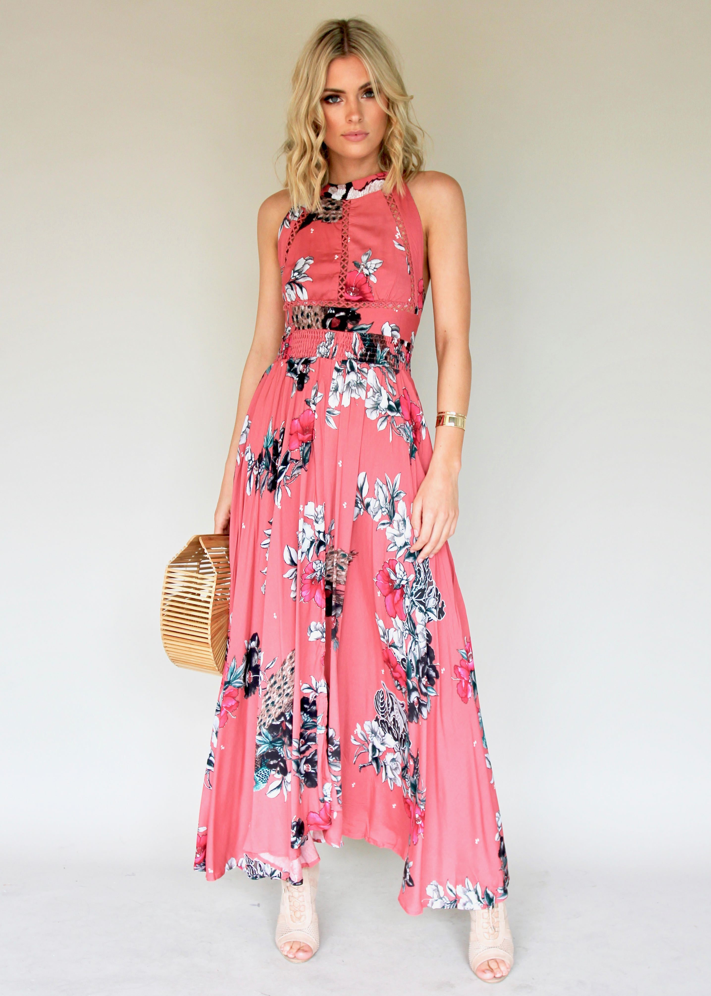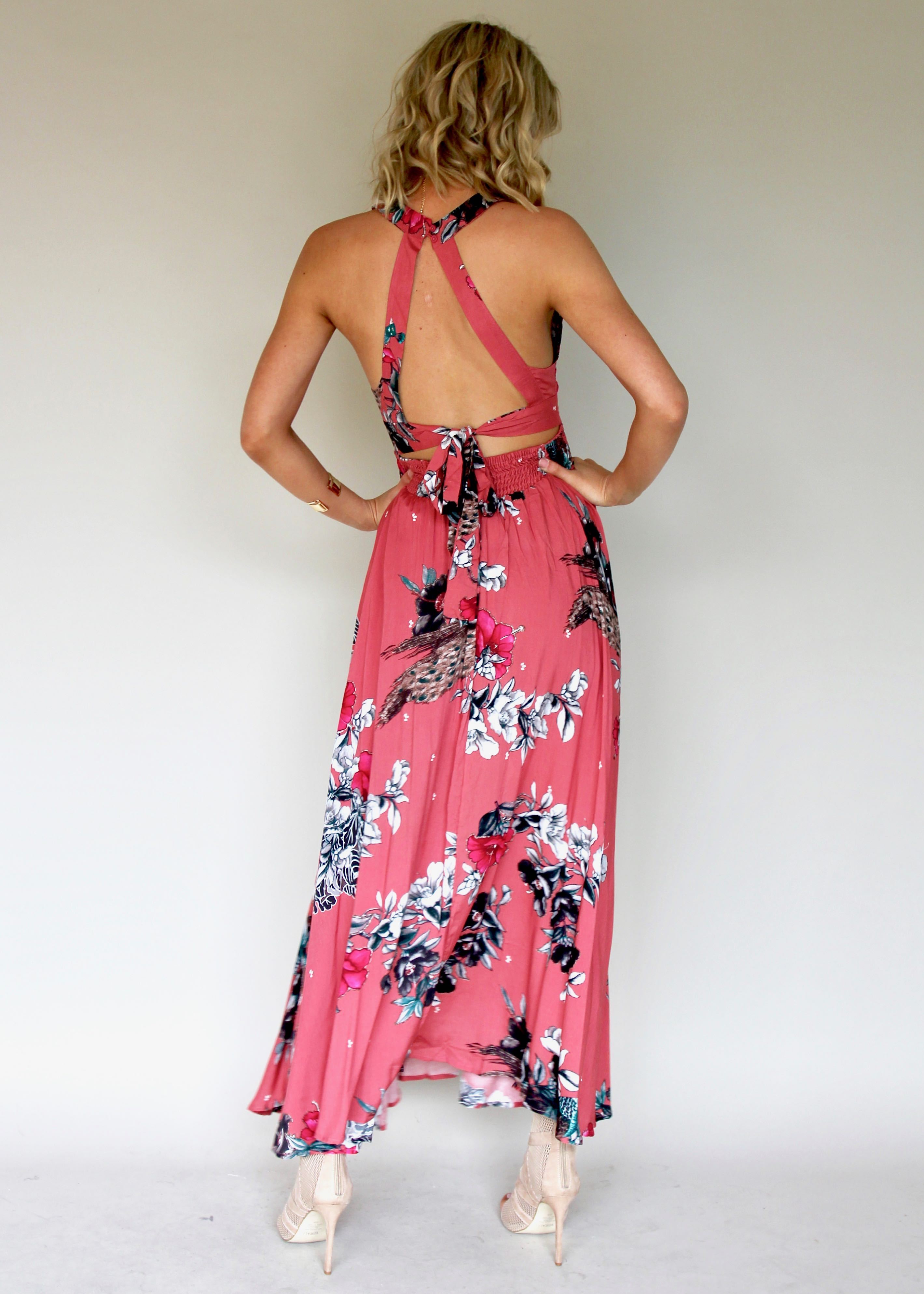 This gorgeous Break of Dawn Maxi Dress features amazing high neckline with button closure, and low back with tie.