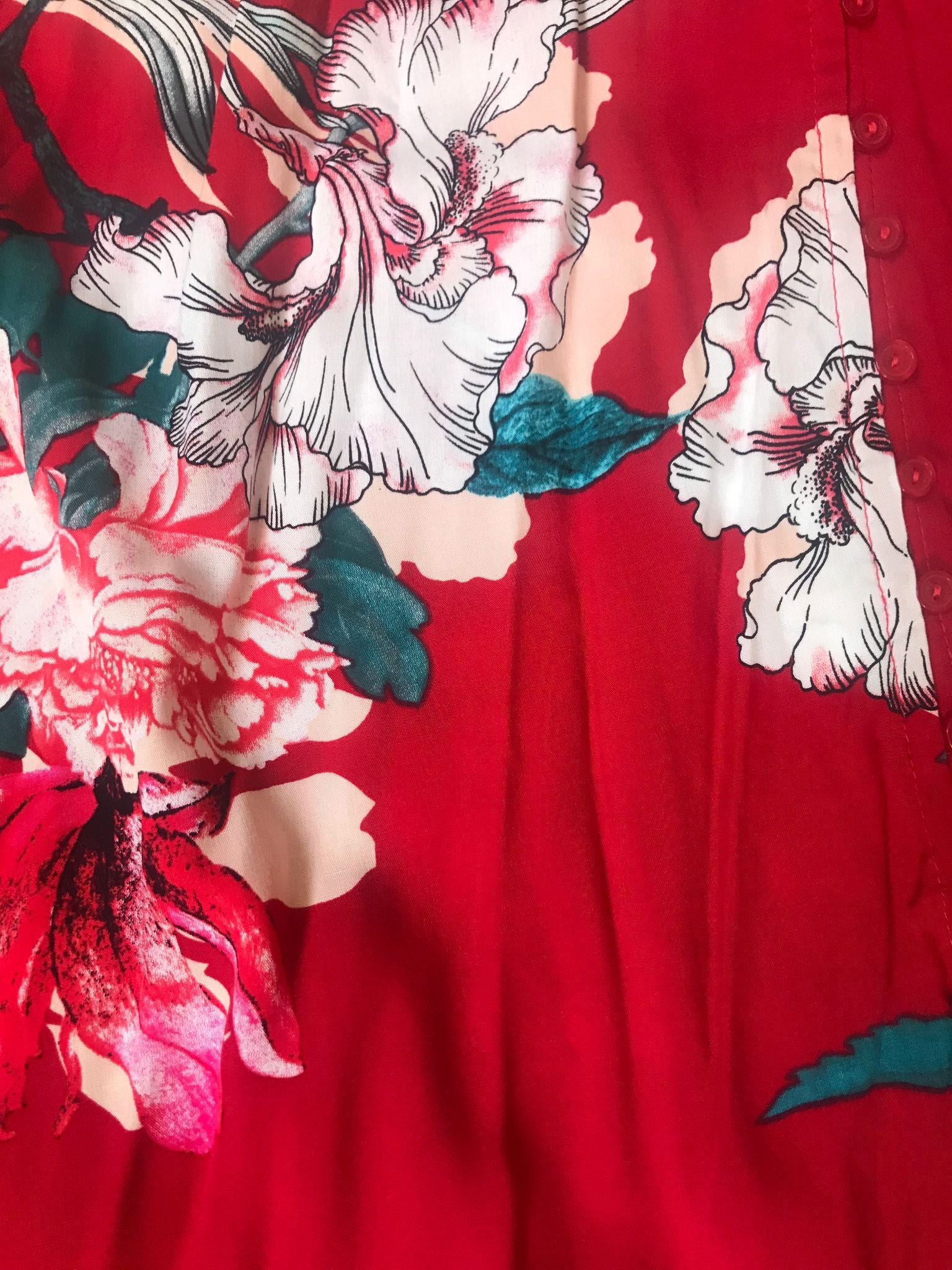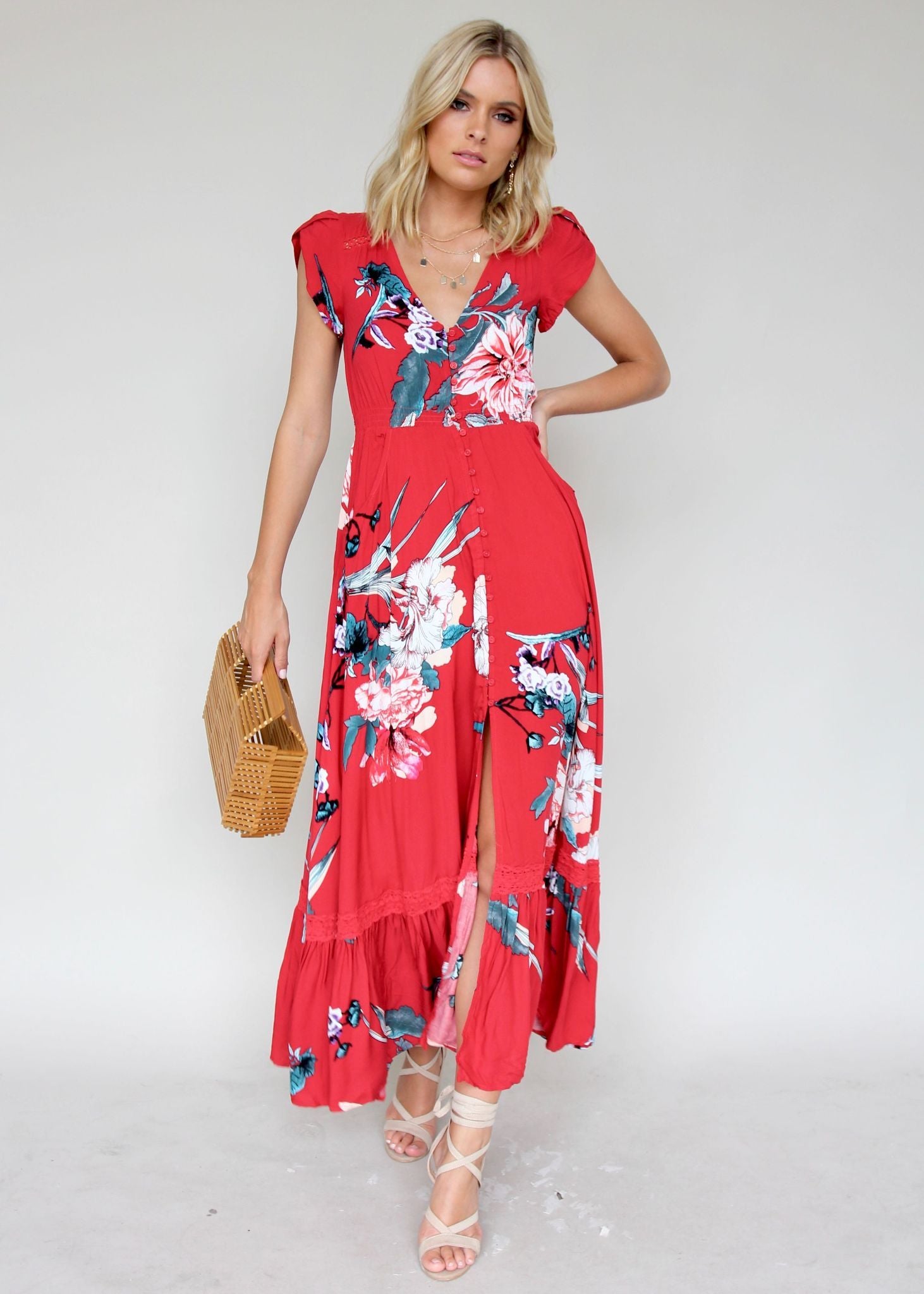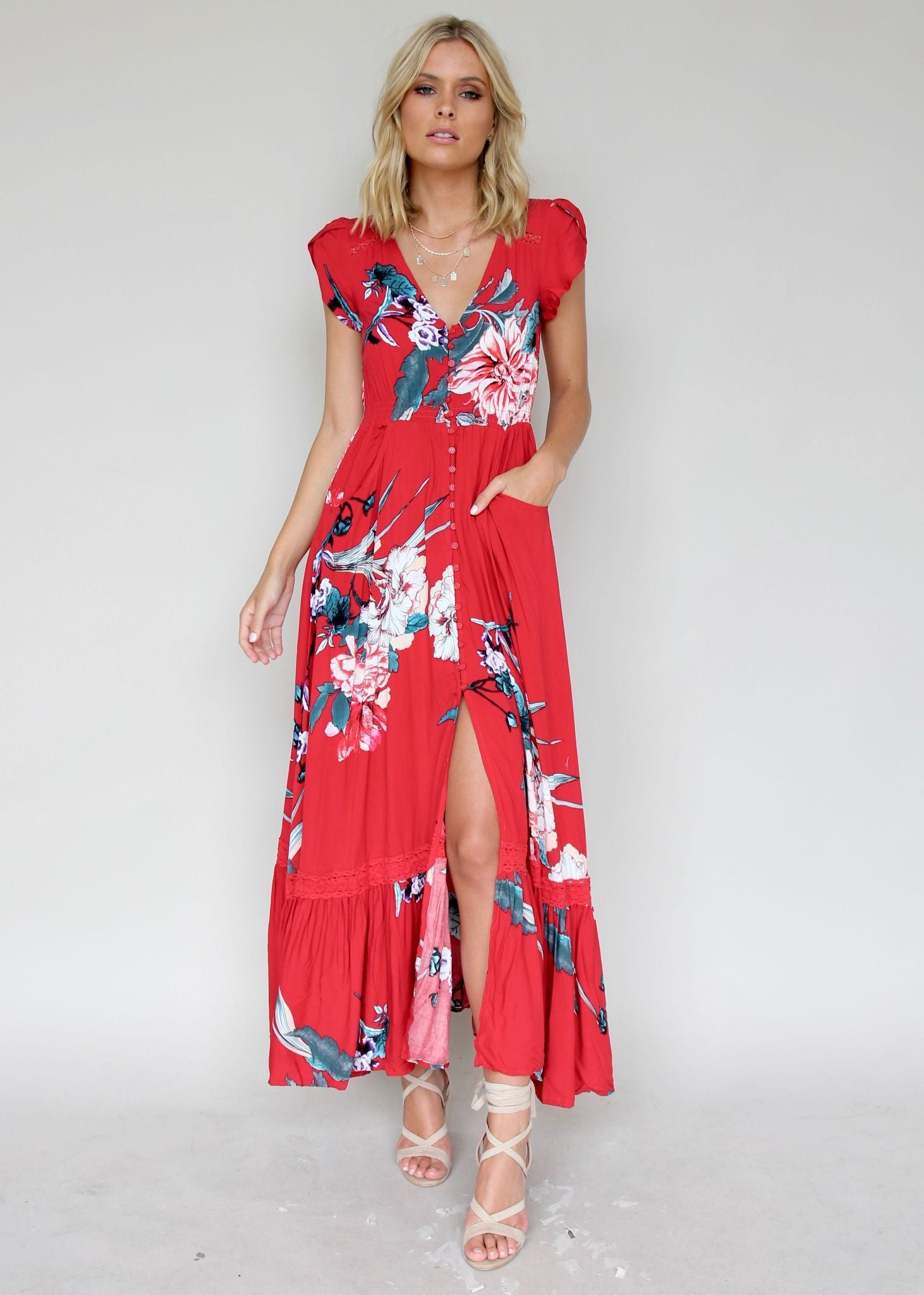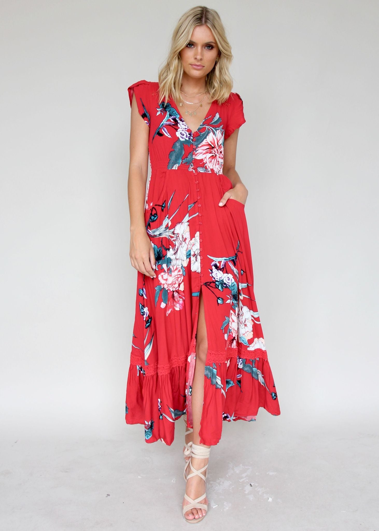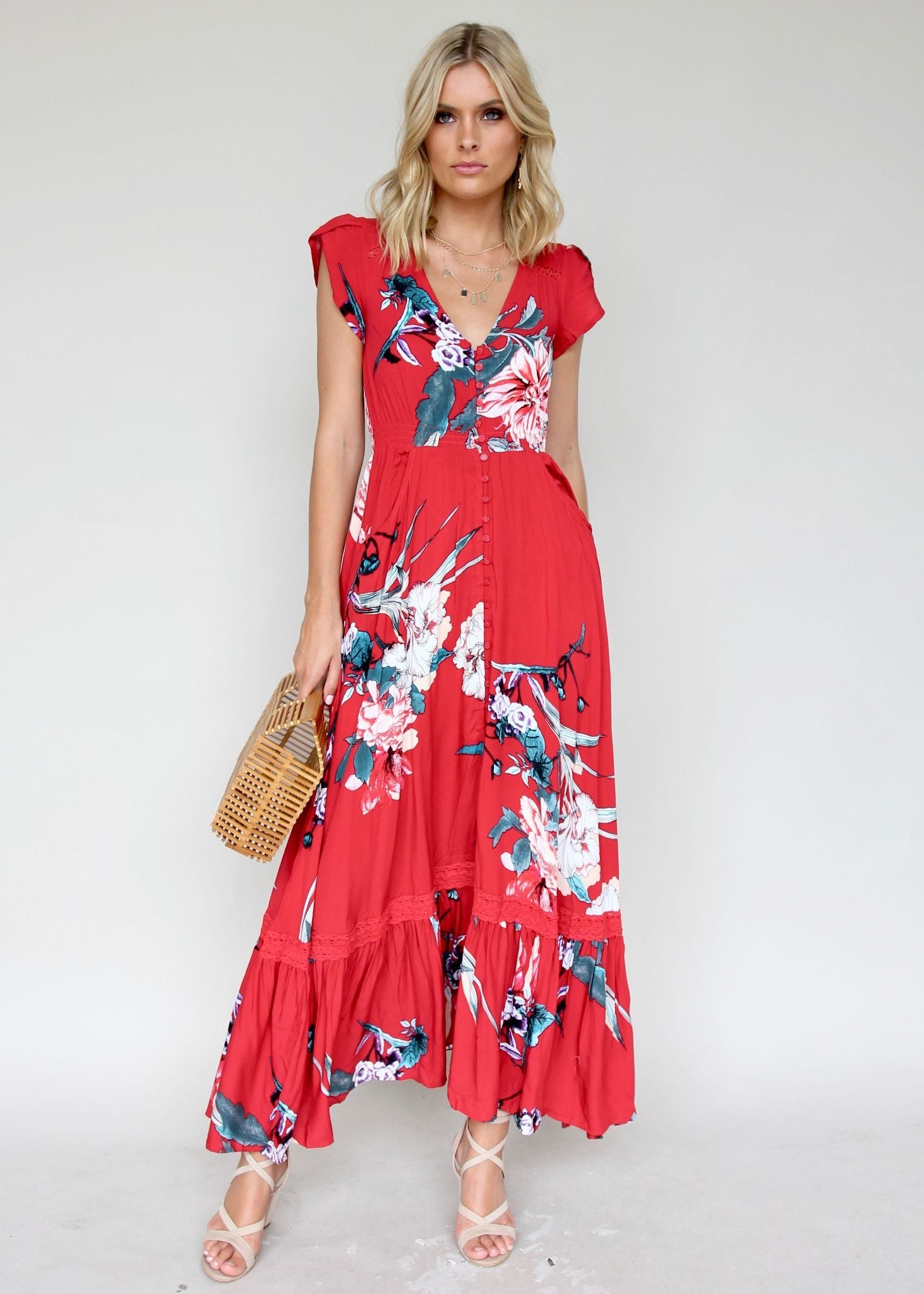 Beautiful Maxi dress with cute cap sleeves features buttons to waist. In a gorgeous red print, this is the perfect dress for the season!