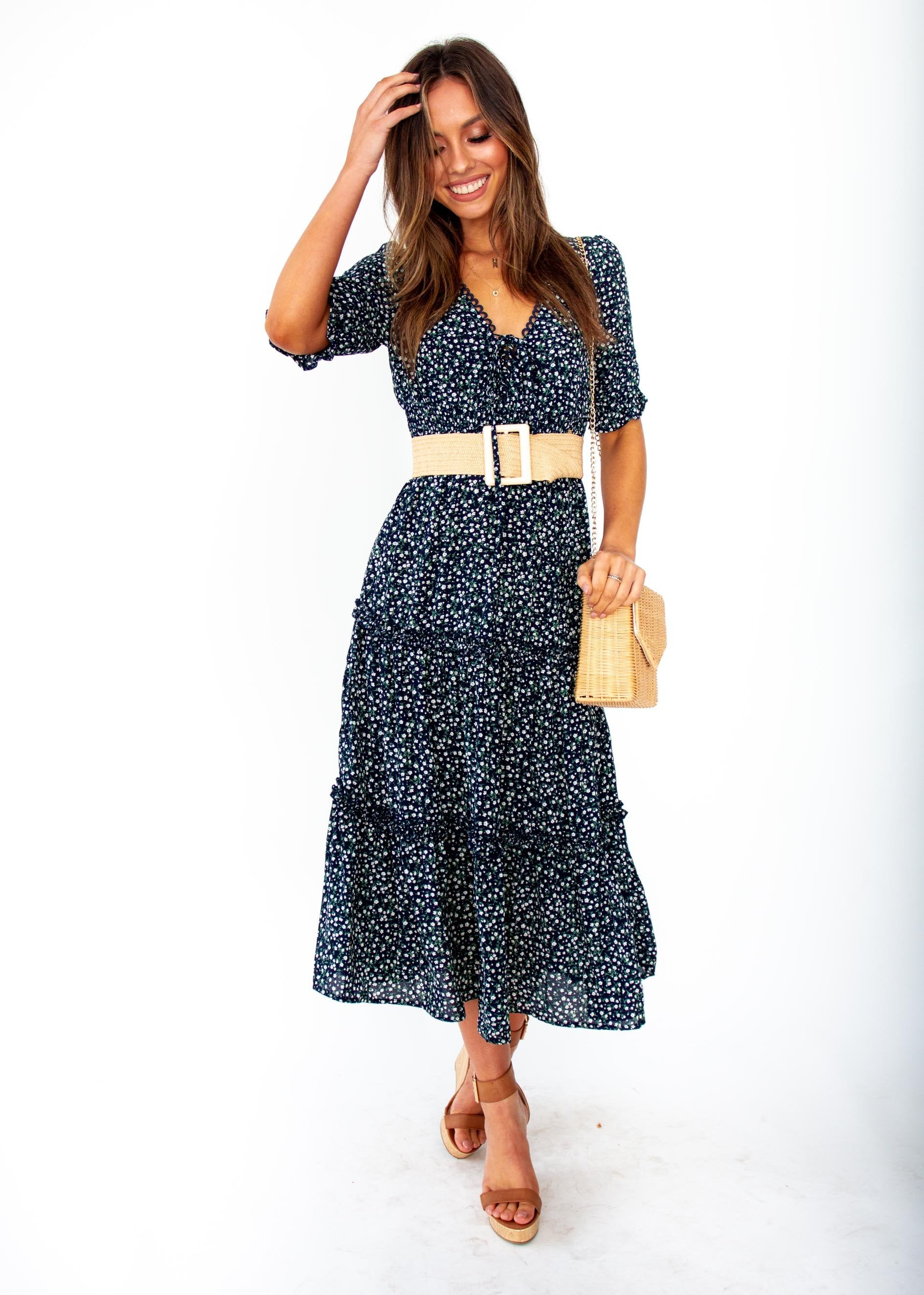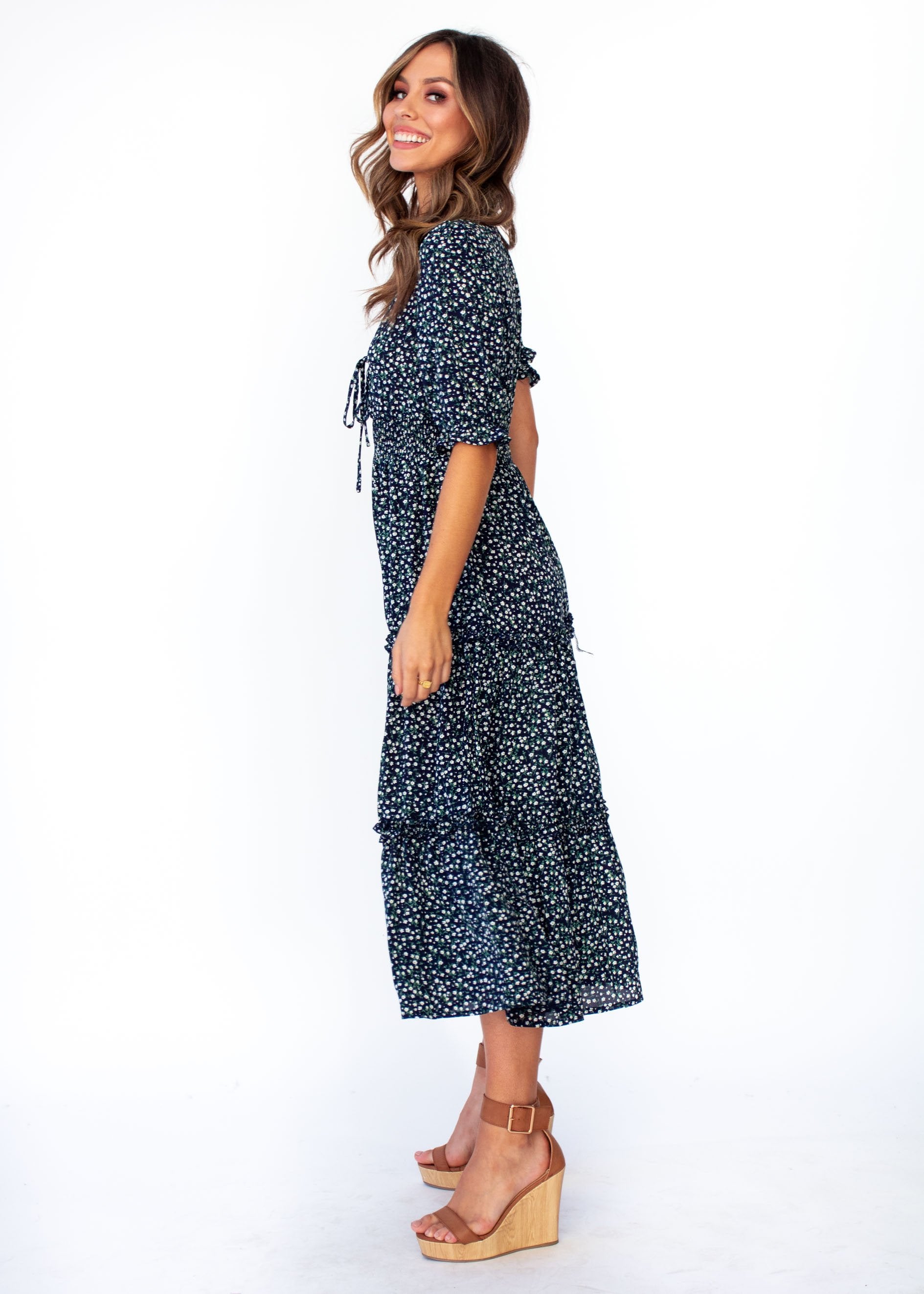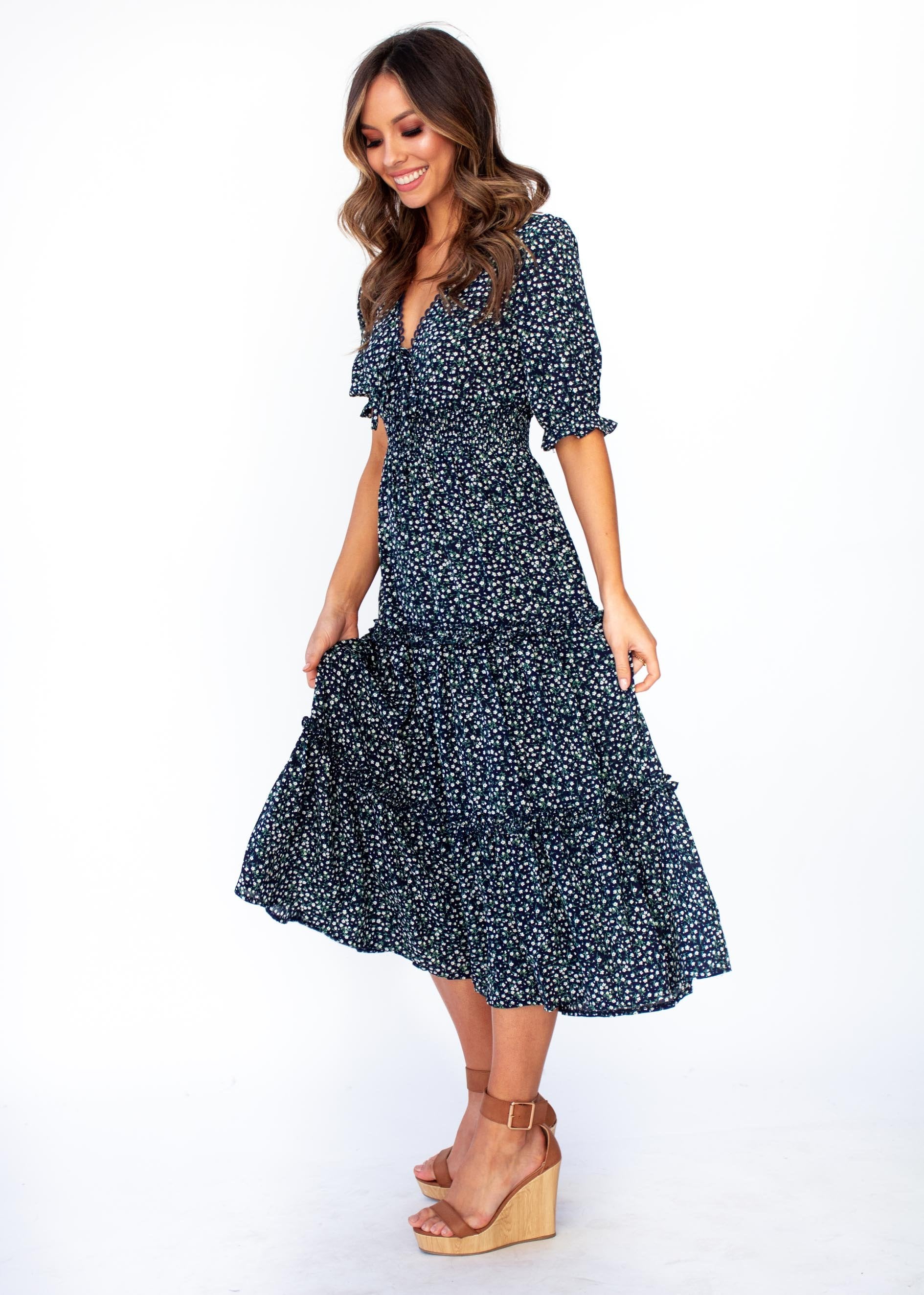 The dress to fall in love with and in, this gorgeous navy floral midi will have you feeling the romance and looking beautiful.