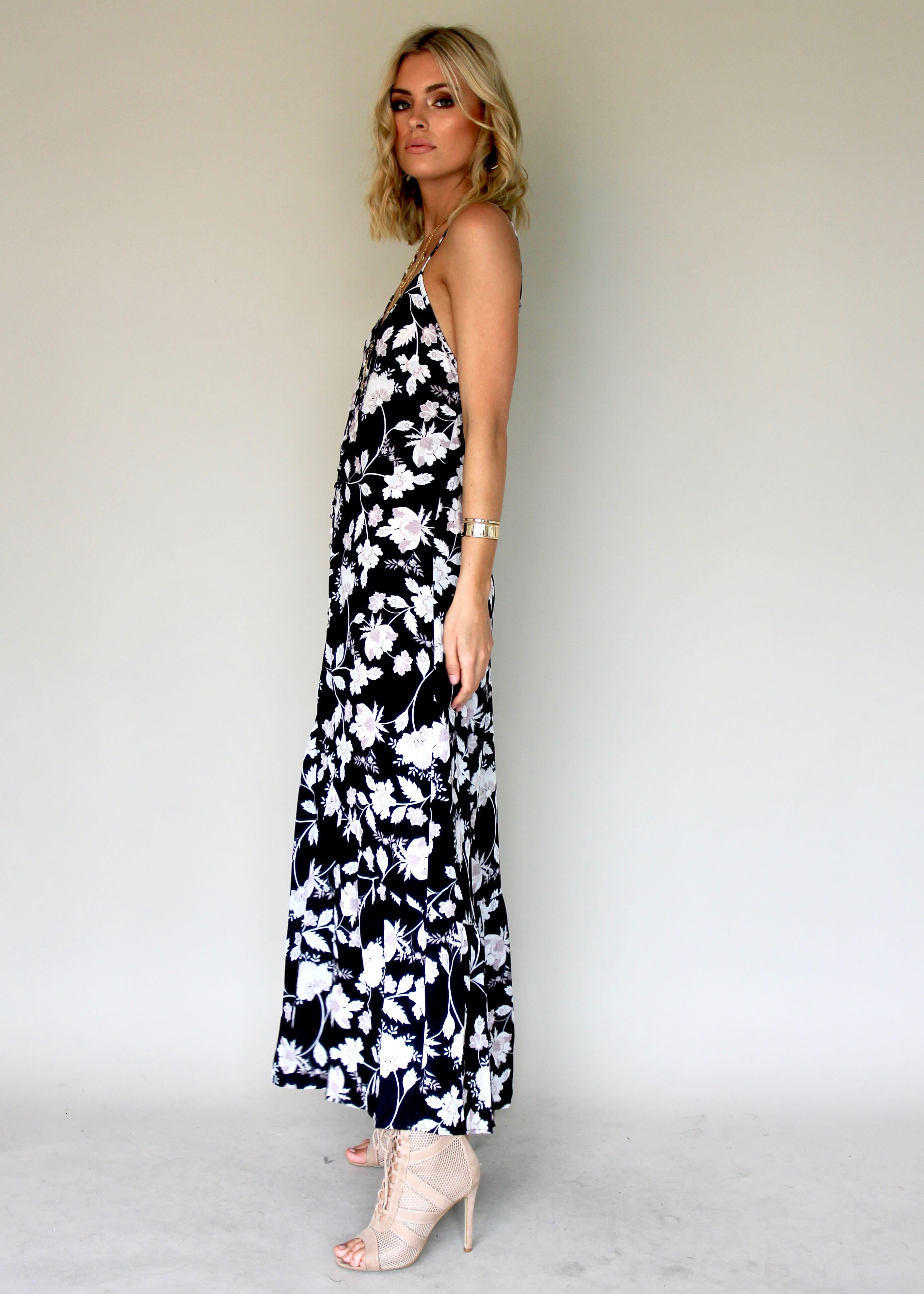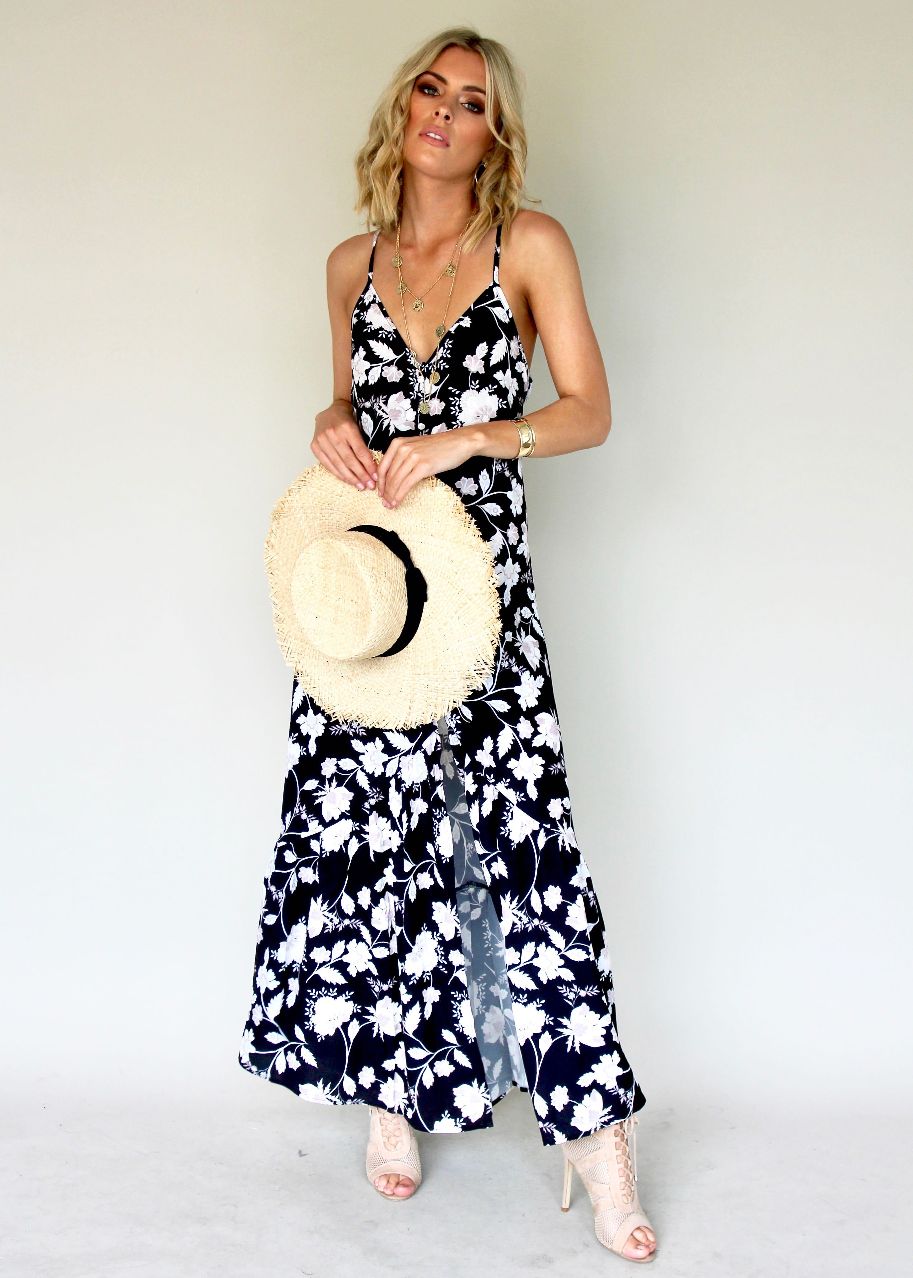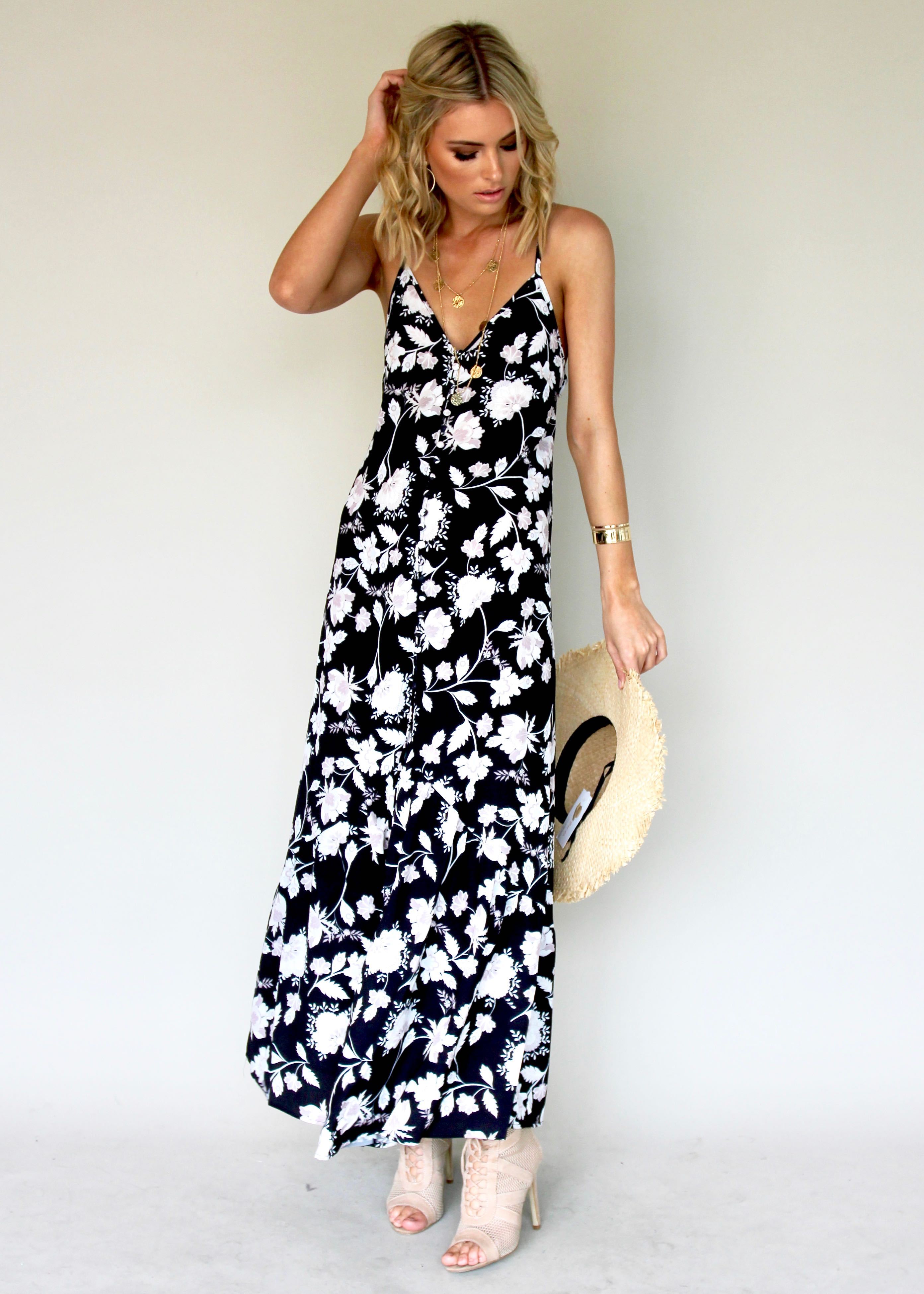 Easy to wear and the perfect piece as Spring is here! A gorgeous black floral print maxi with front button detailing will be your new go-to dress.