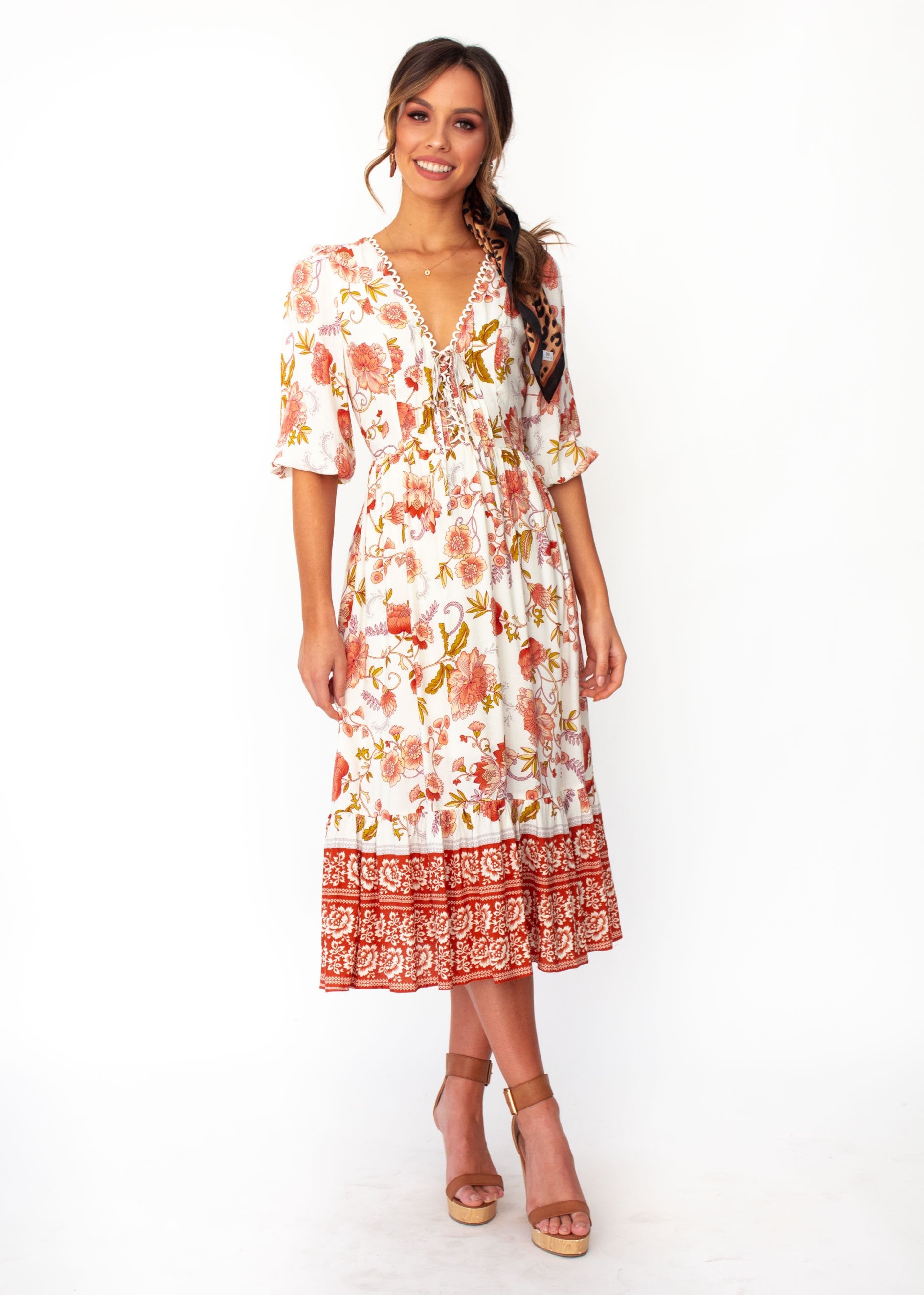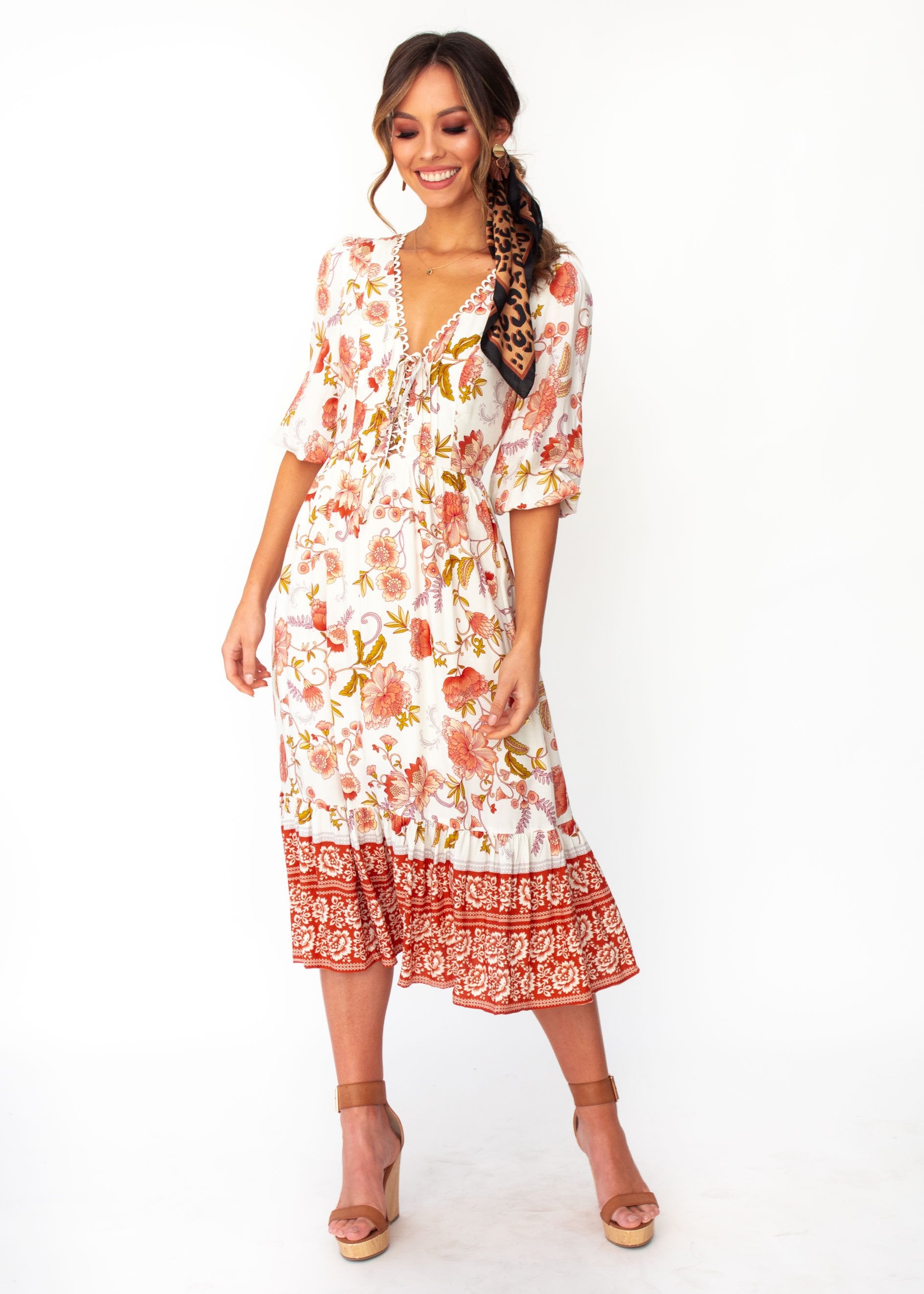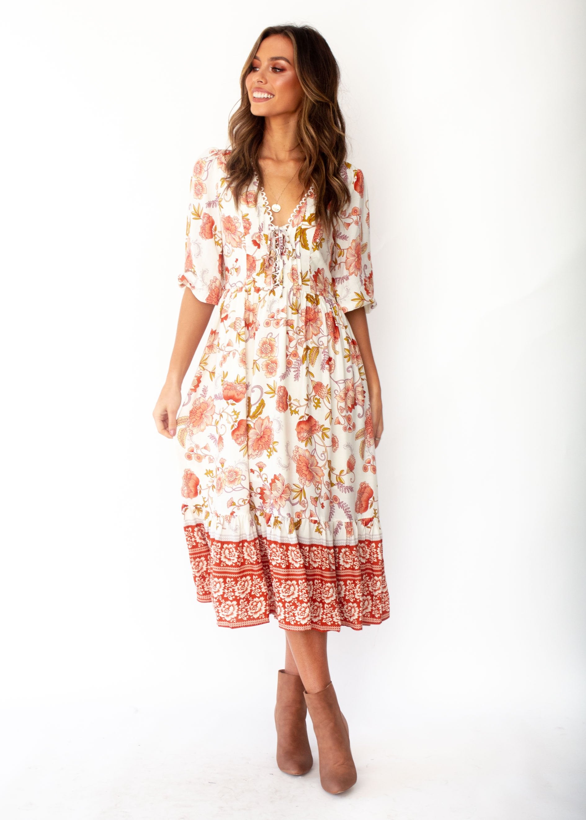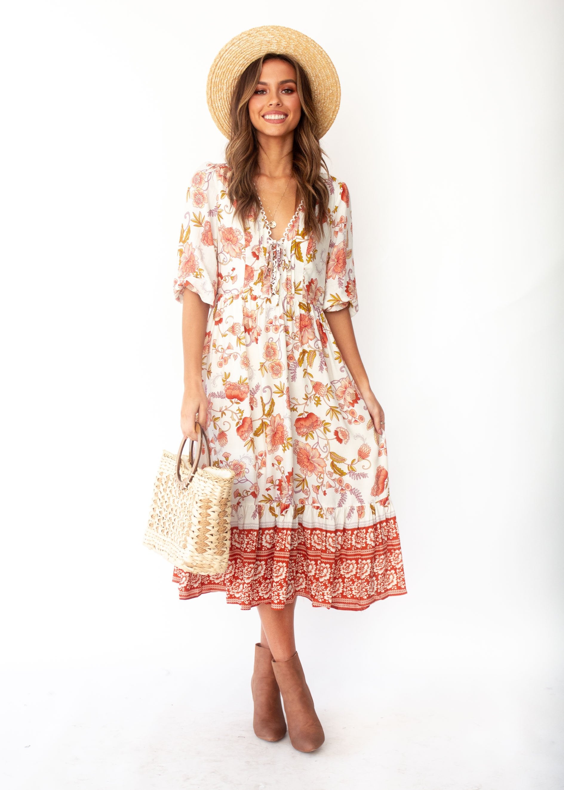 You'll fall in love with the midi dress of the season in a gorgeous white/orange floral print, perfect for Autumn.