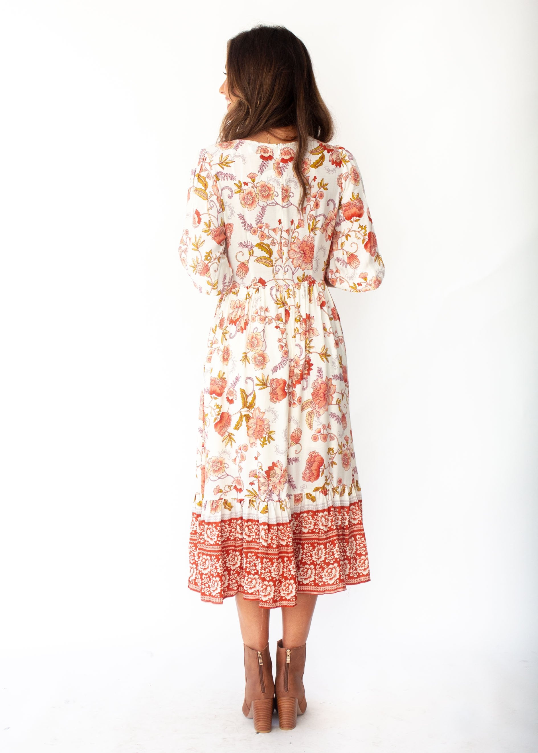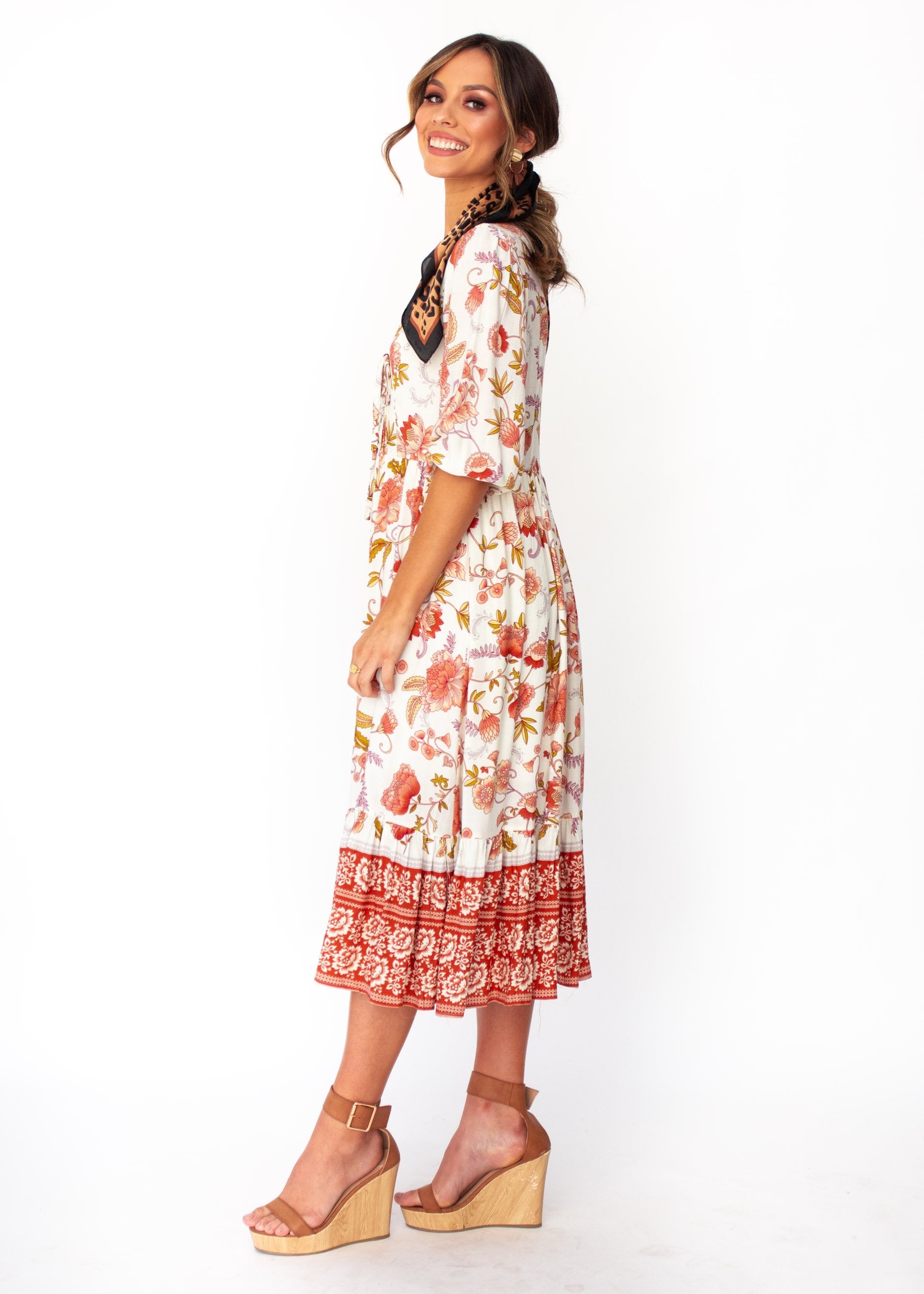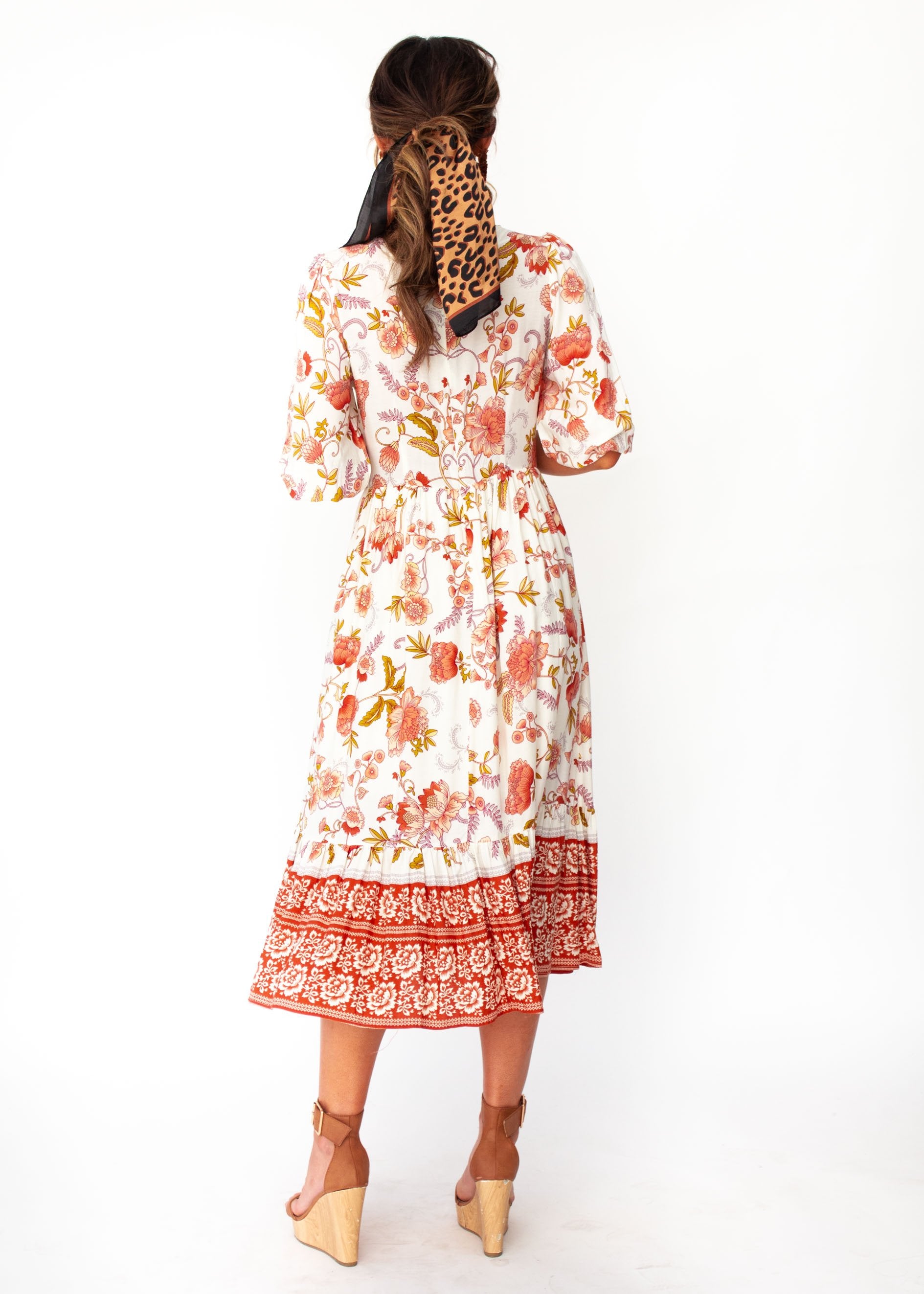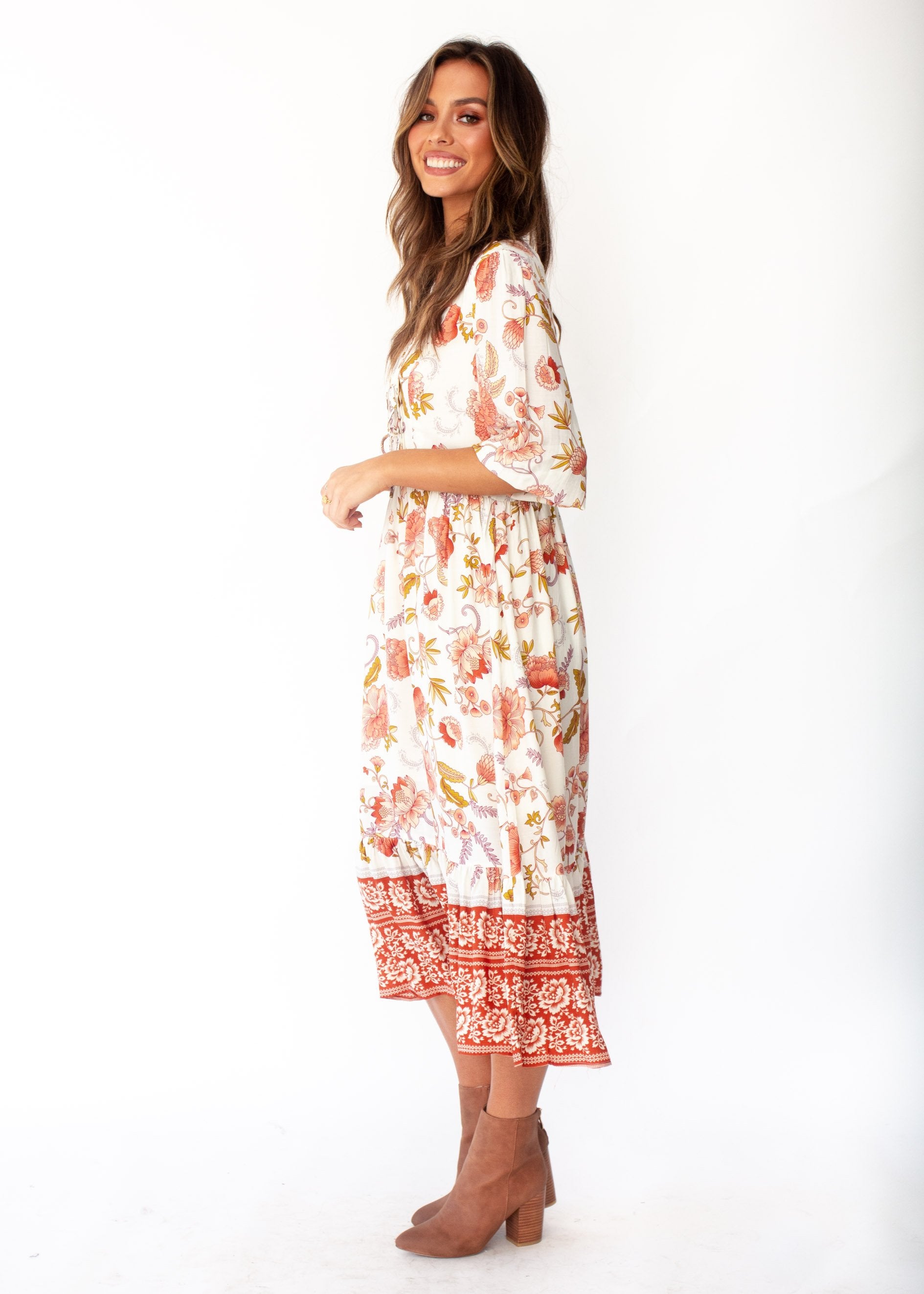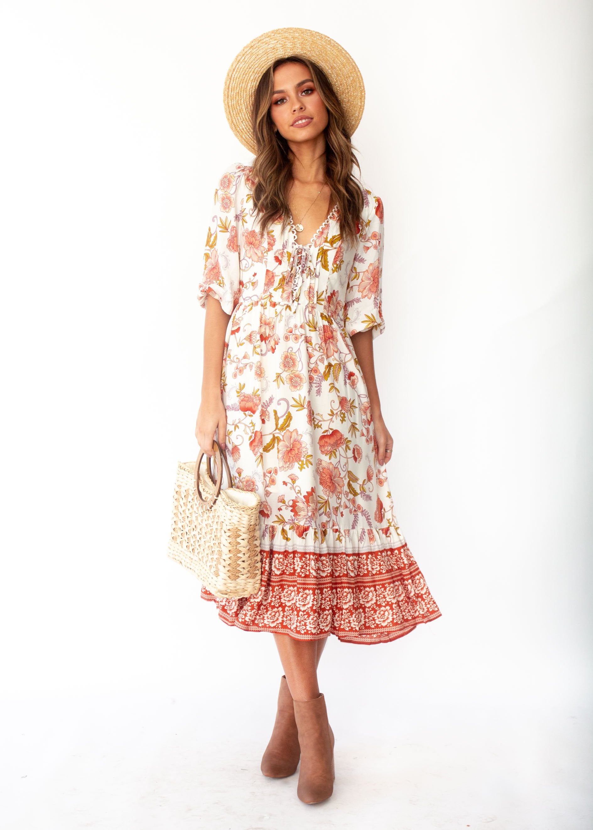 You'll fall in love with the midi dress of the season in a gorgeous white/orange floral print, perfect for Autumn.
