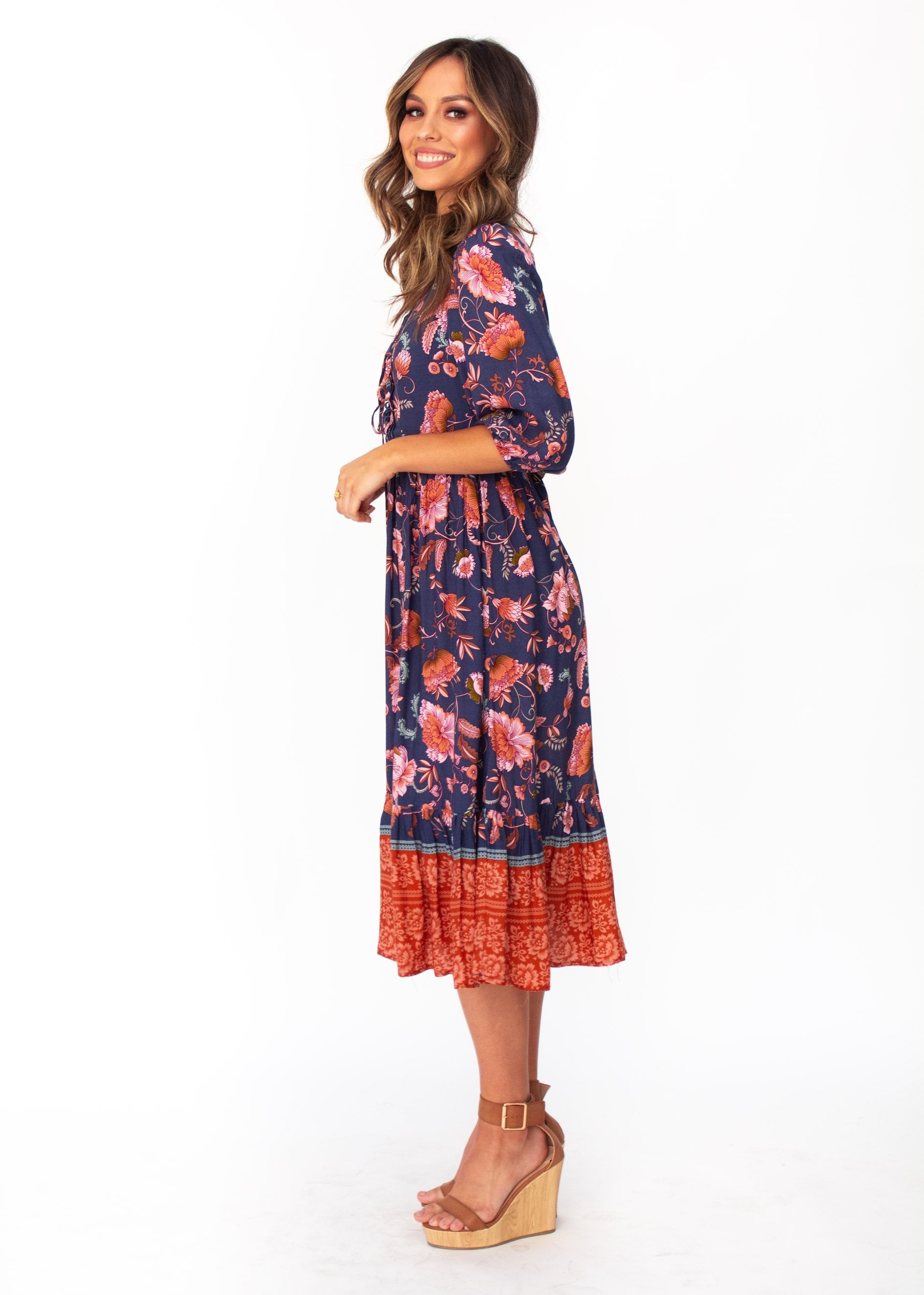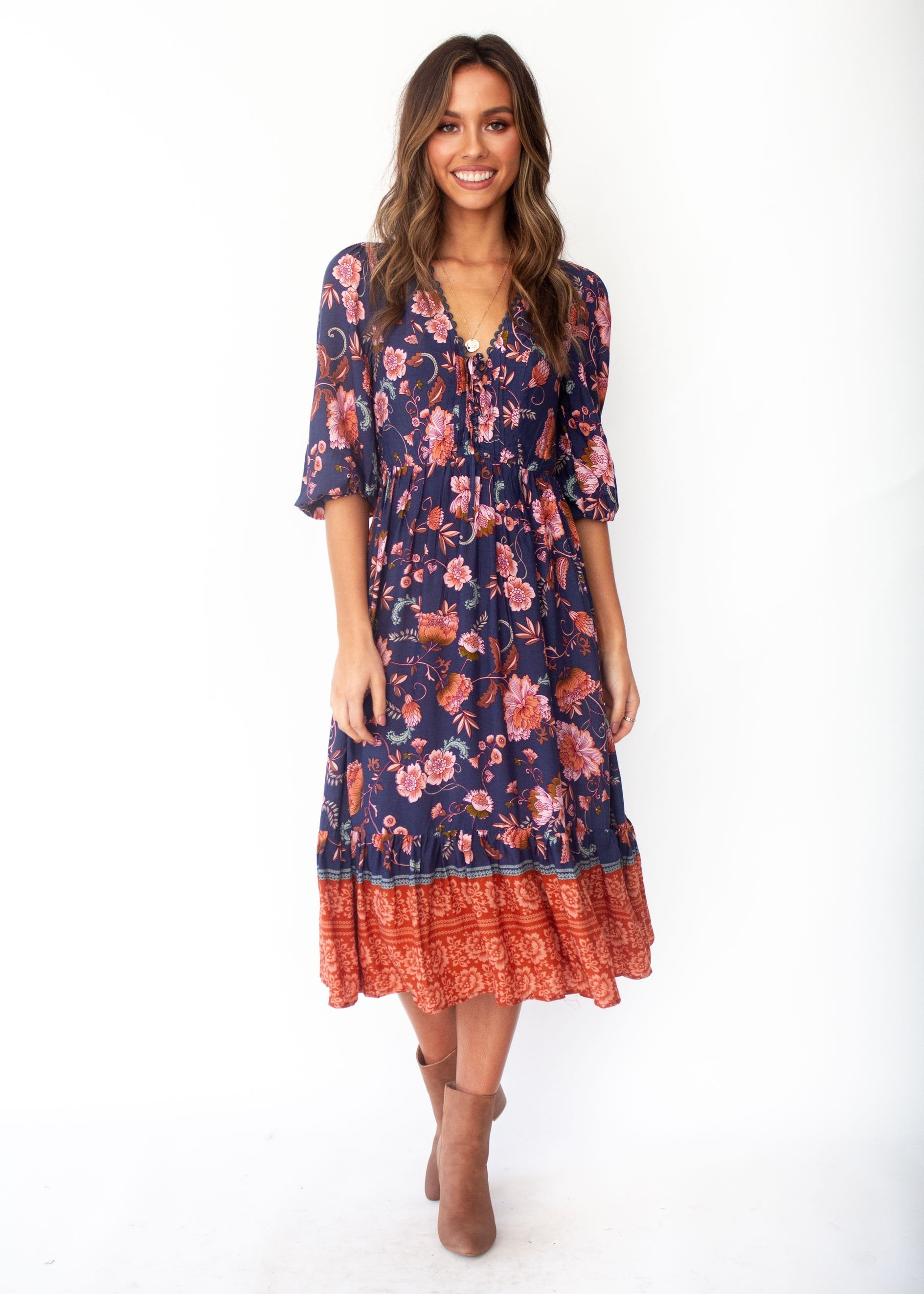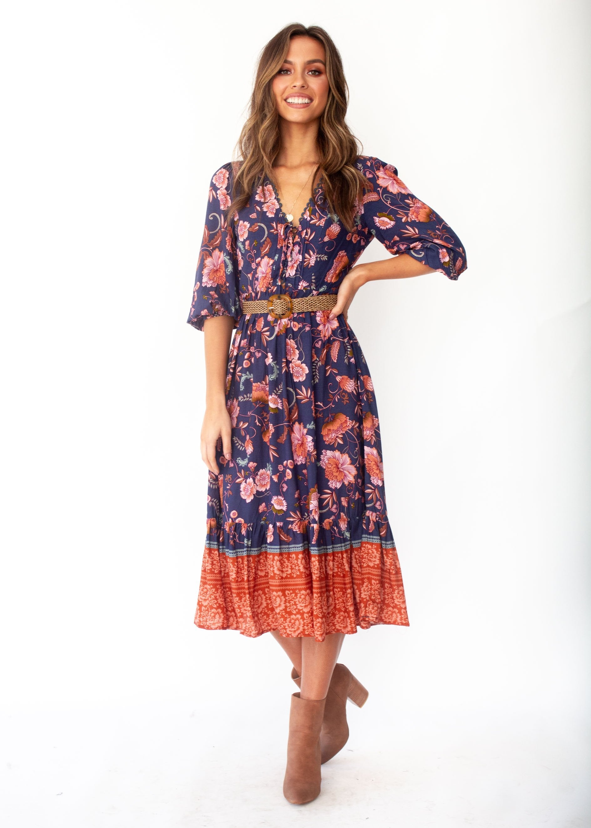 You'll fall in love with the midi dress of the season in a gorgeous navy/blush floral print, perfect for Autumn.