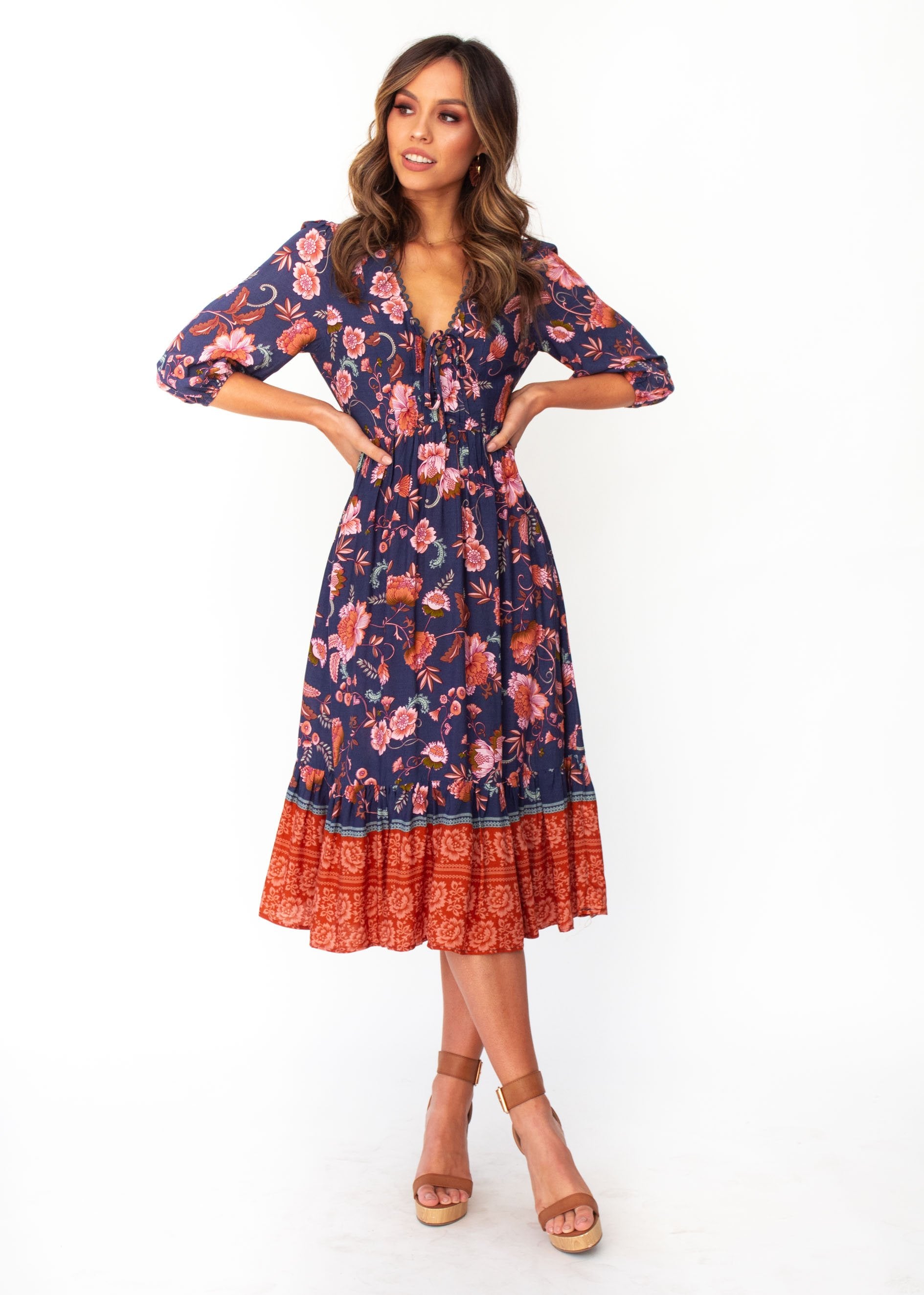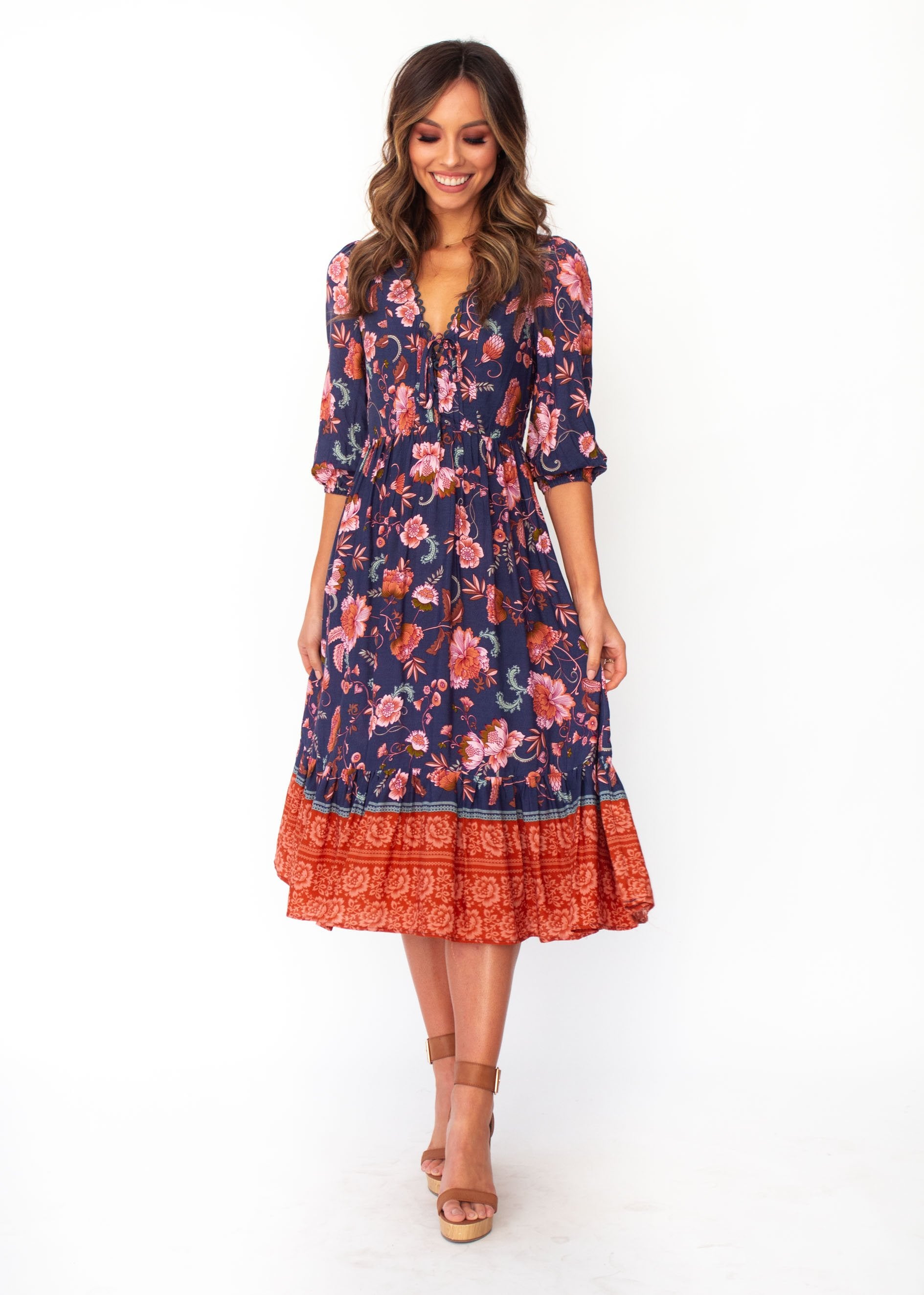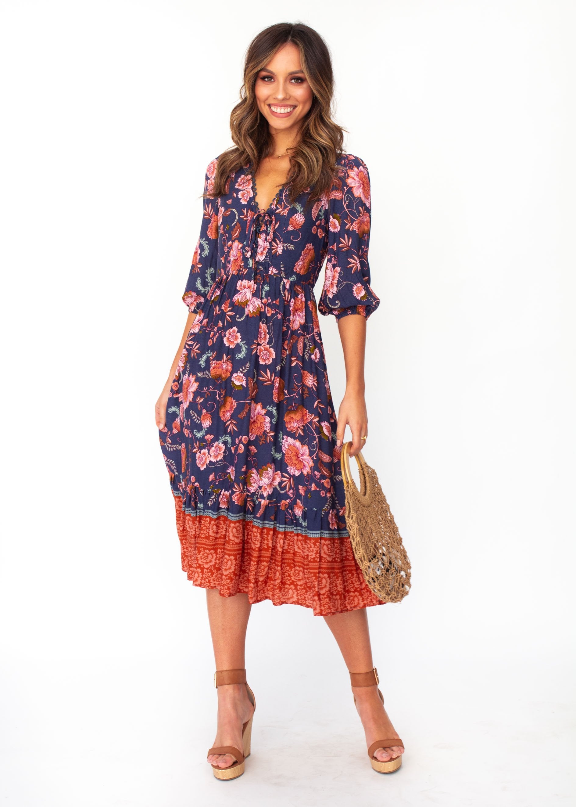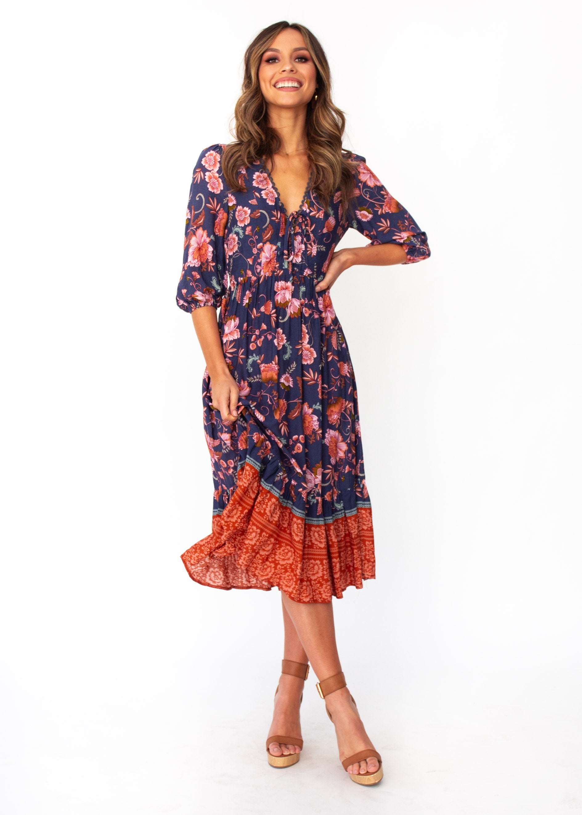 You'll fall in love with the midi dress of the season in a gorgeous navy/blush floral print, perfect for Autumn.