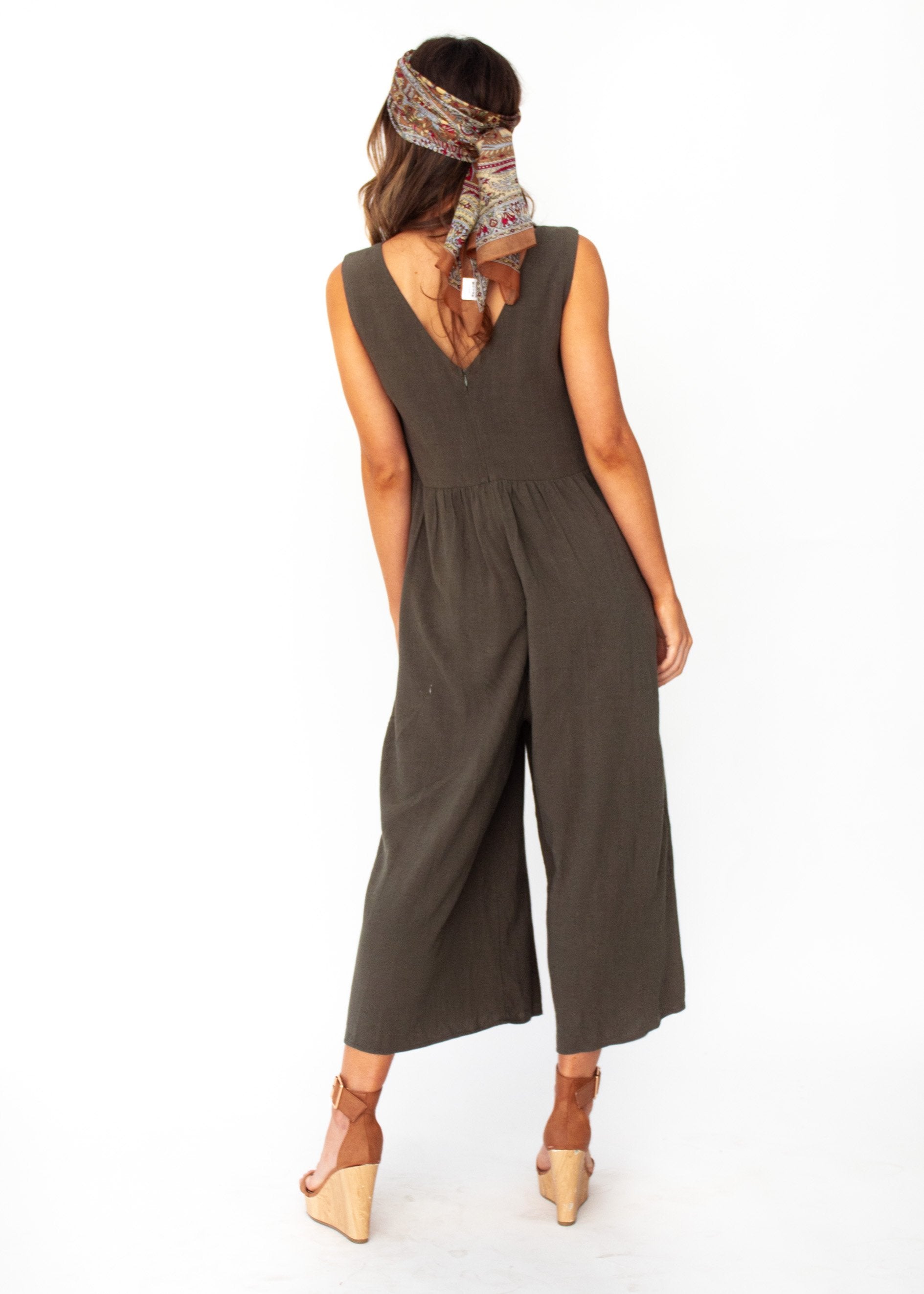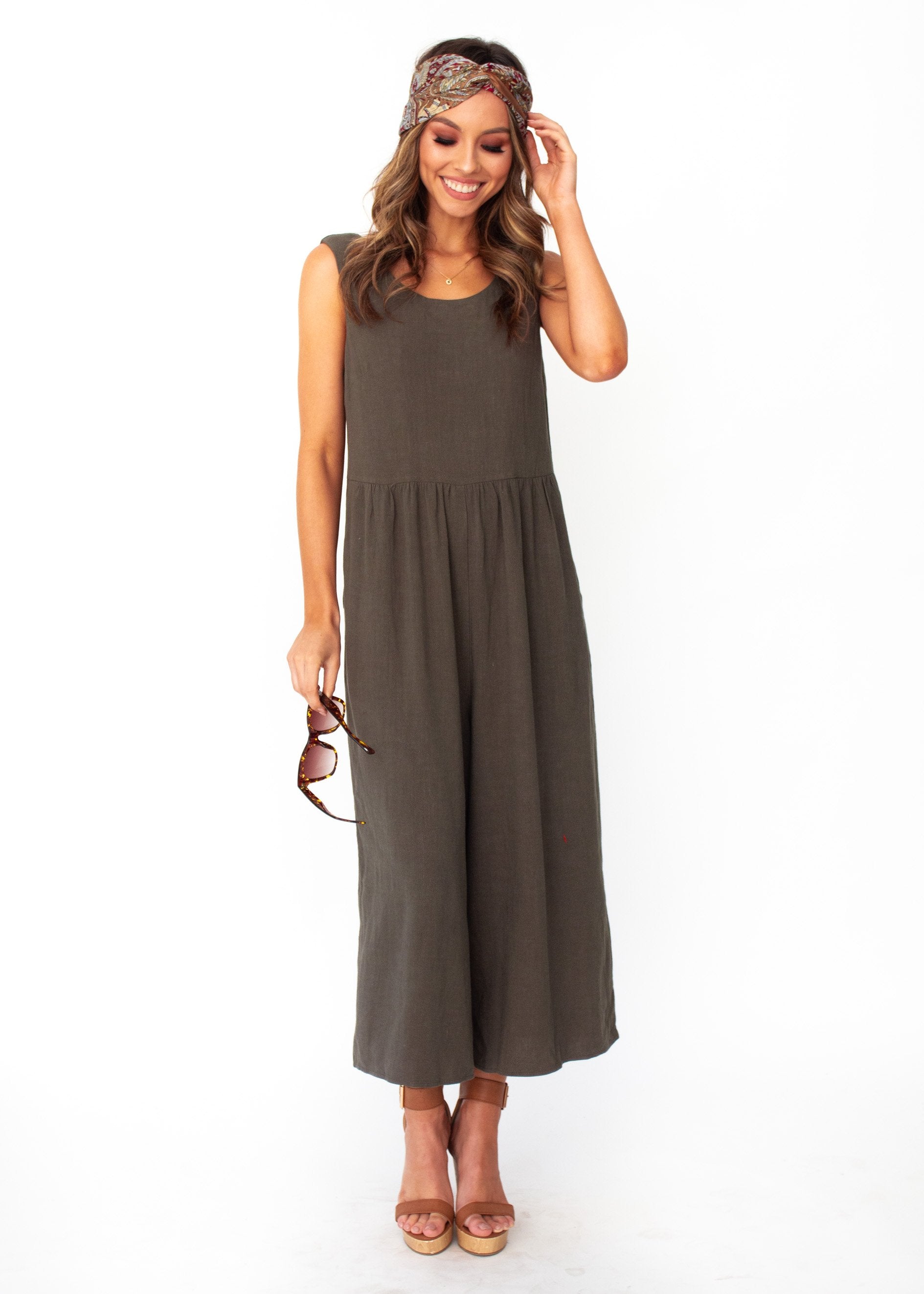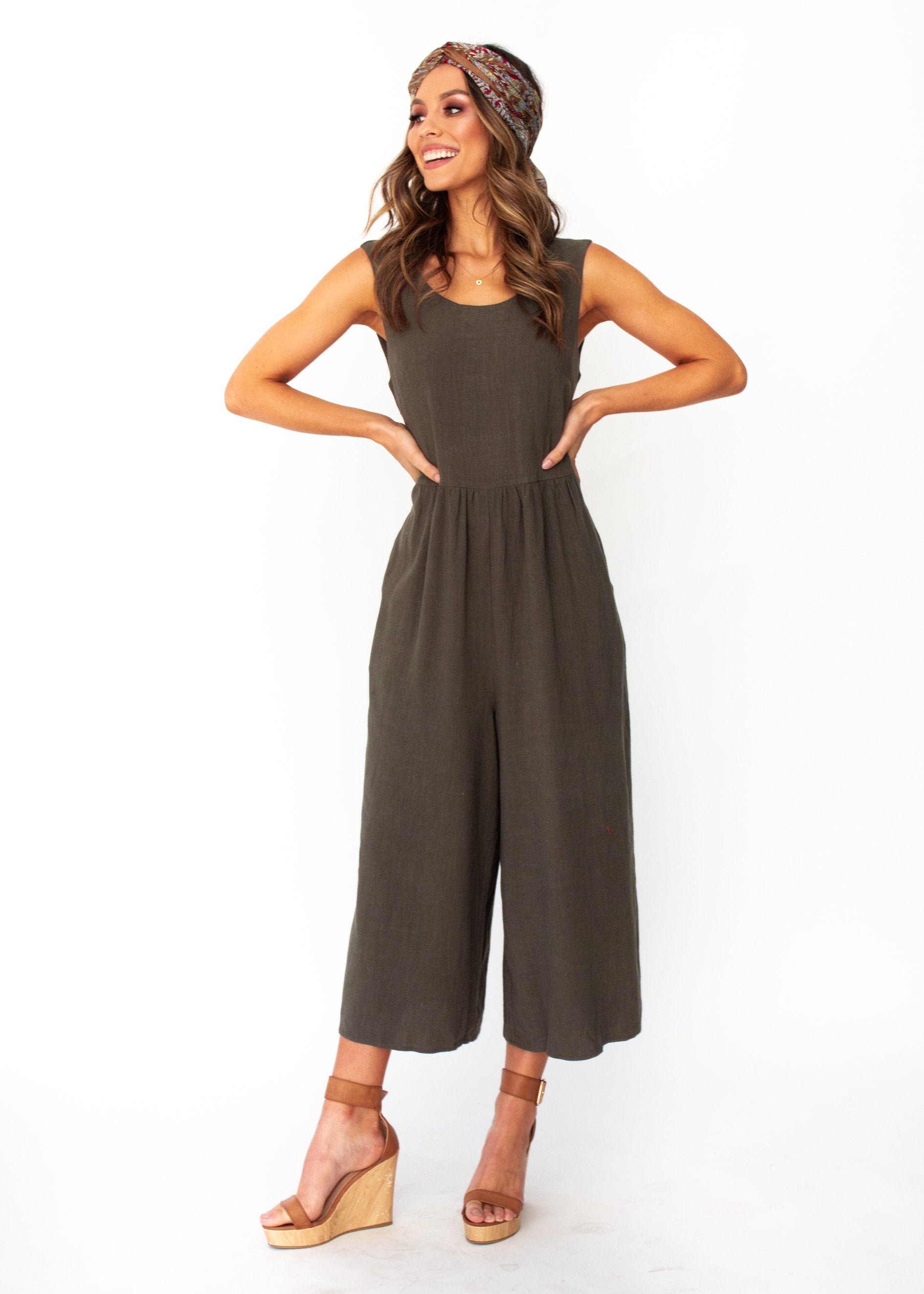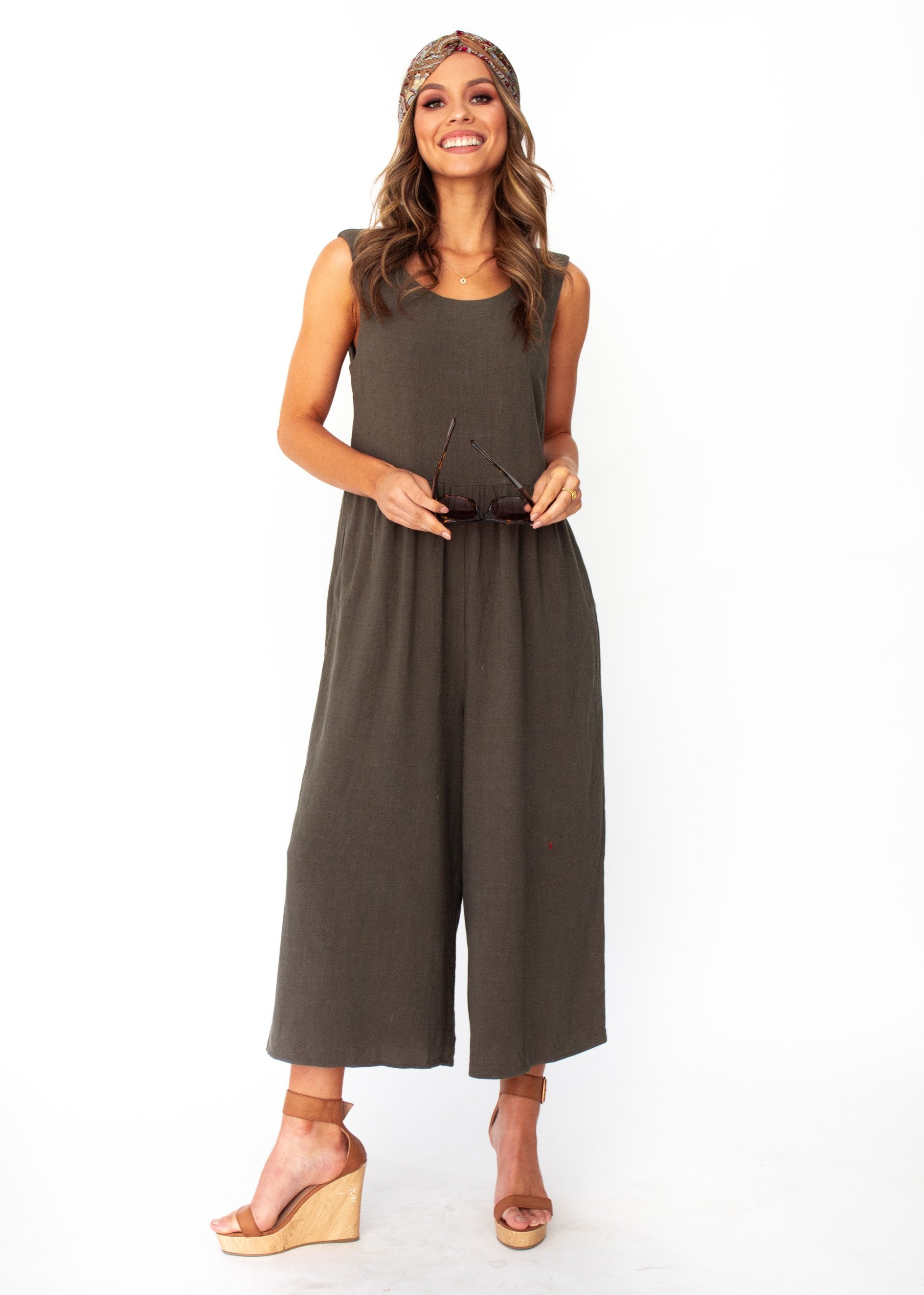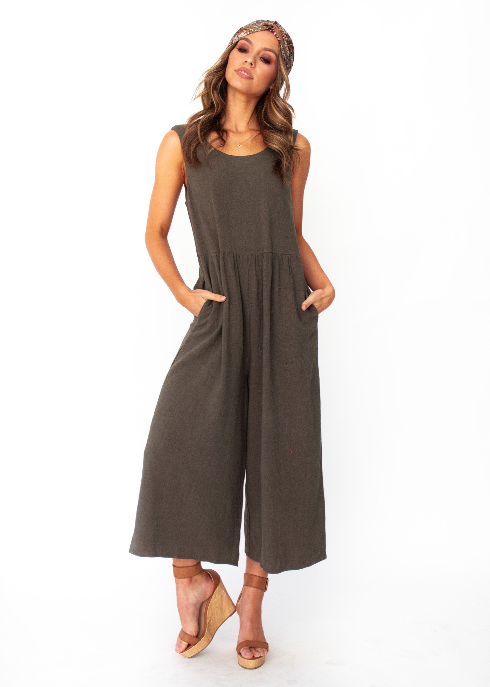 Linen Perfection! This khaki piece will be your go to pantsuit this season. A relaxed, casual feel ideal for a day at the beach, that can also be dressed up with a gorgeous pair of heels for your next event.