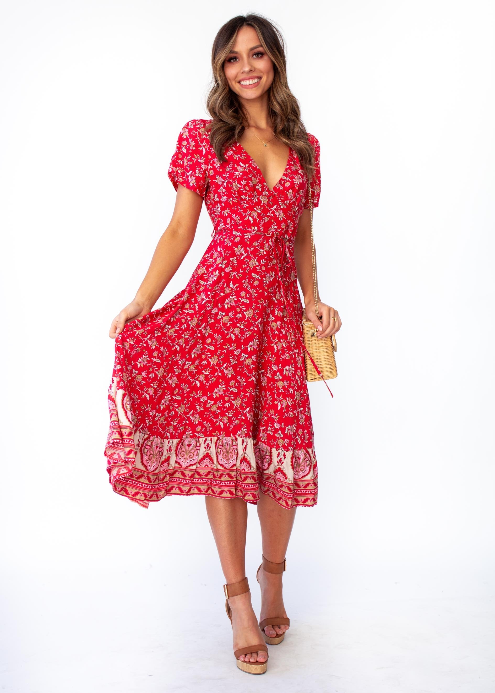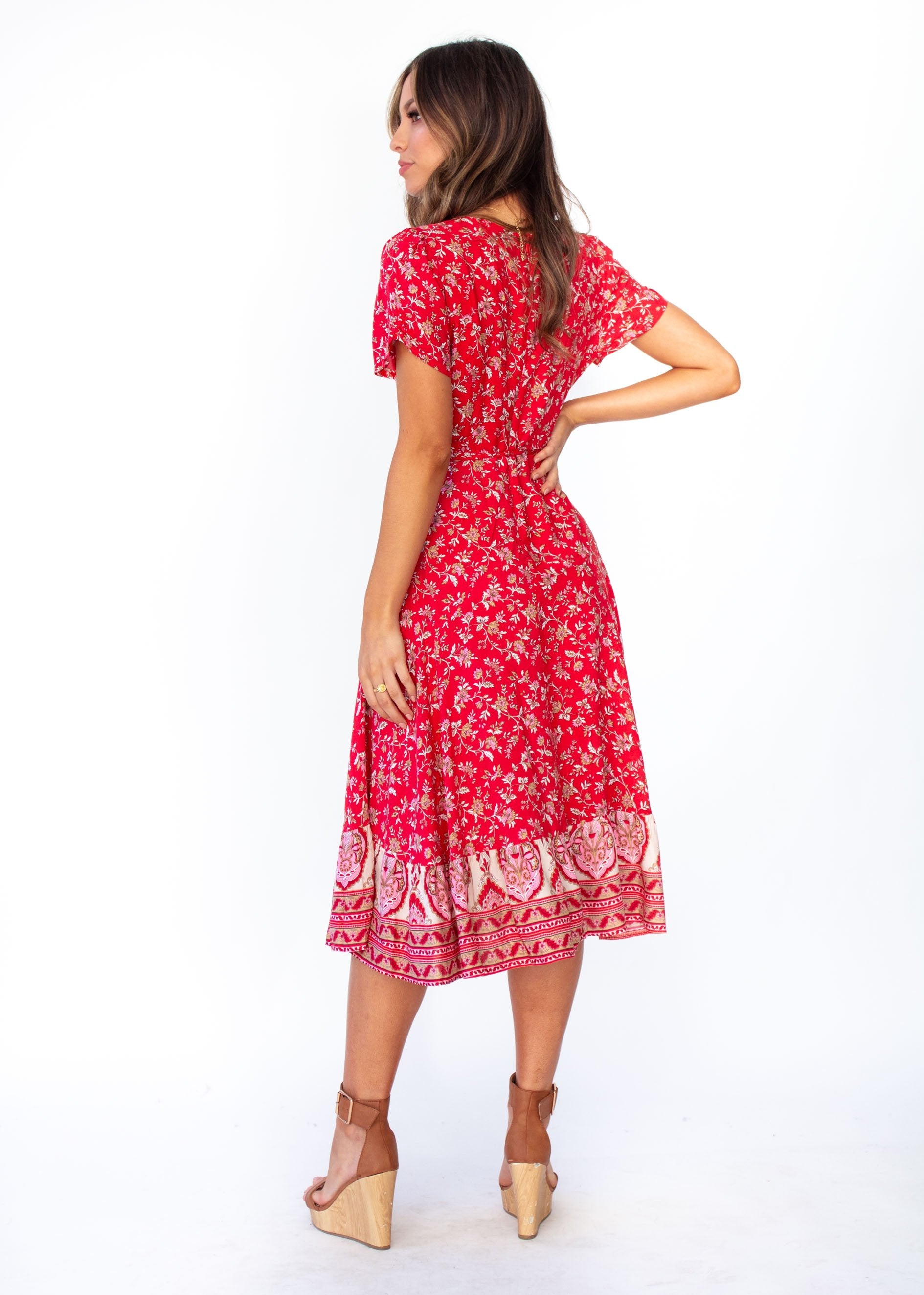Our gorgeous Mumabi red floral print is back again in this gorgeous midi dress. Made to flatter all the right places, this easy-to-wear midi will be your favourite instantly.