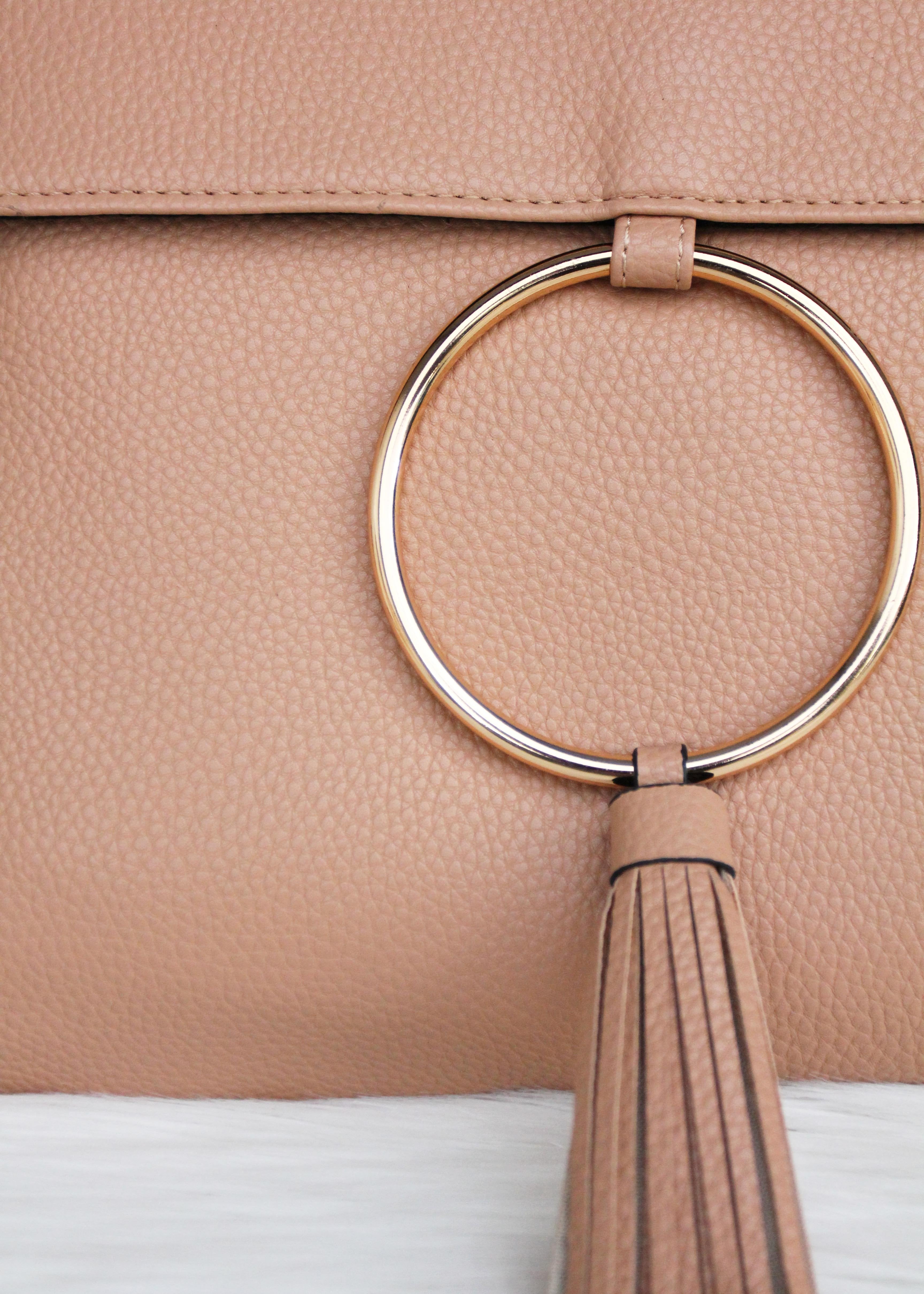 Your new favourite clutch has arrived. This oversized beauty features a polished gold coloured metal ring detail, from tassel and magnetic closure for easy access.