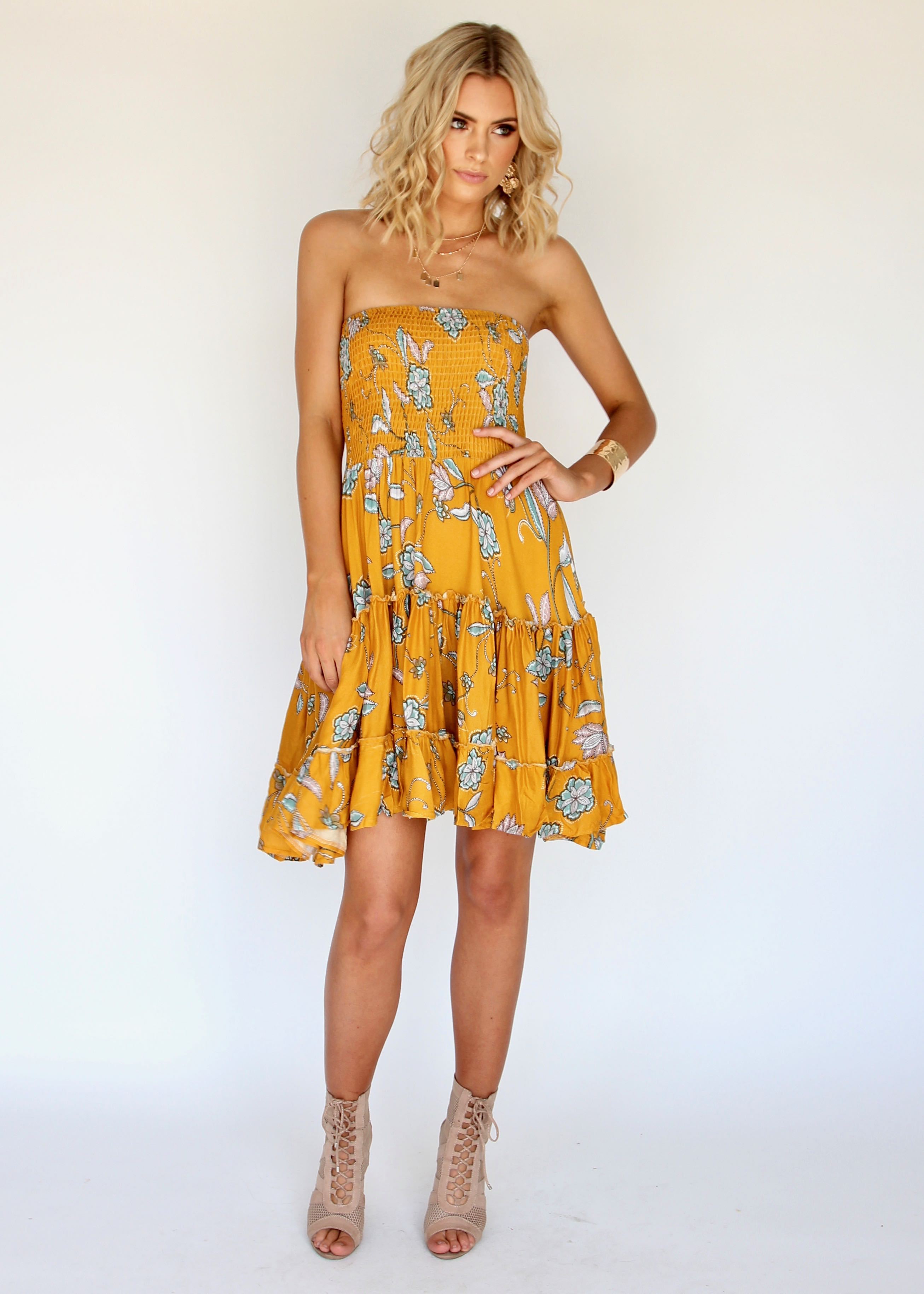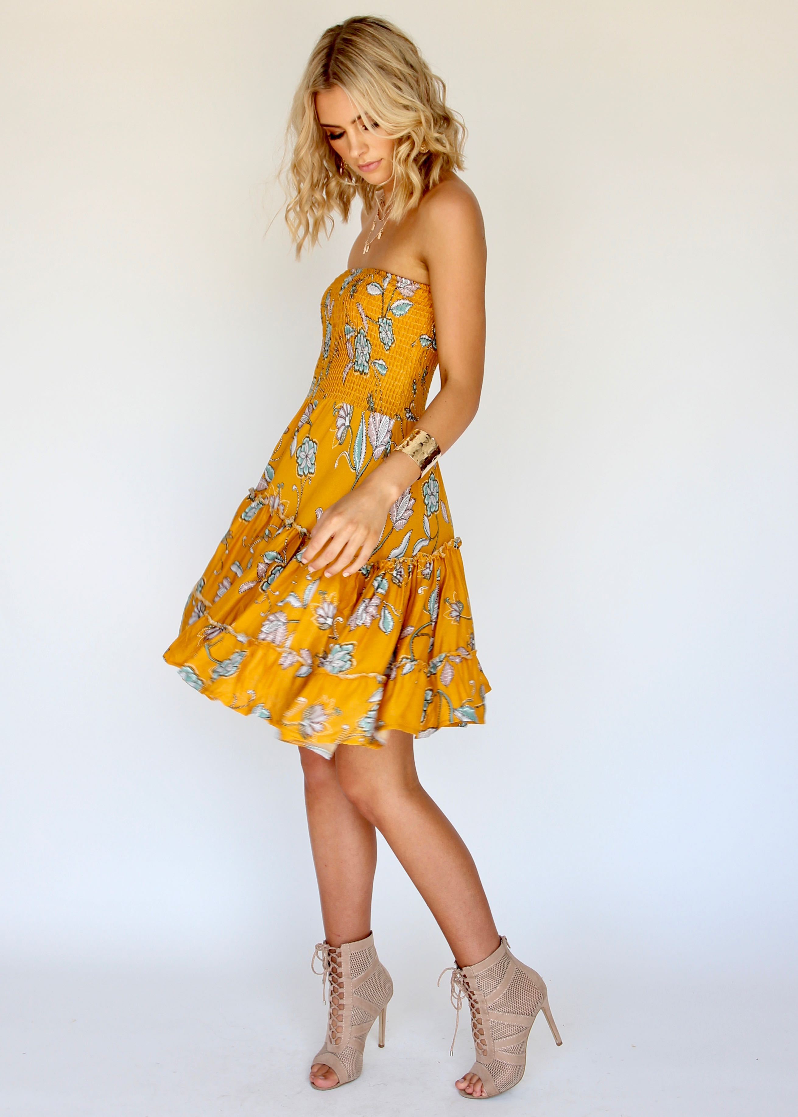 Summer has never looked so good! A fun and easy to wear strapless dress, in a gorgeous deep yellow print. Perfect for those sunny days! A shorter version to our best selling Salsa Strapless Maxi Dress.