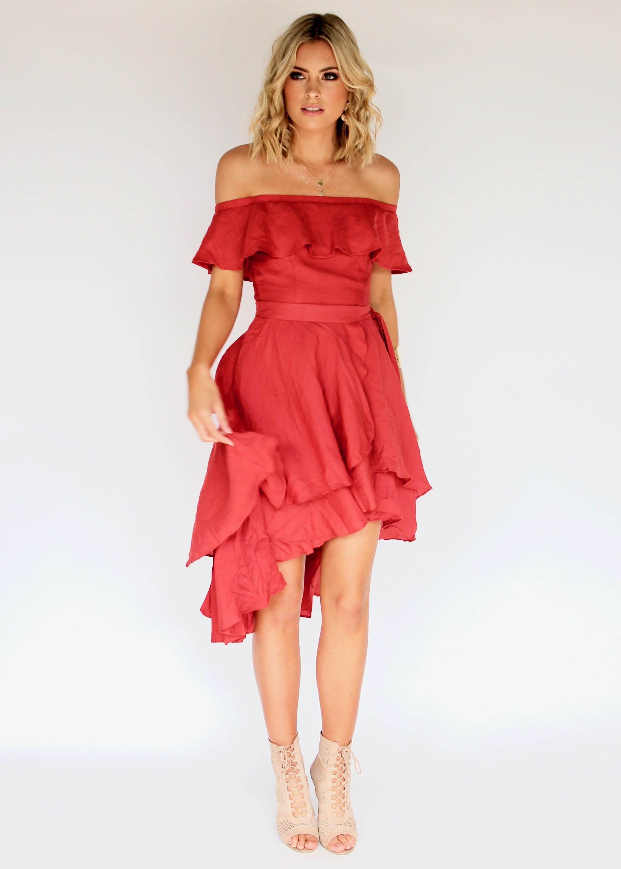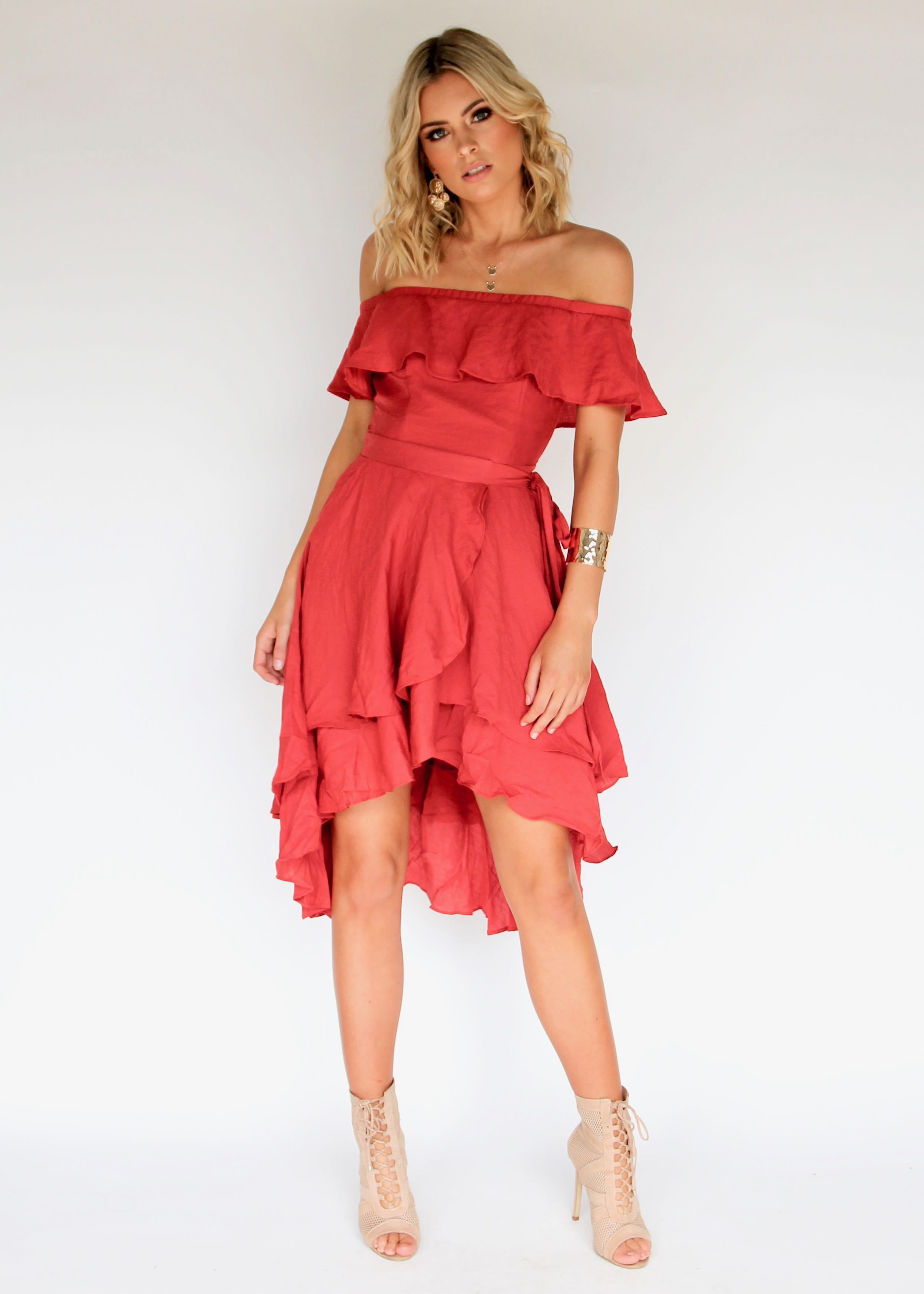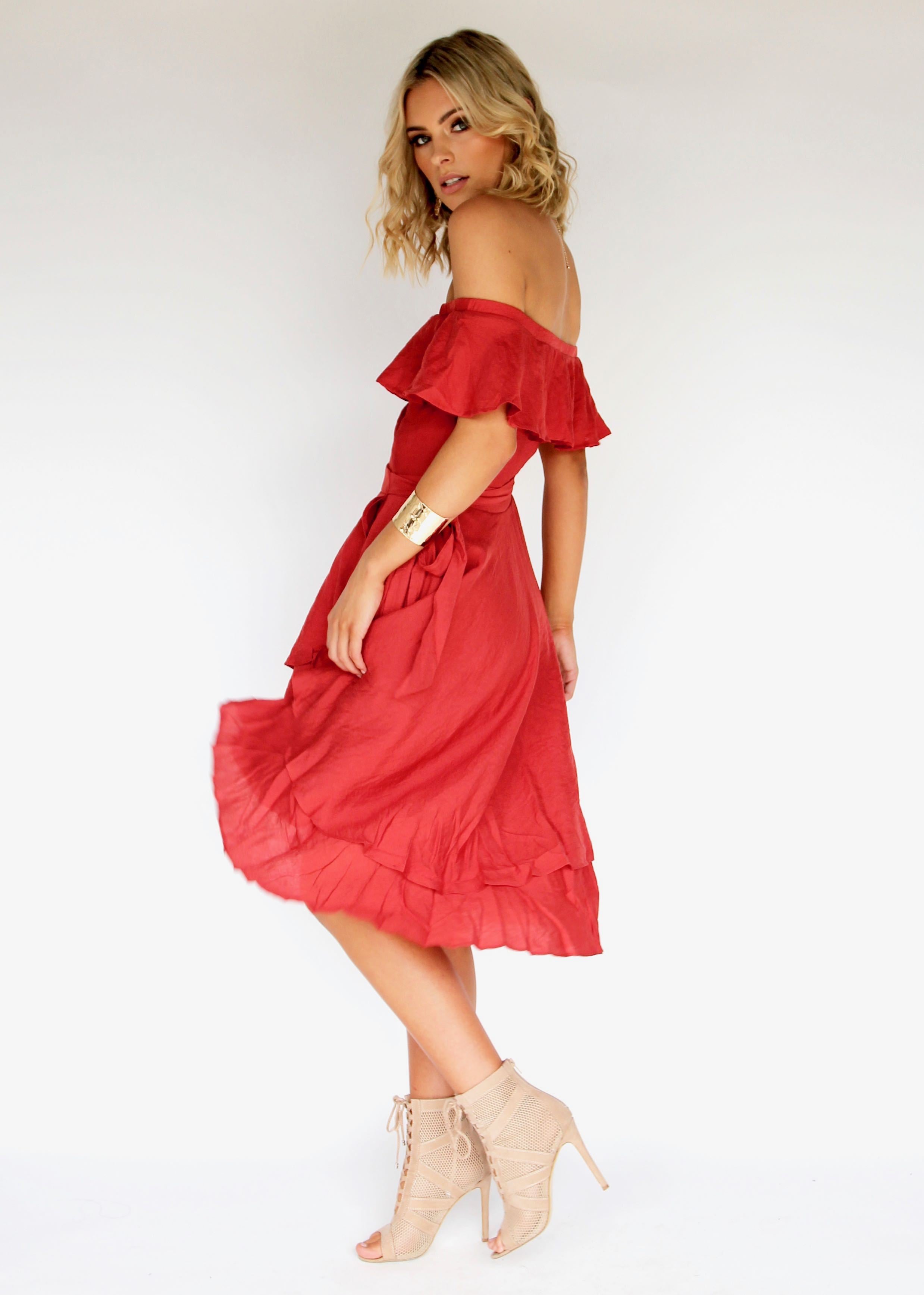 Nothing screams Summer quite like our Senorita Dress! A beautiful off shoulder mid length dress in a head-turning crimson. The perfect addition to your wardrobe, and your new fave going out dress.