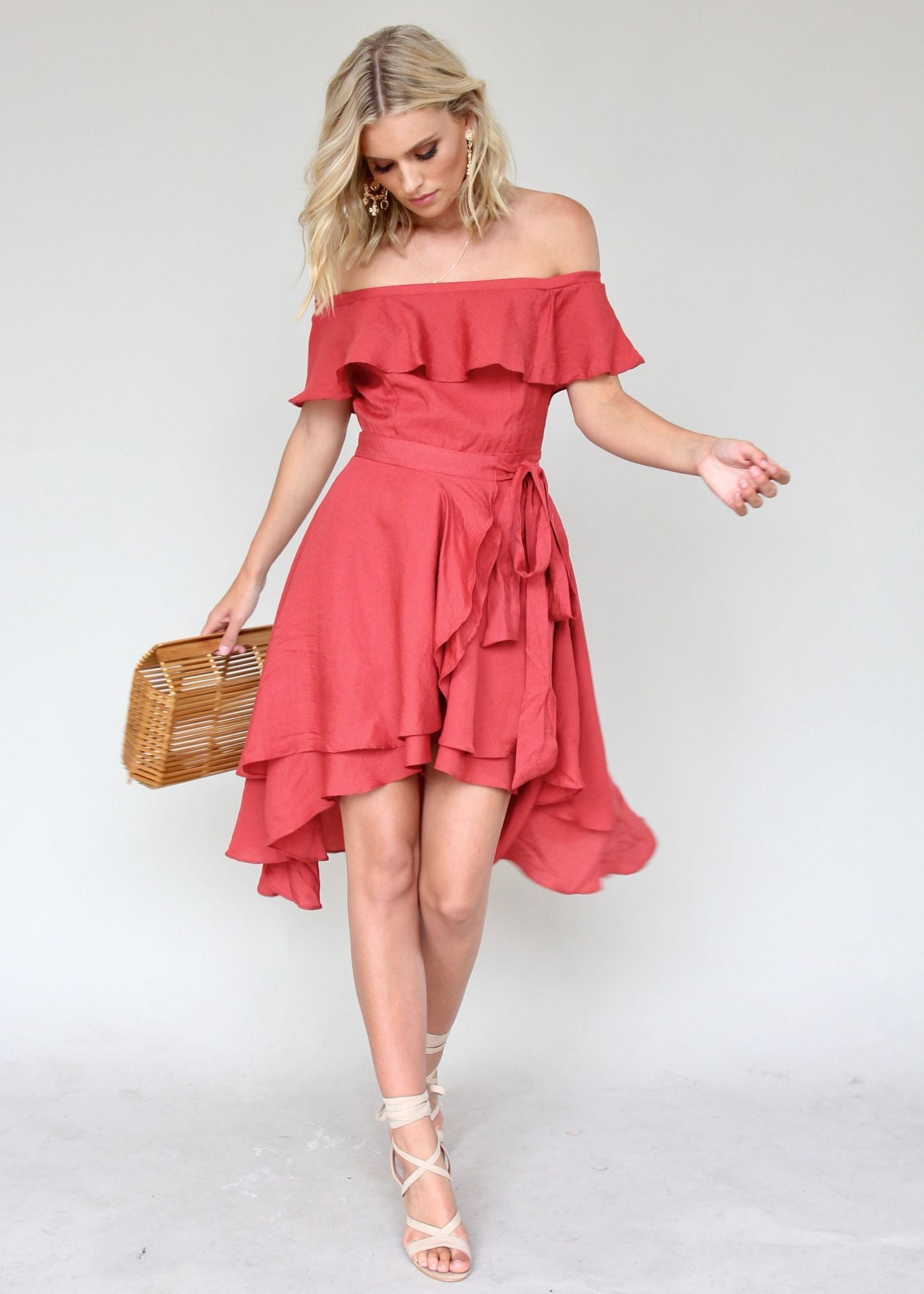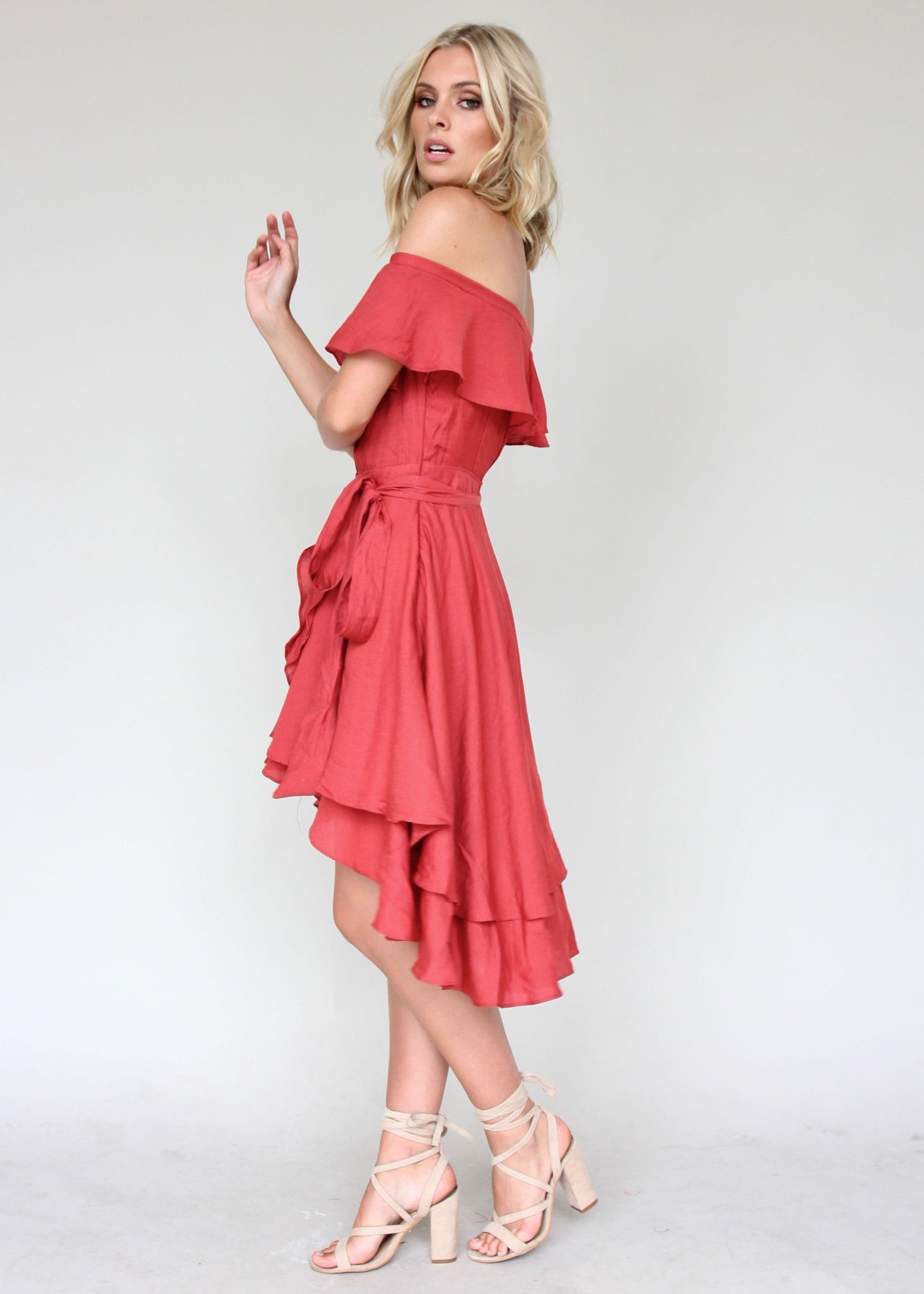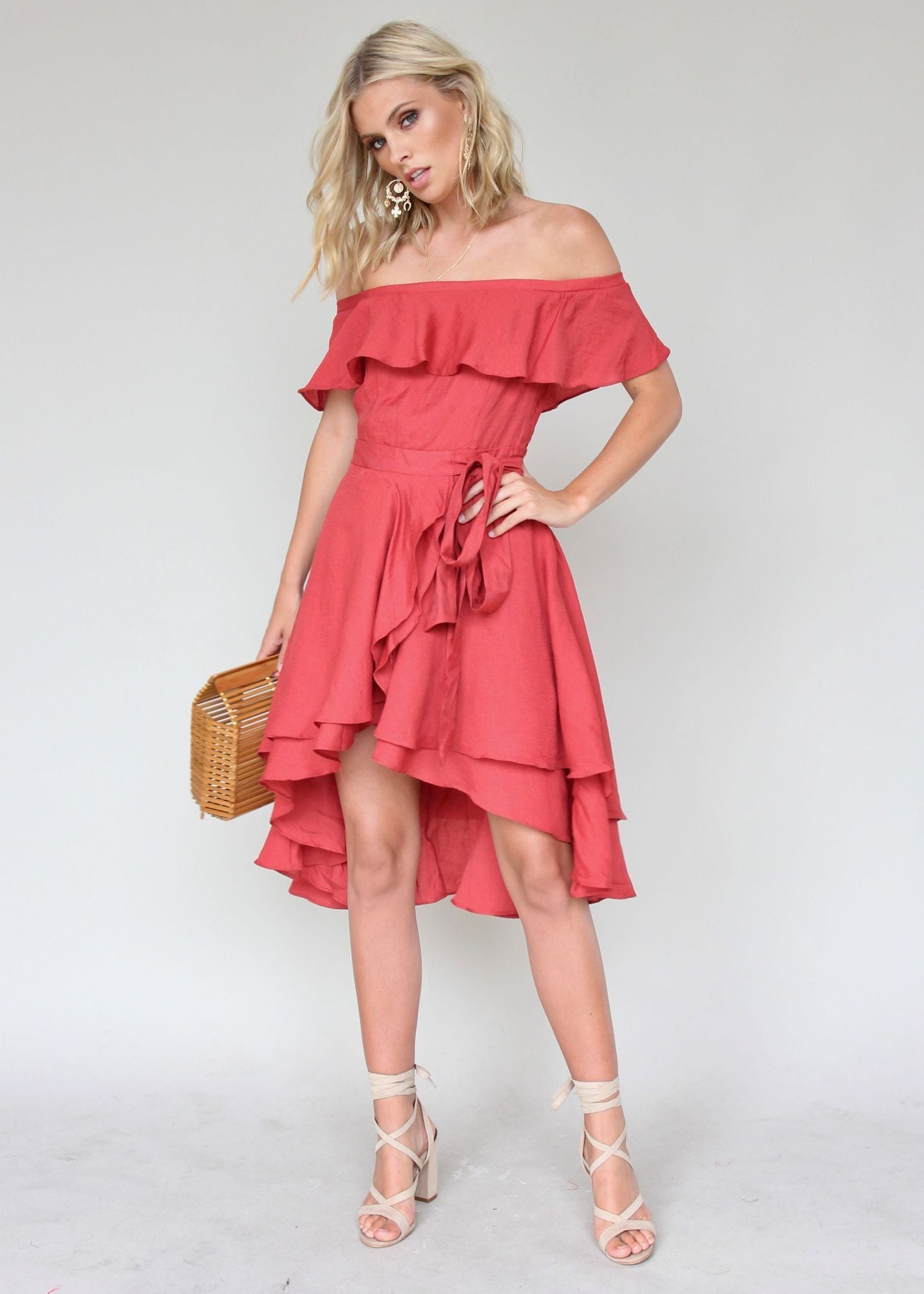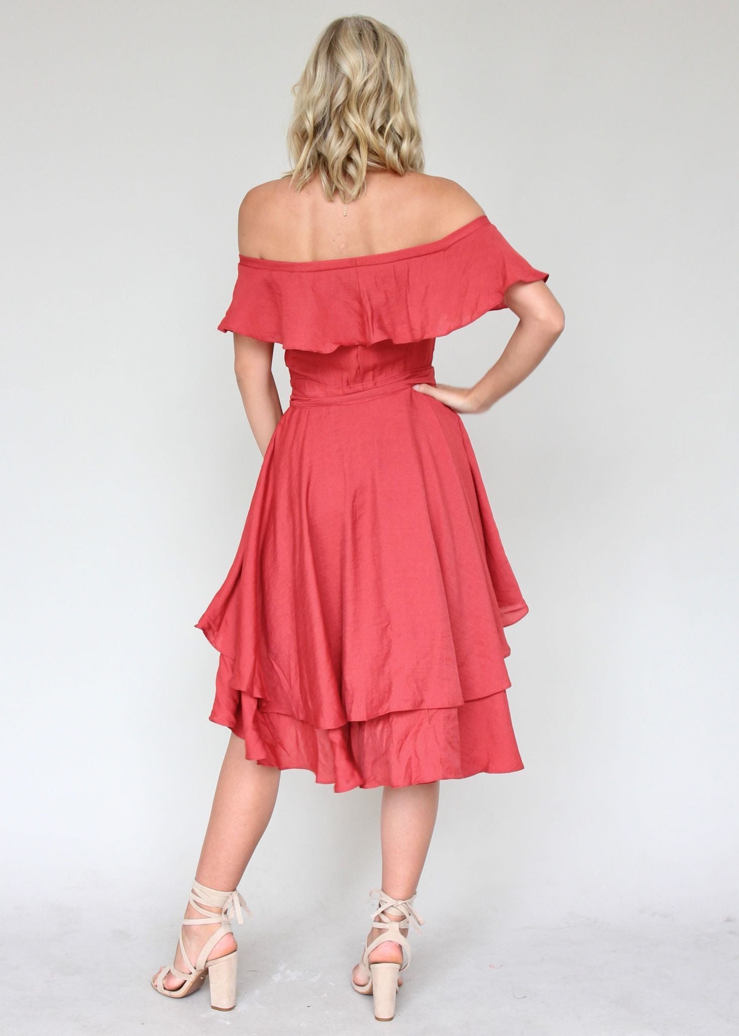 Nothing screams Summer quite like our Senorita Dress! A beautiful off shoulder mid length dress in a head-turning crimson. The perfect addition to your wardrobe, and your new fave going out dress.