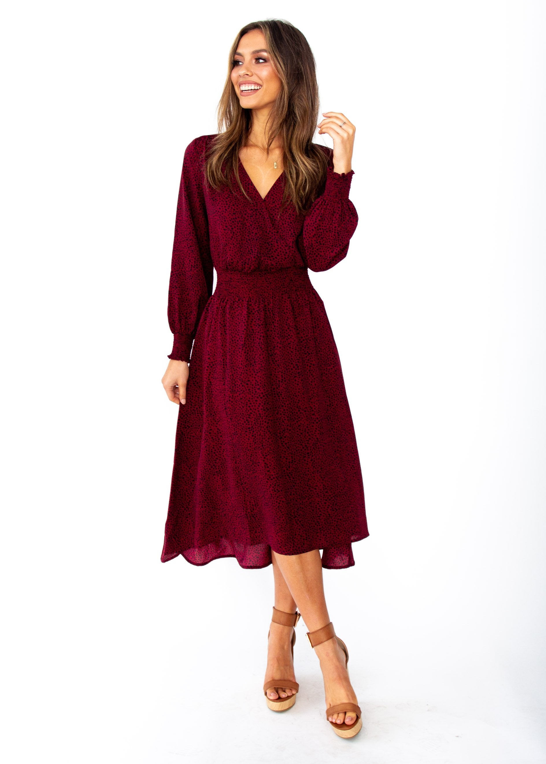 Flaunt this gorgeous midi dress all season long! The perfect style for this season, this wine spot printed midi will have you looking and feeling great.